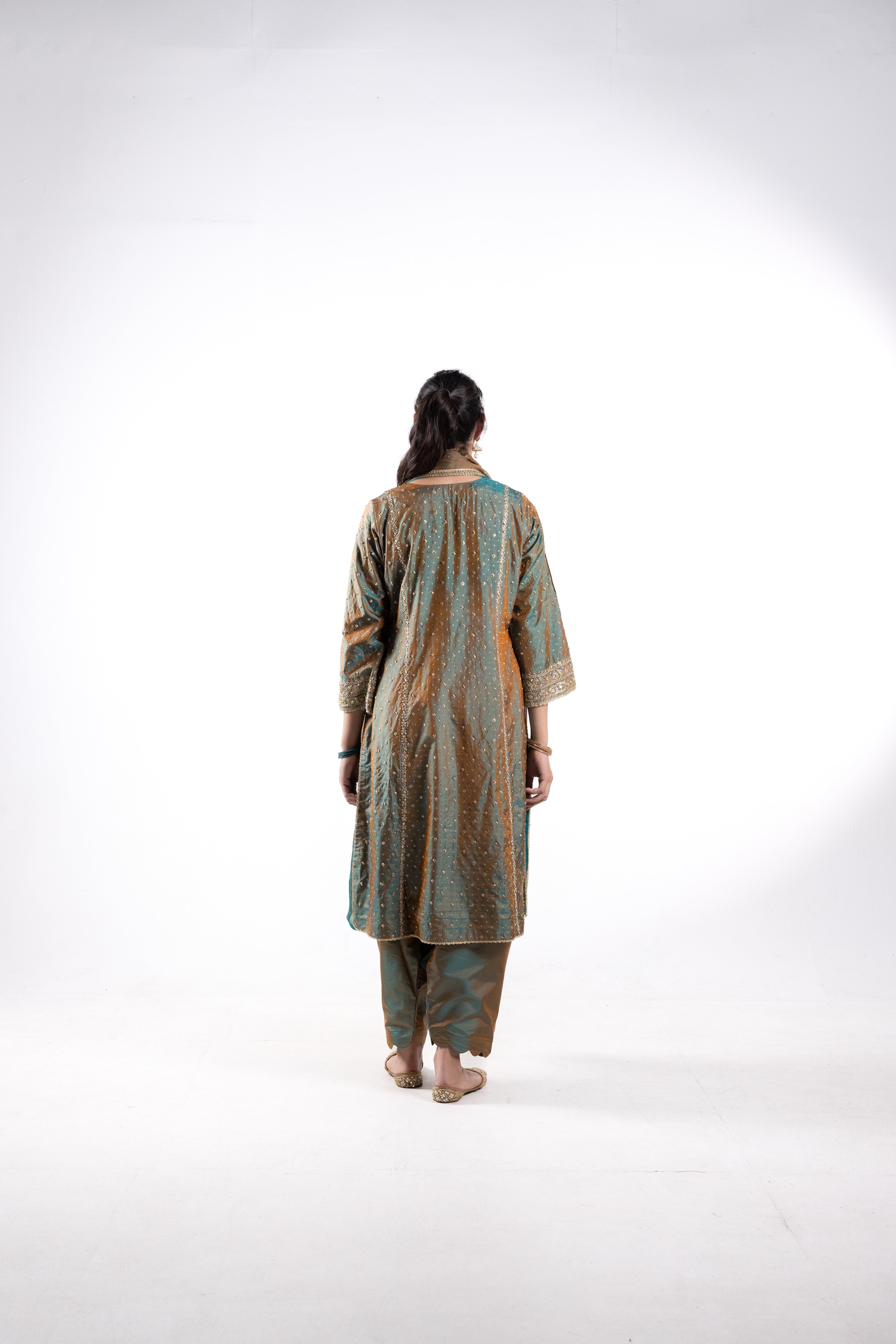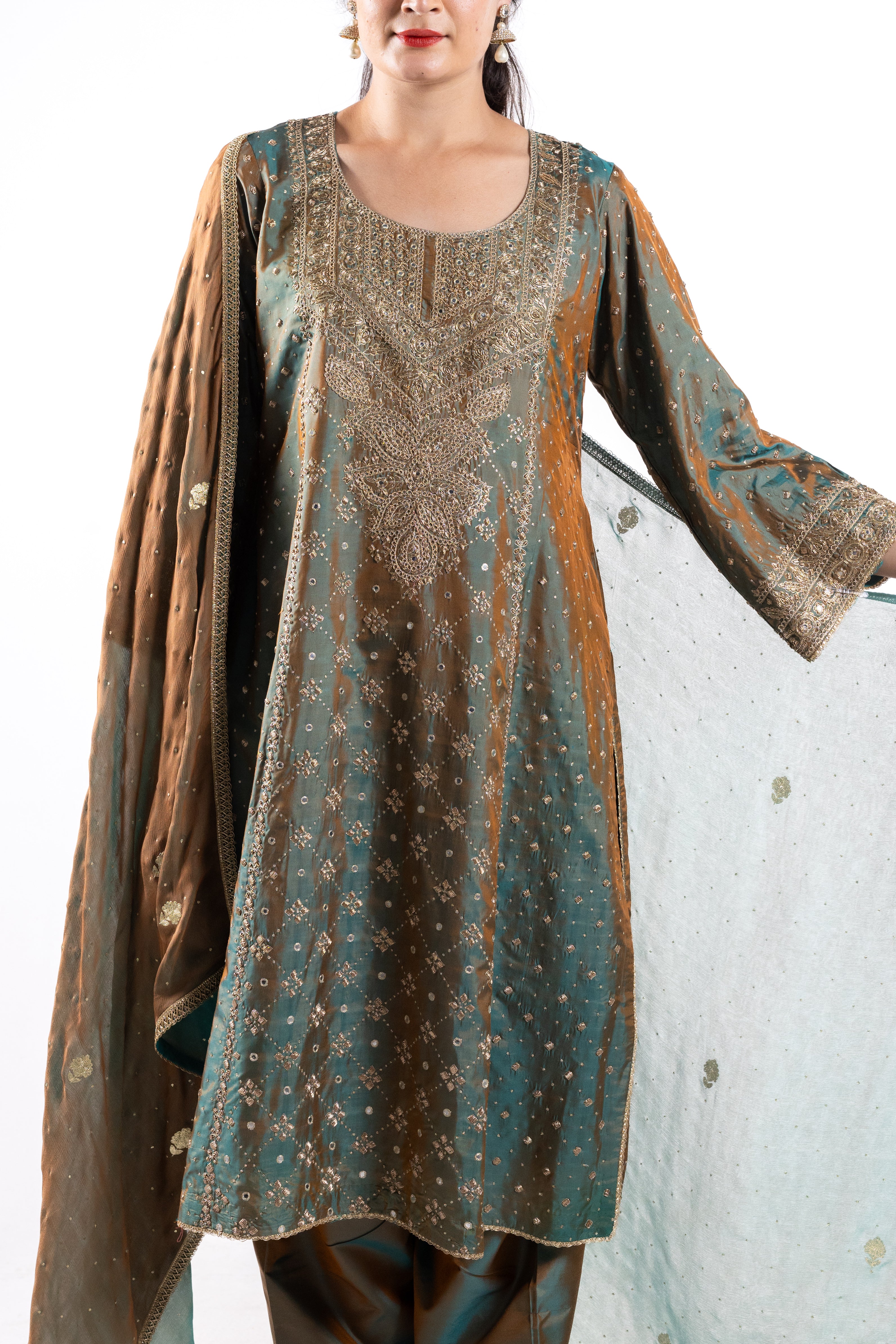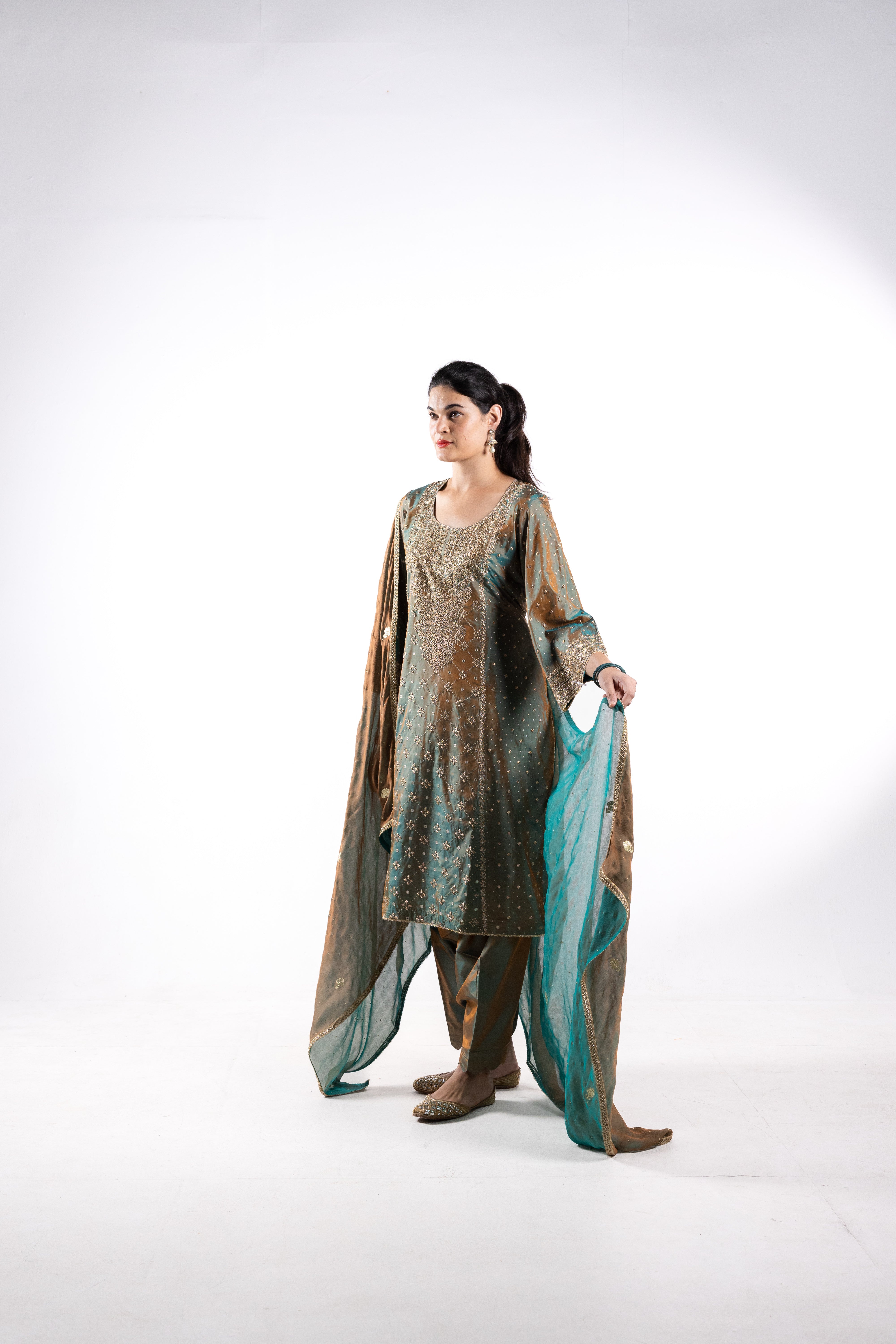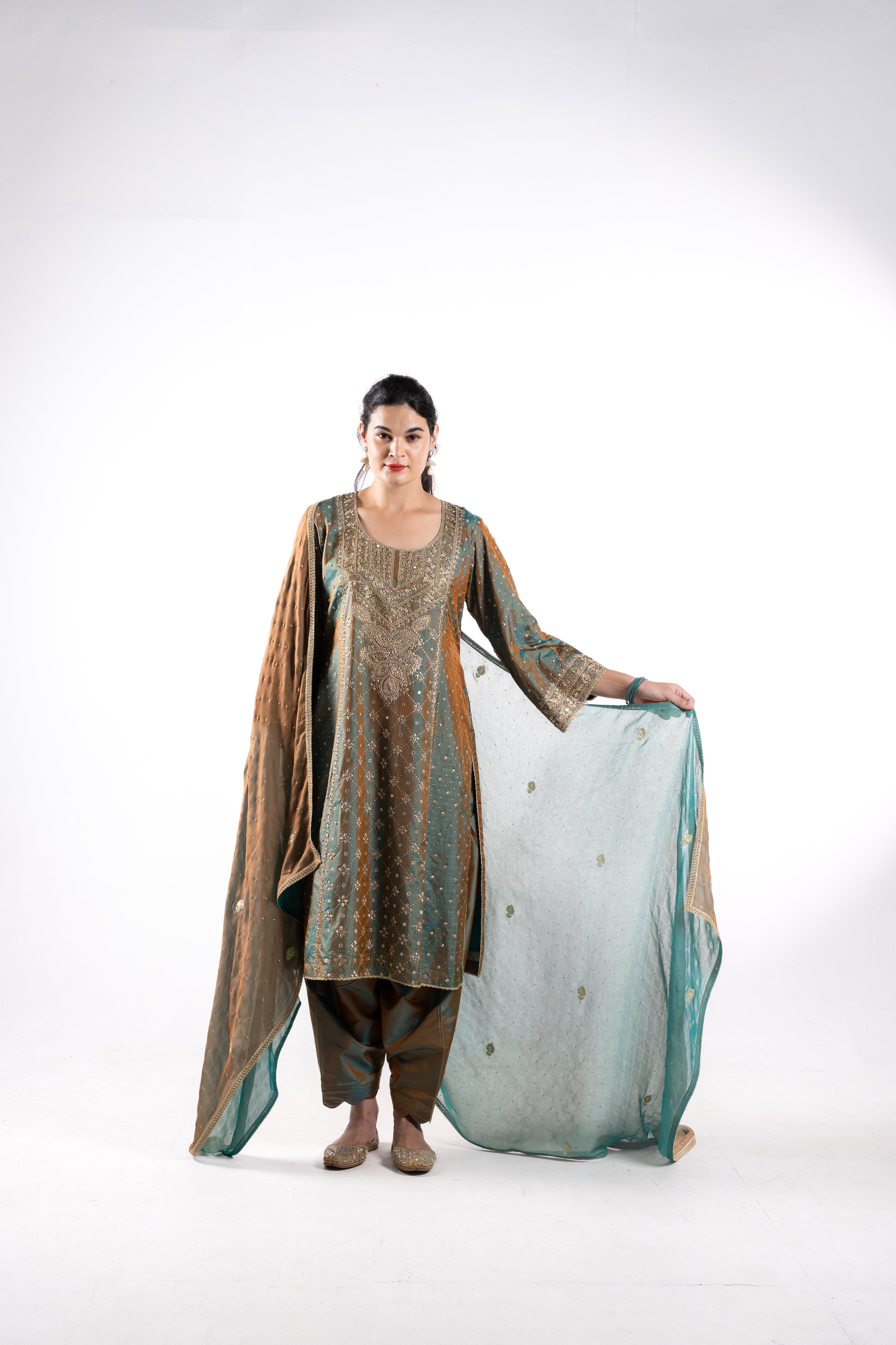 The Aaliyah suit is an expertly crafted, cross-coloured silk ensemble adorned with intricate Aari and Dabka embroidery. The antique work and scalloped Pakistani style salwar add to the traditional yet modern appeal of this piece. Paired with a double coloured Pure Chinnon chiffon dupatta, this suit is perfect for any occasion.