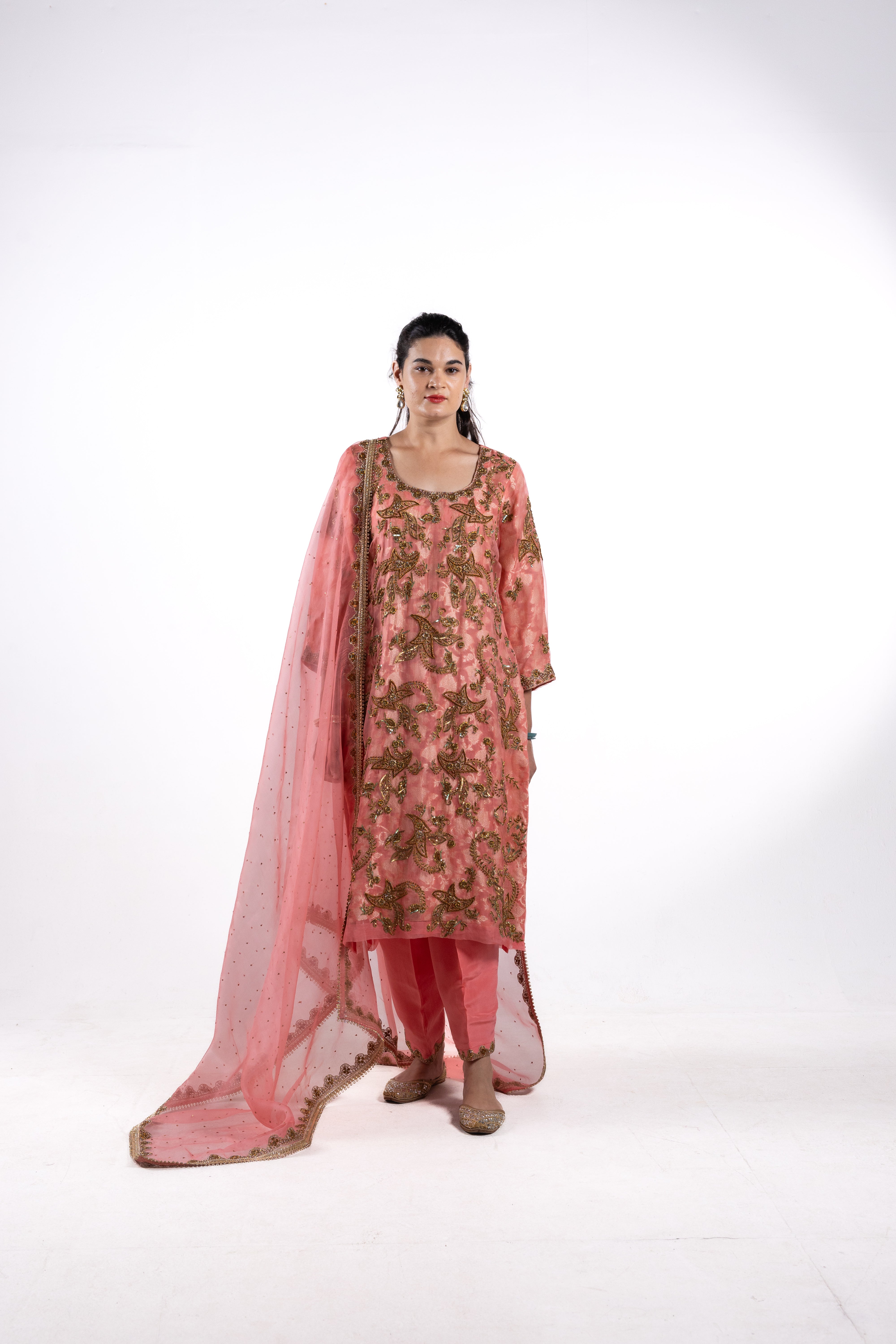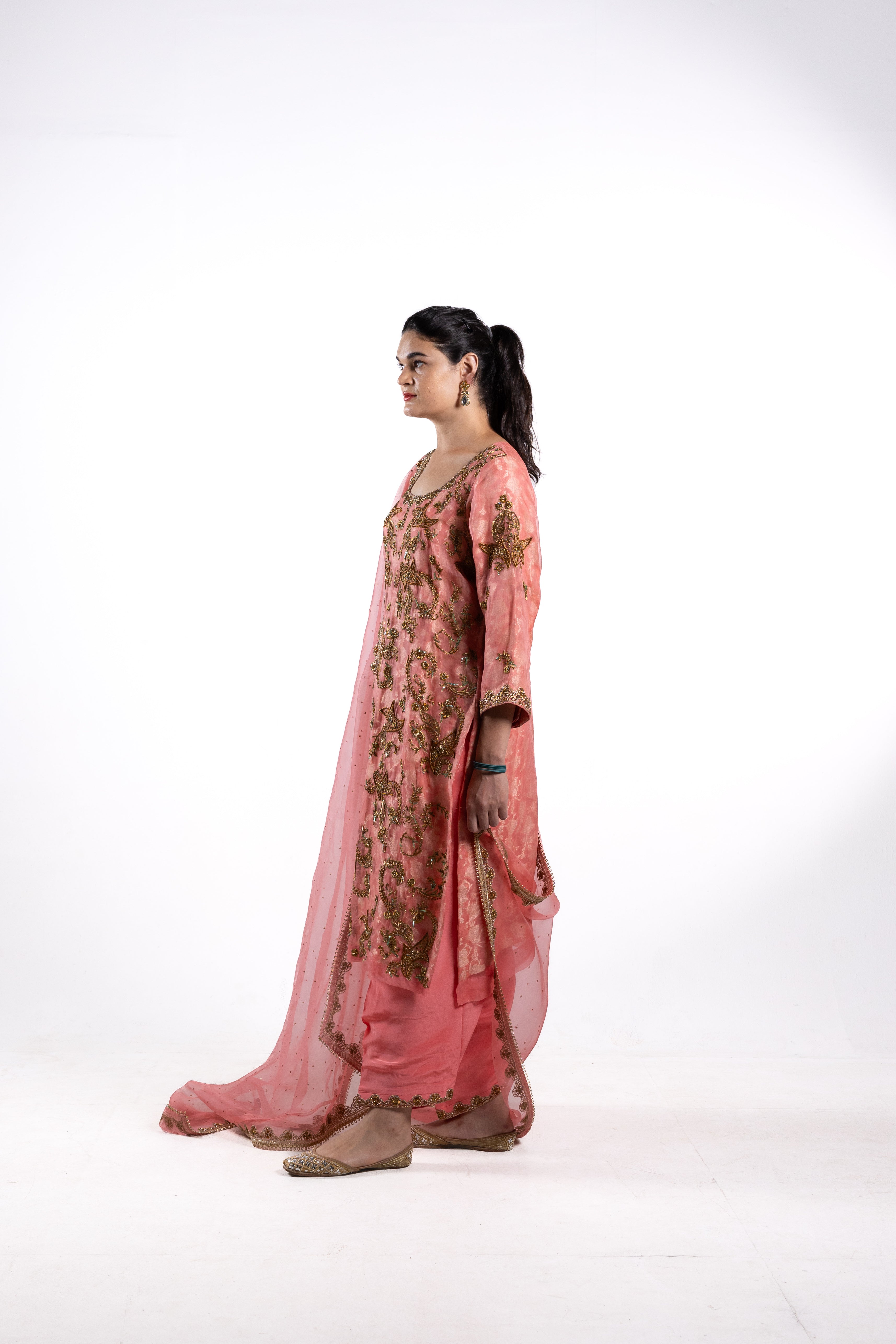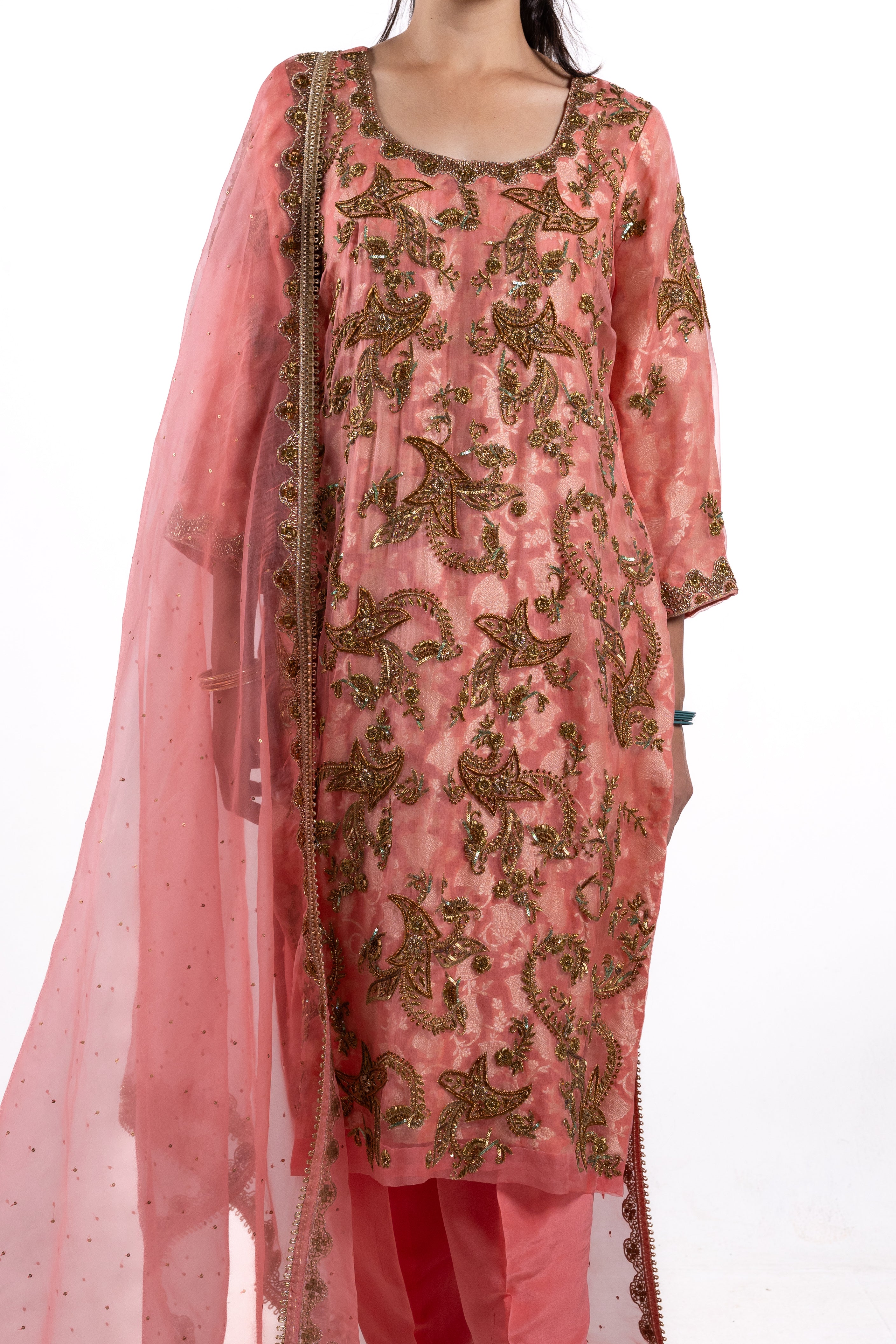 Discover the elegance of Adloka, a rose pink organza silk suit with banarsi lining. Adorned with antique hand work, this suit boasts an all over jaal design and delicate antique work on the dupatta. Elevate your style and make a statement with Adloka.
