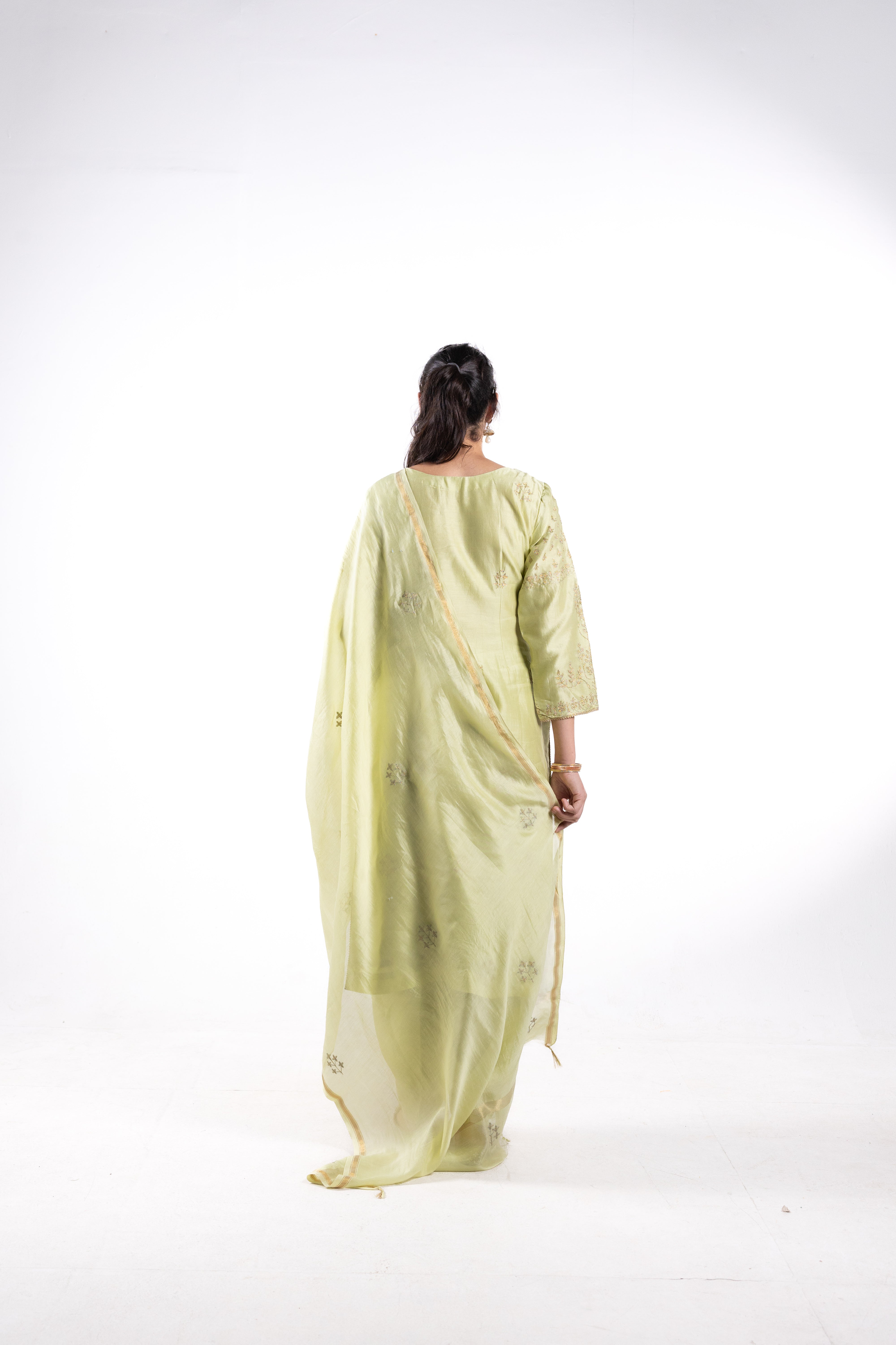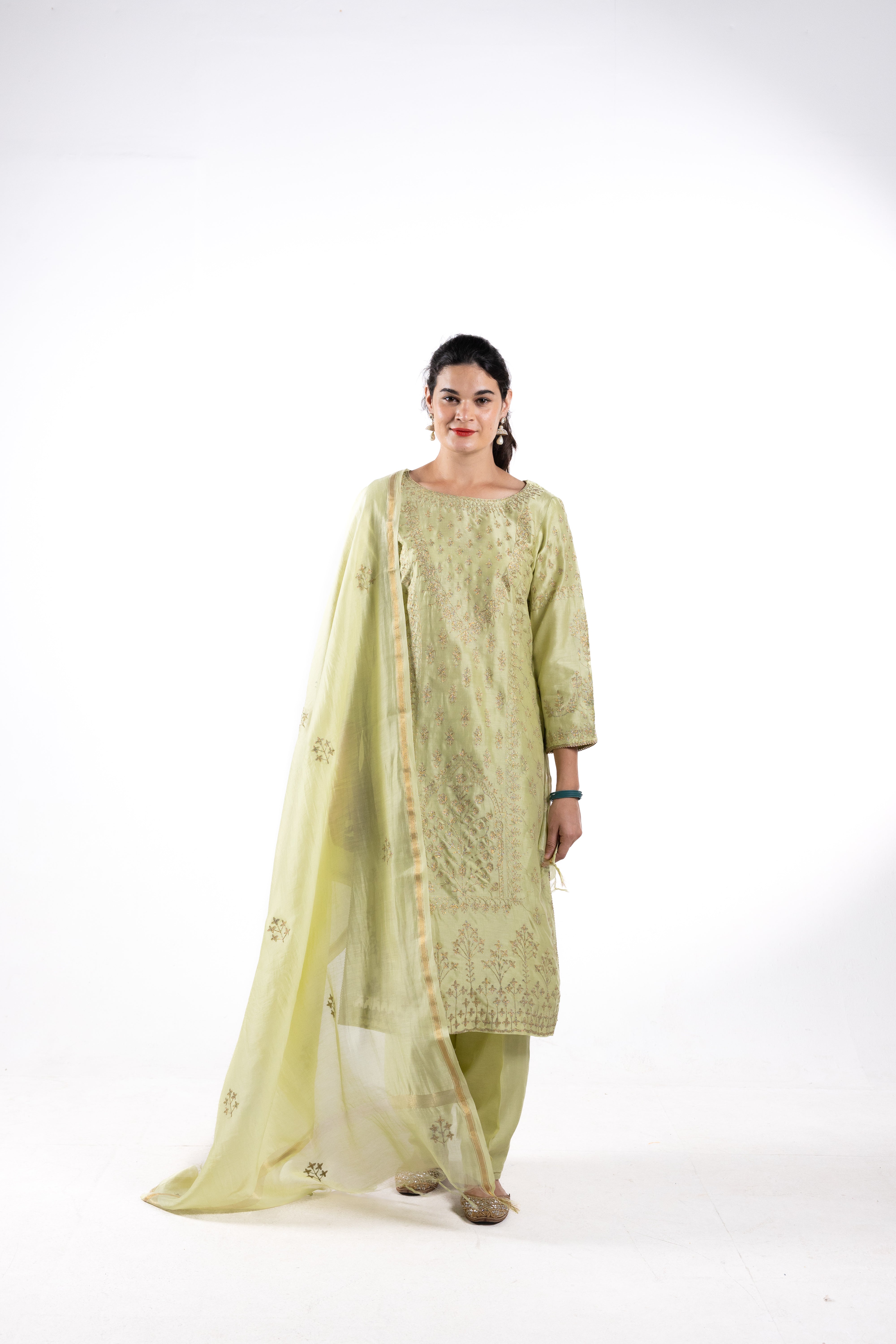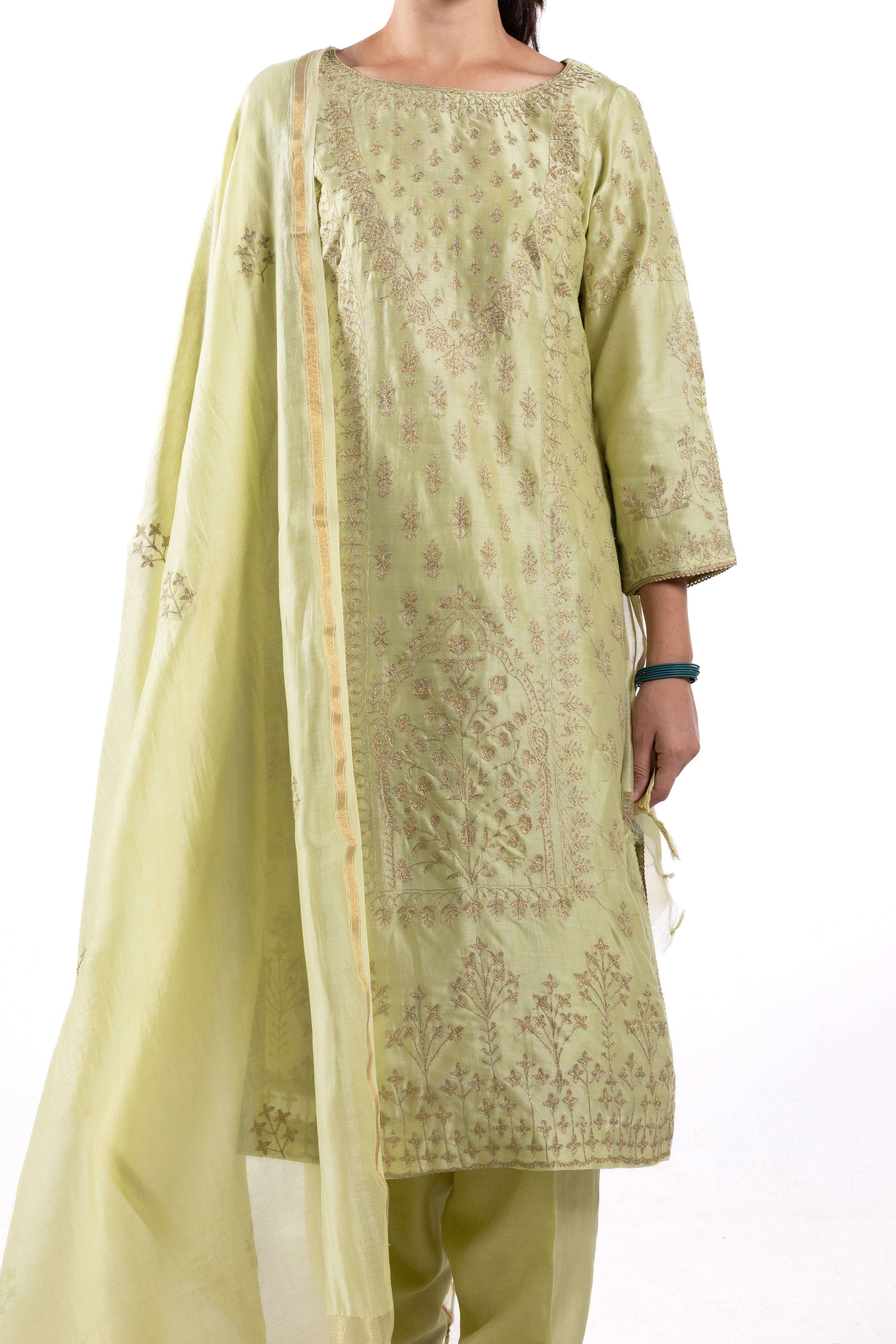 Expertly crafted from premium Chanderi silk, the Aida suit comes with a matching Chanderi dupatta. Adorned with intricate Aari work, featuring gold threads, this suit exudes elegance and luxury. Elevate your wardrobe with this timeless piece.