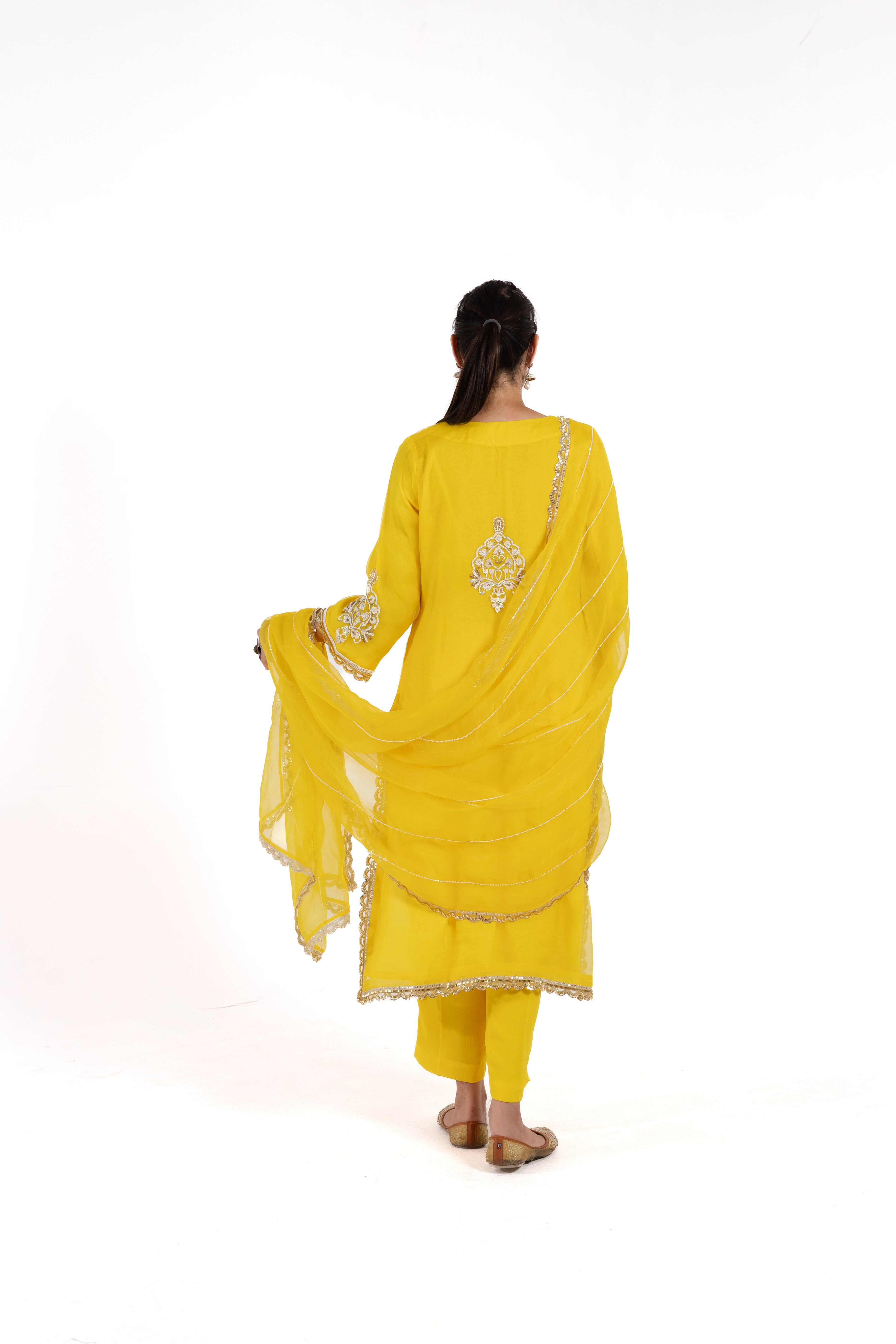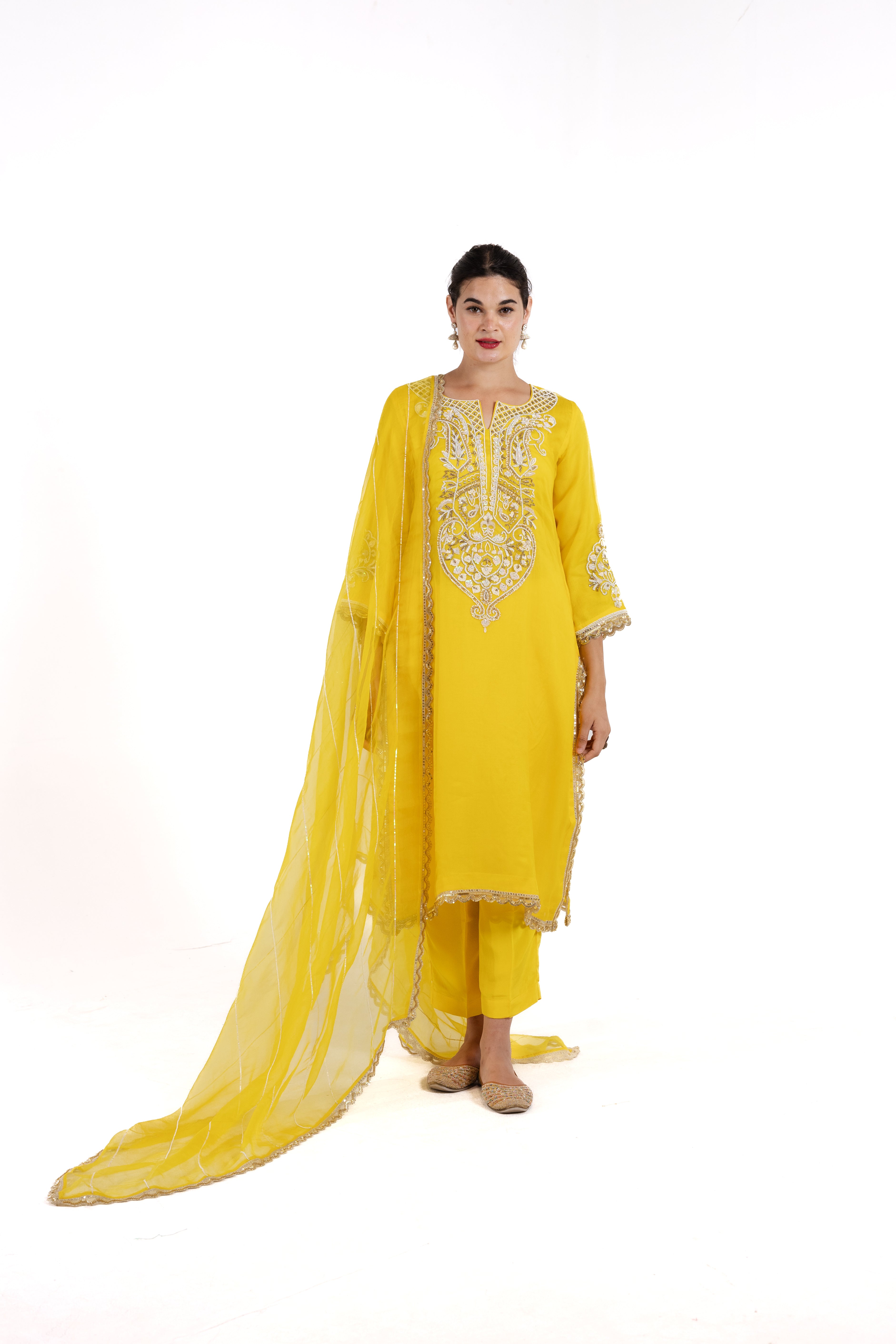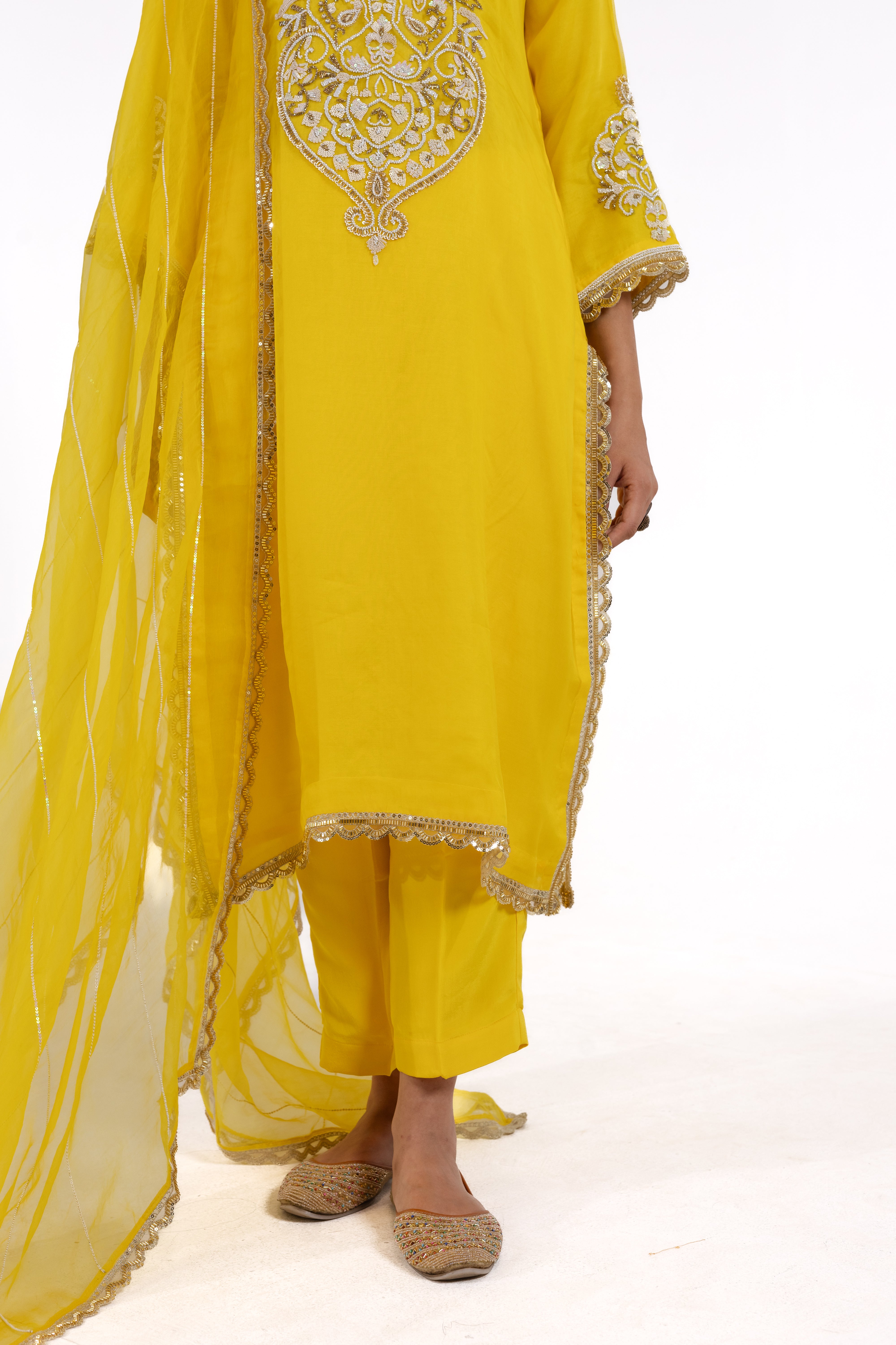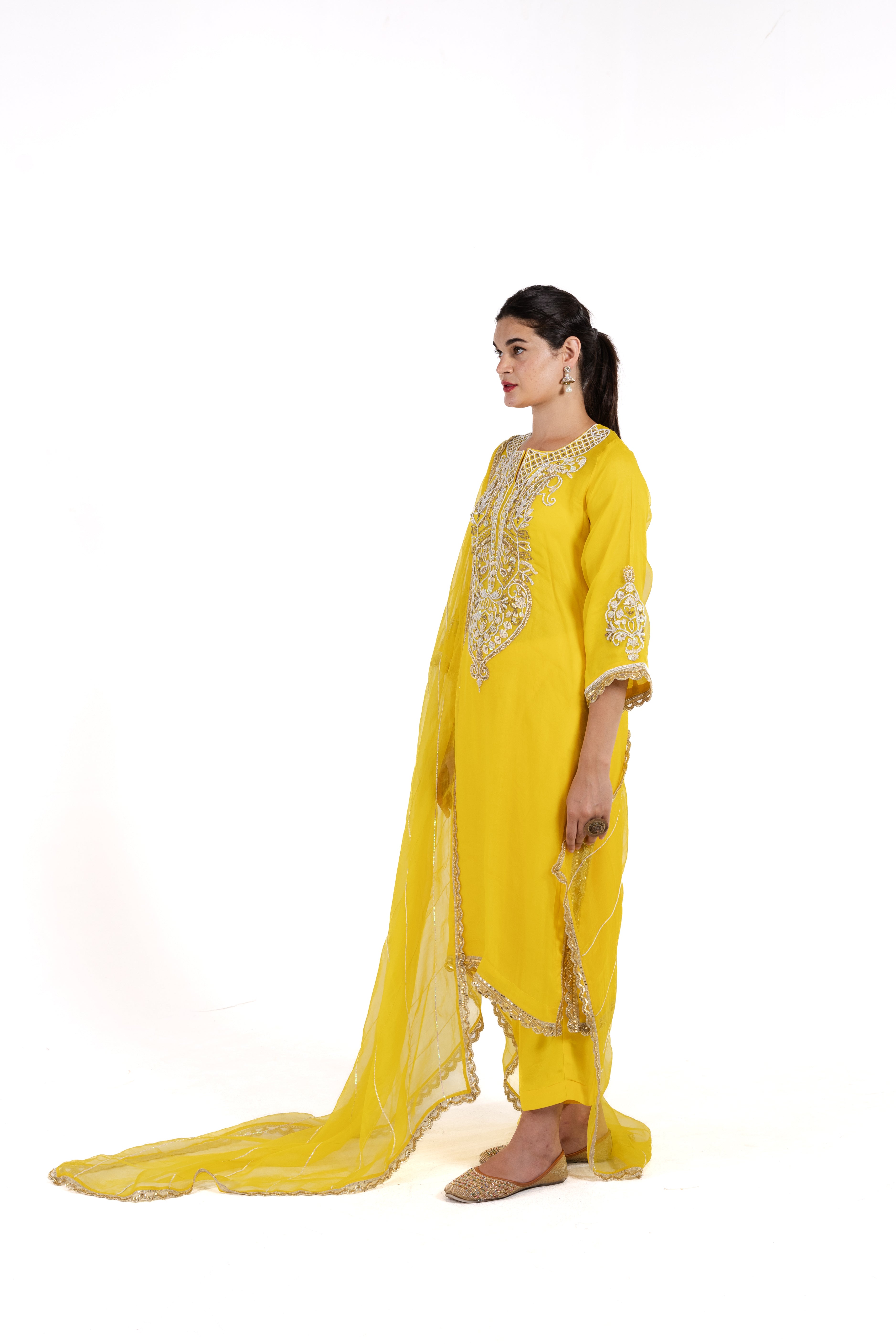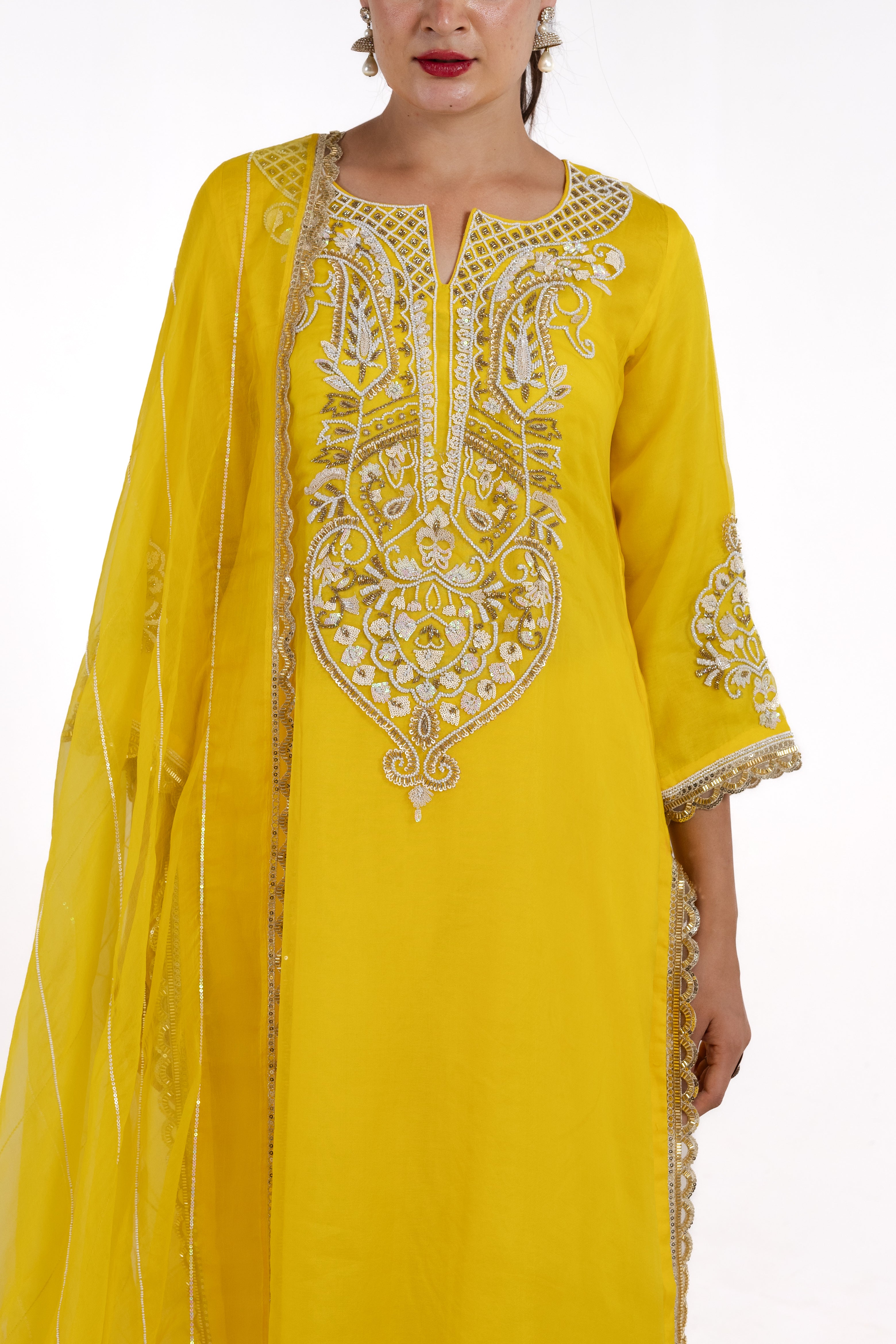 Discover elegance with Alina, a stunning organza silk suit adorned with delicate pearl and intricate thread work. Elevate your style with this exquisite piece, perfect for any occasion.