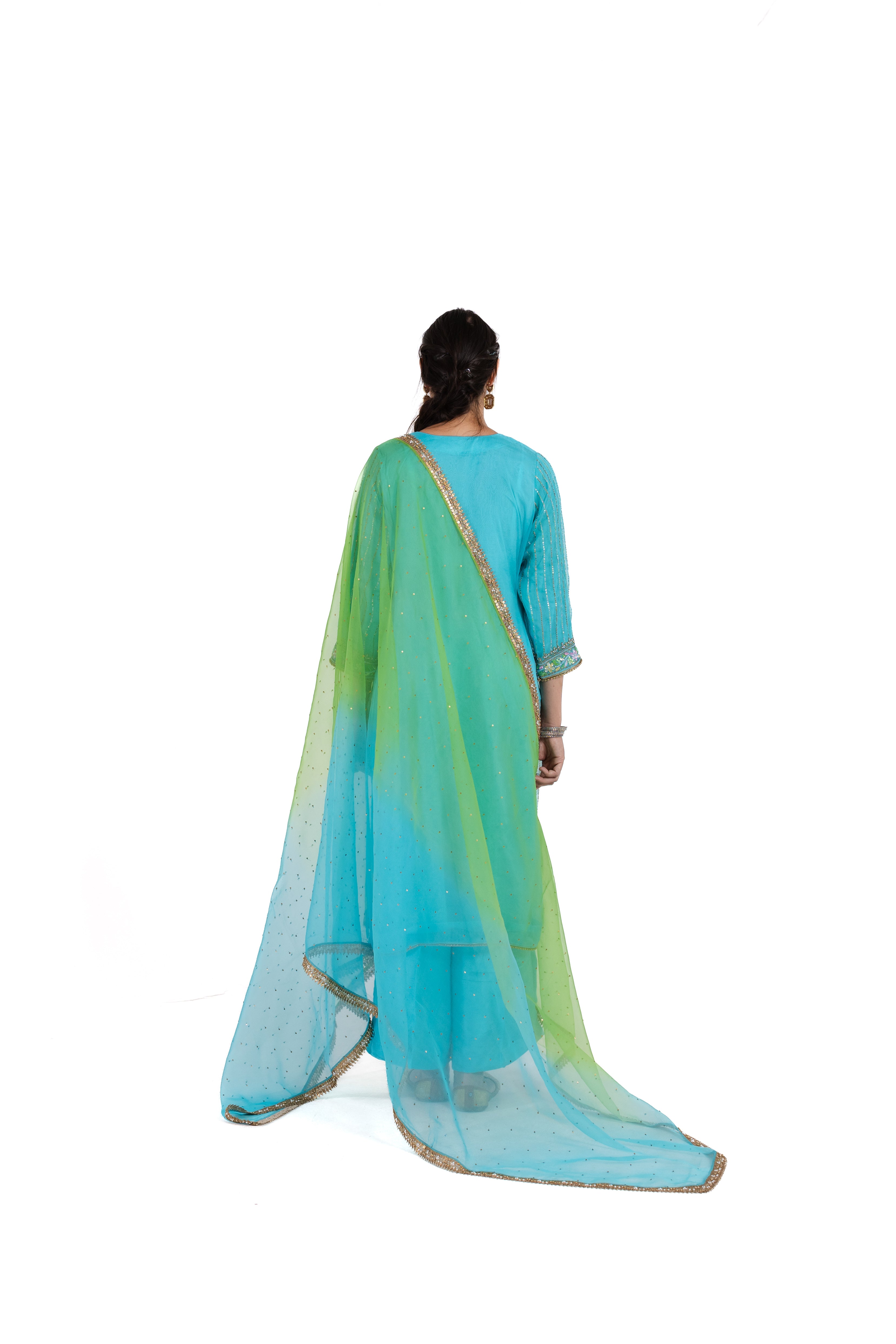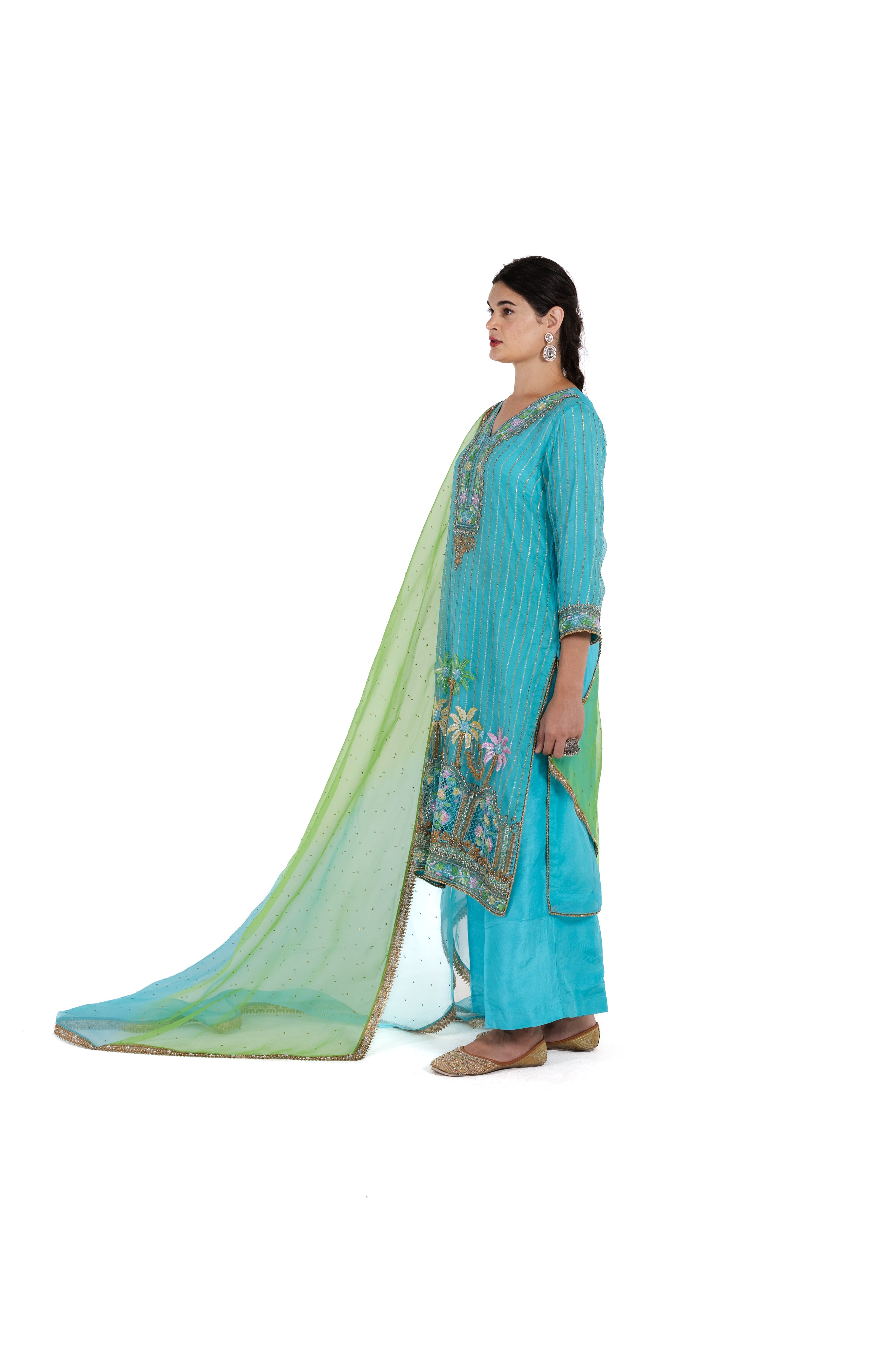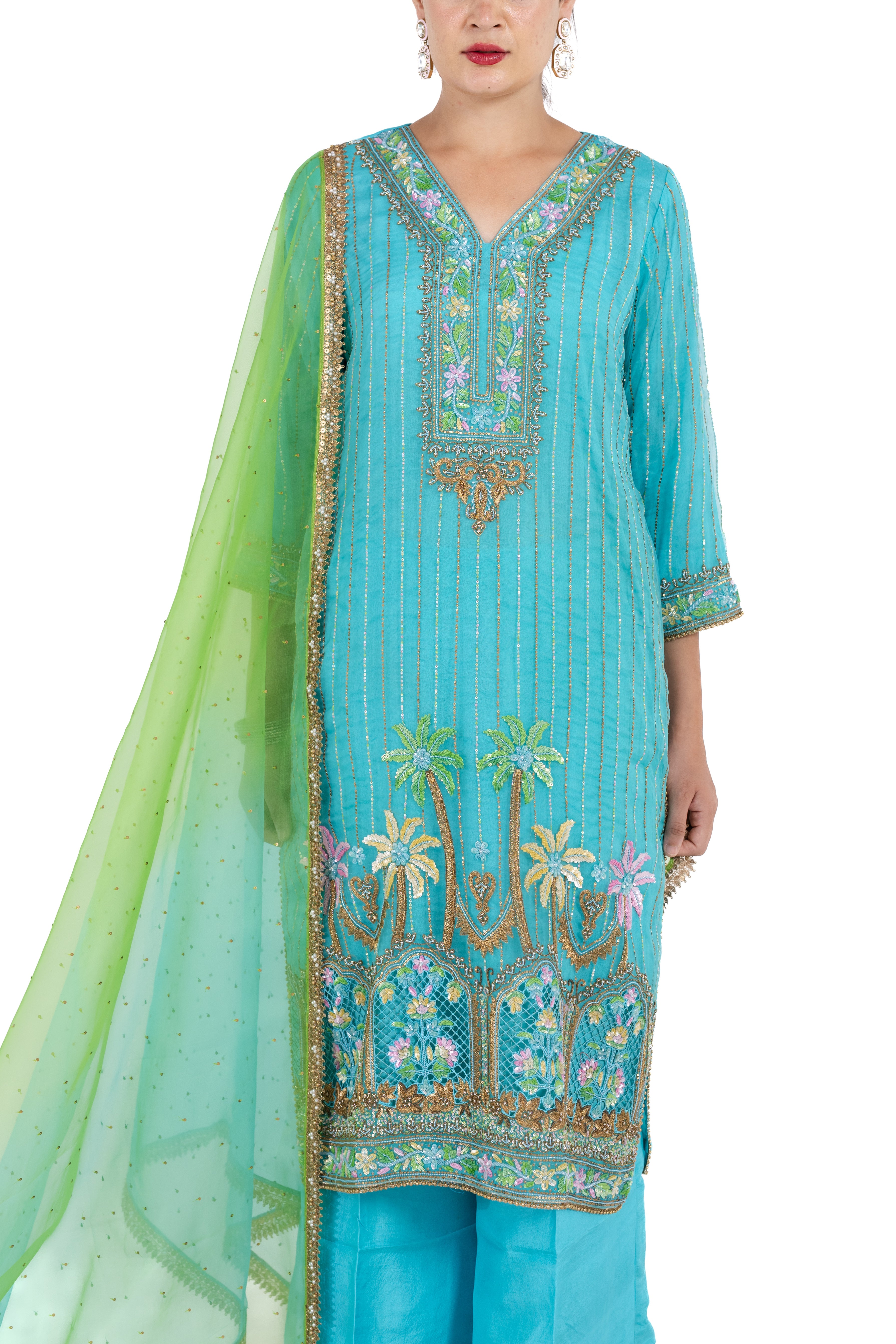 The lustrous silk organza creates an ethereal presence, while the artfully executed gold-finished threadwork captures light beautifully with each movement. Perfect for celebrations and special gatherings, this refined ensemble masterfully balances timeless grace with contemporary allure.