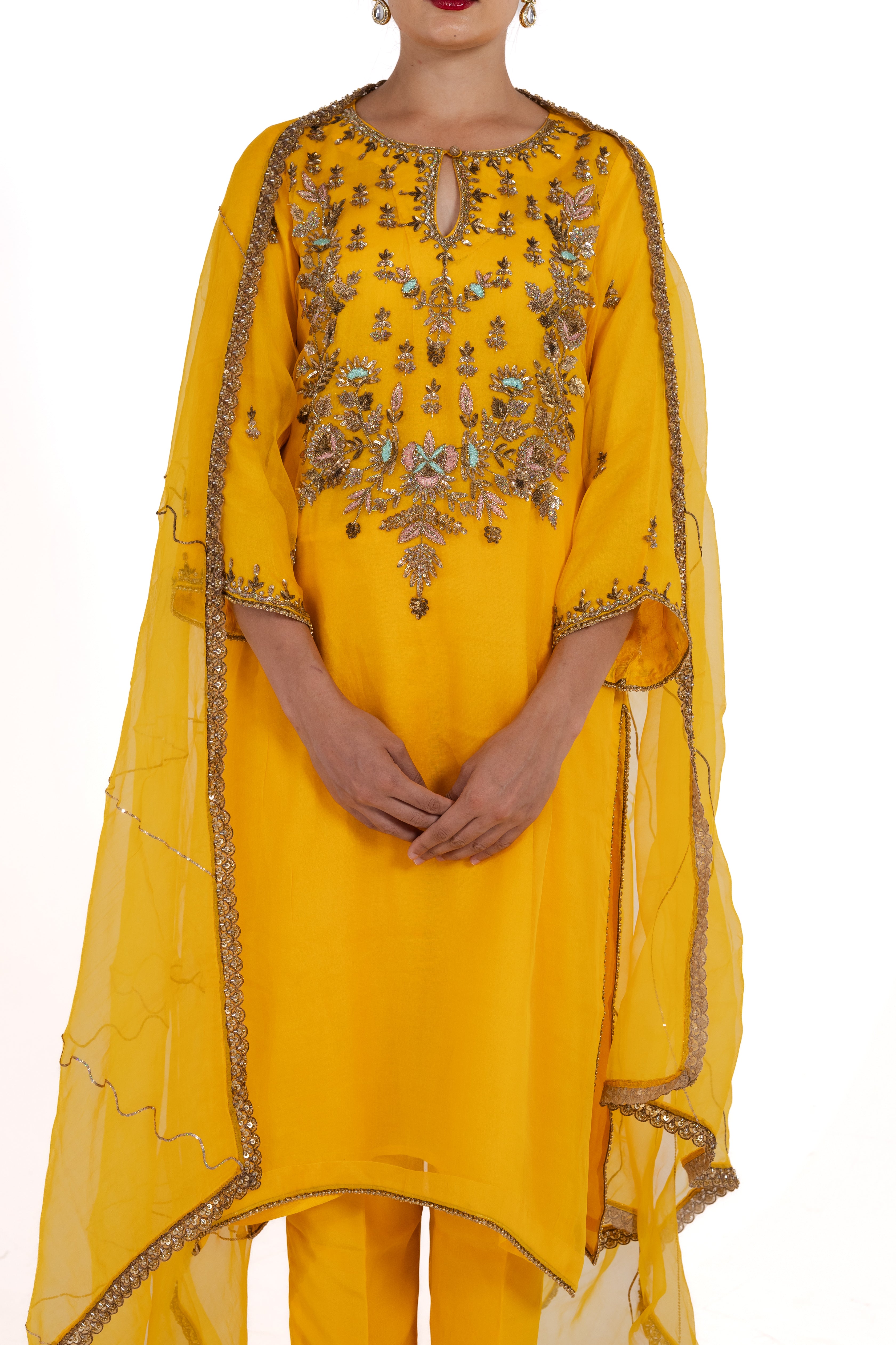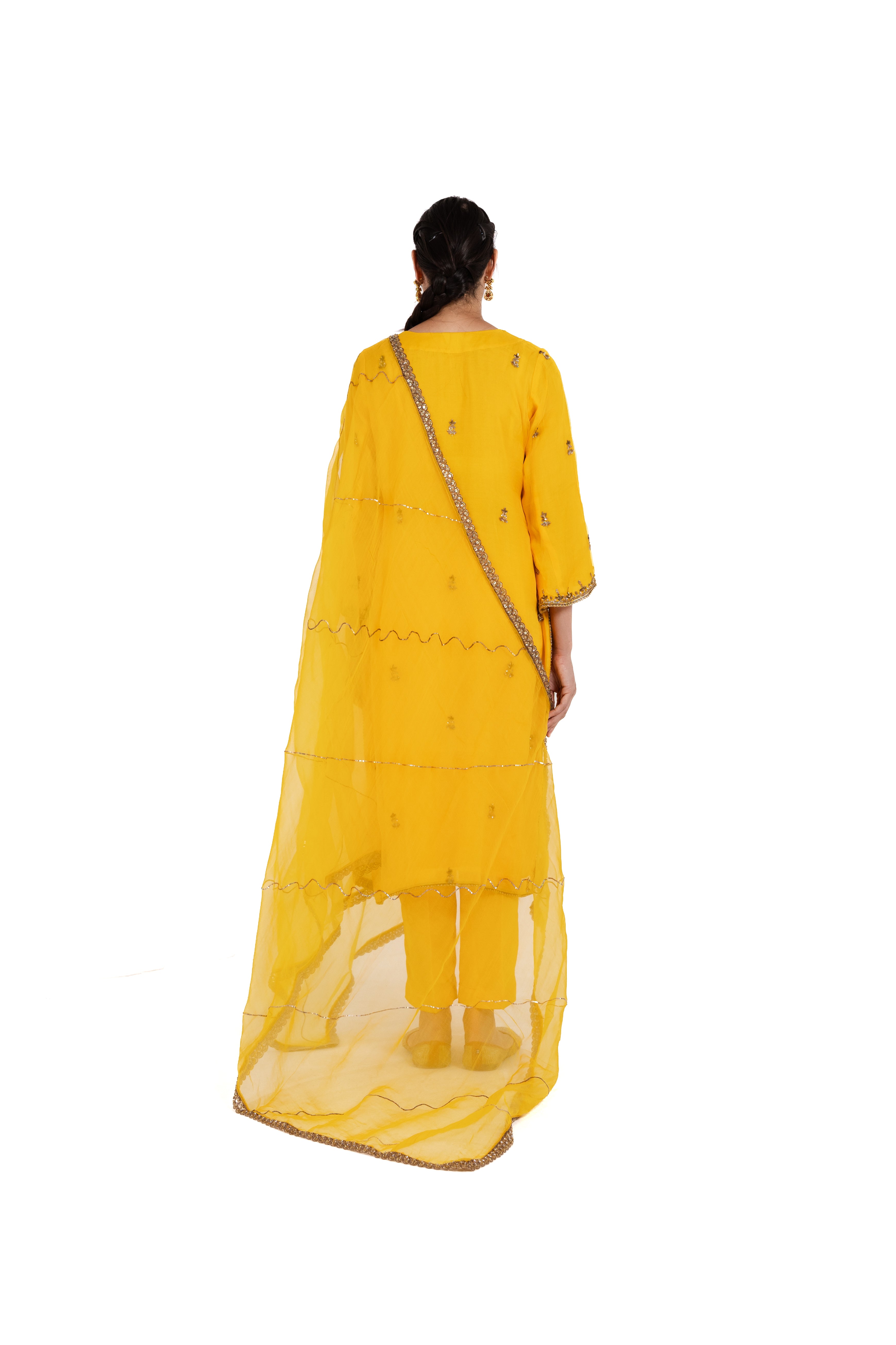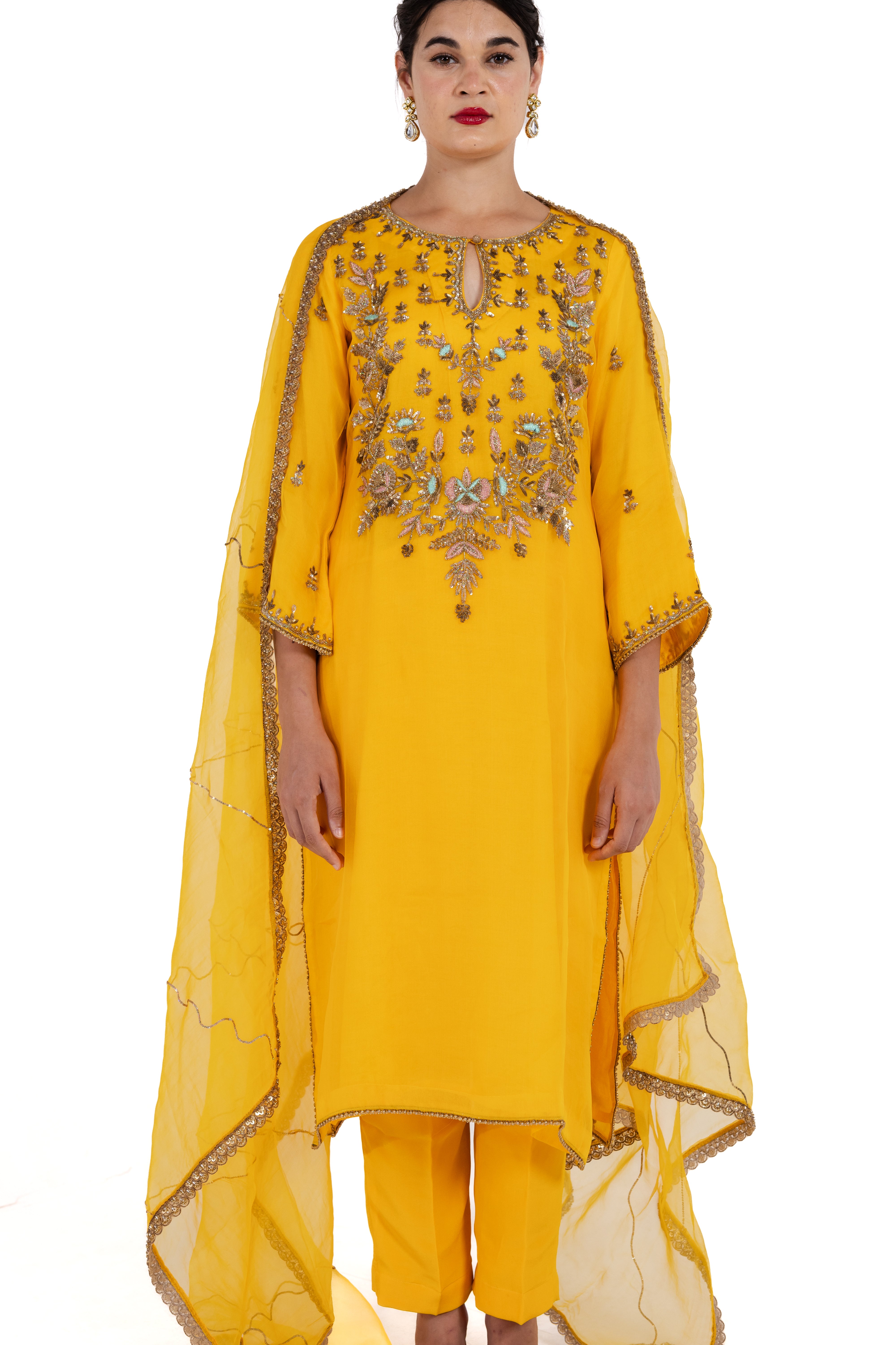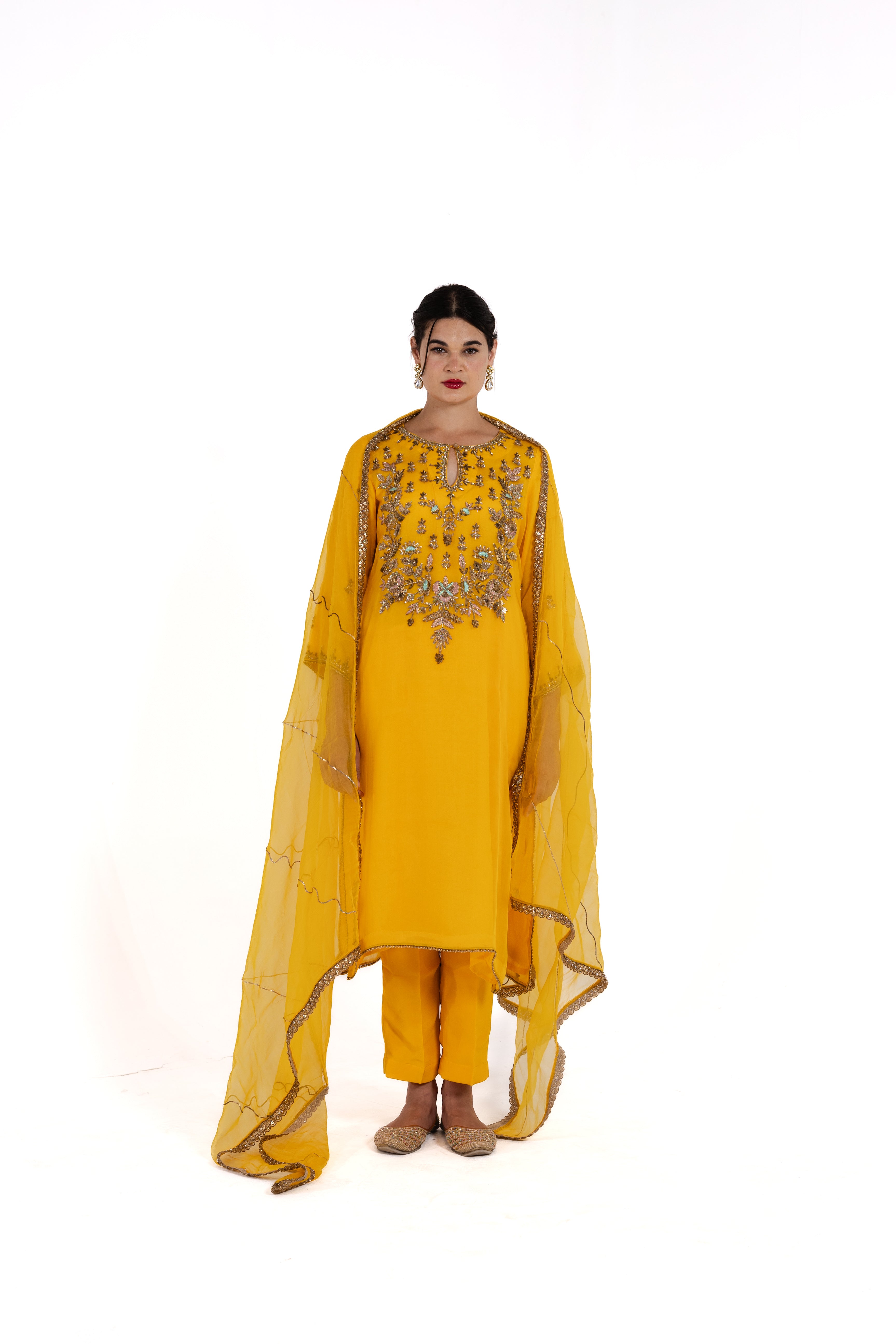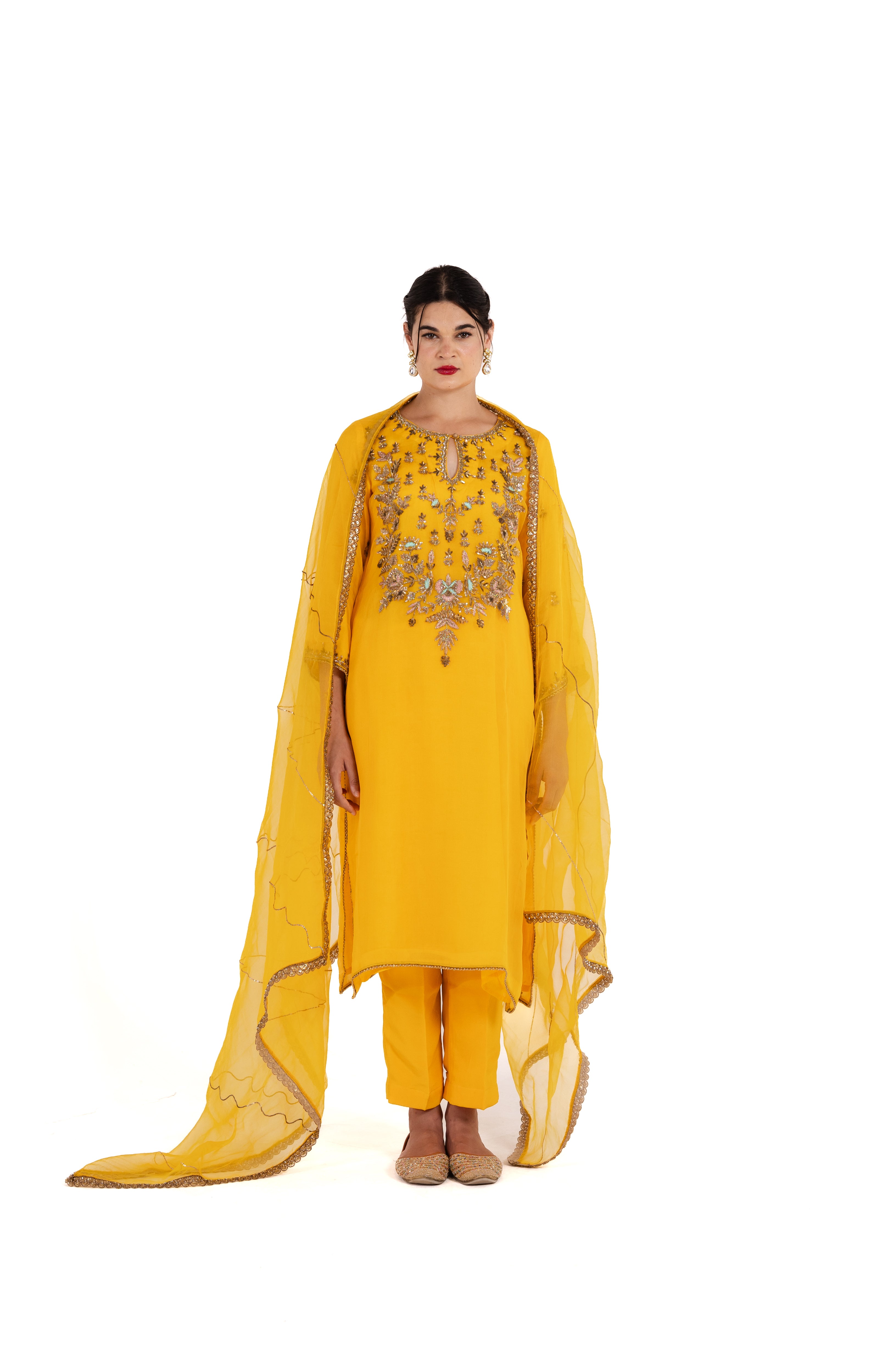 The Amira is a radiant celebration of elegance, crafted from luxurious pure Organza silk in a vibrant yellow hue. This stunning suit features intricate hand embroidery across the shirt, with delicate embellishments that add a touch of timeless grace. Paired with a matching dupatta adorned with equally elegant handwork, this ensemble beautifully balances tradition with a contemporary silhouette.
