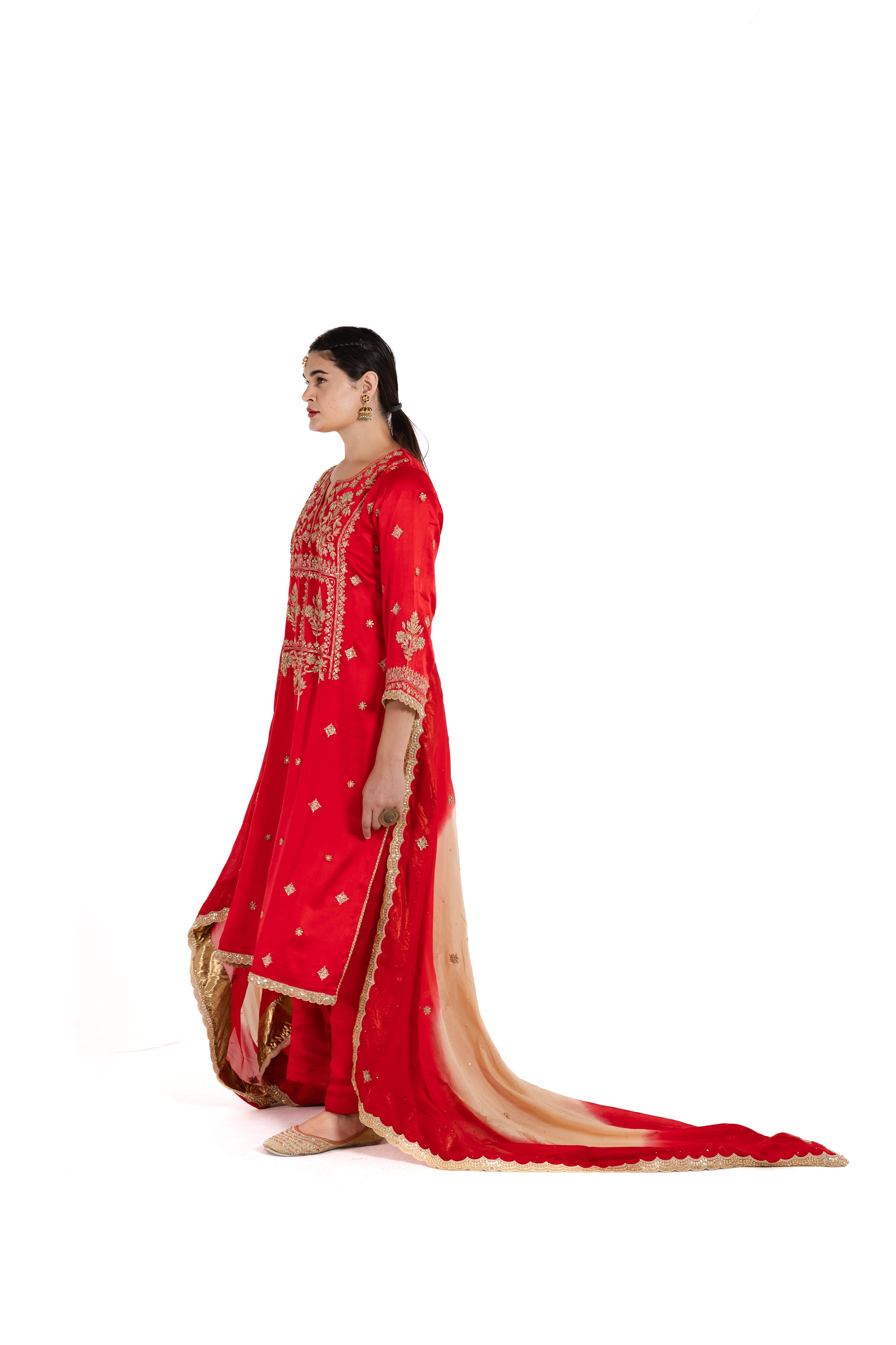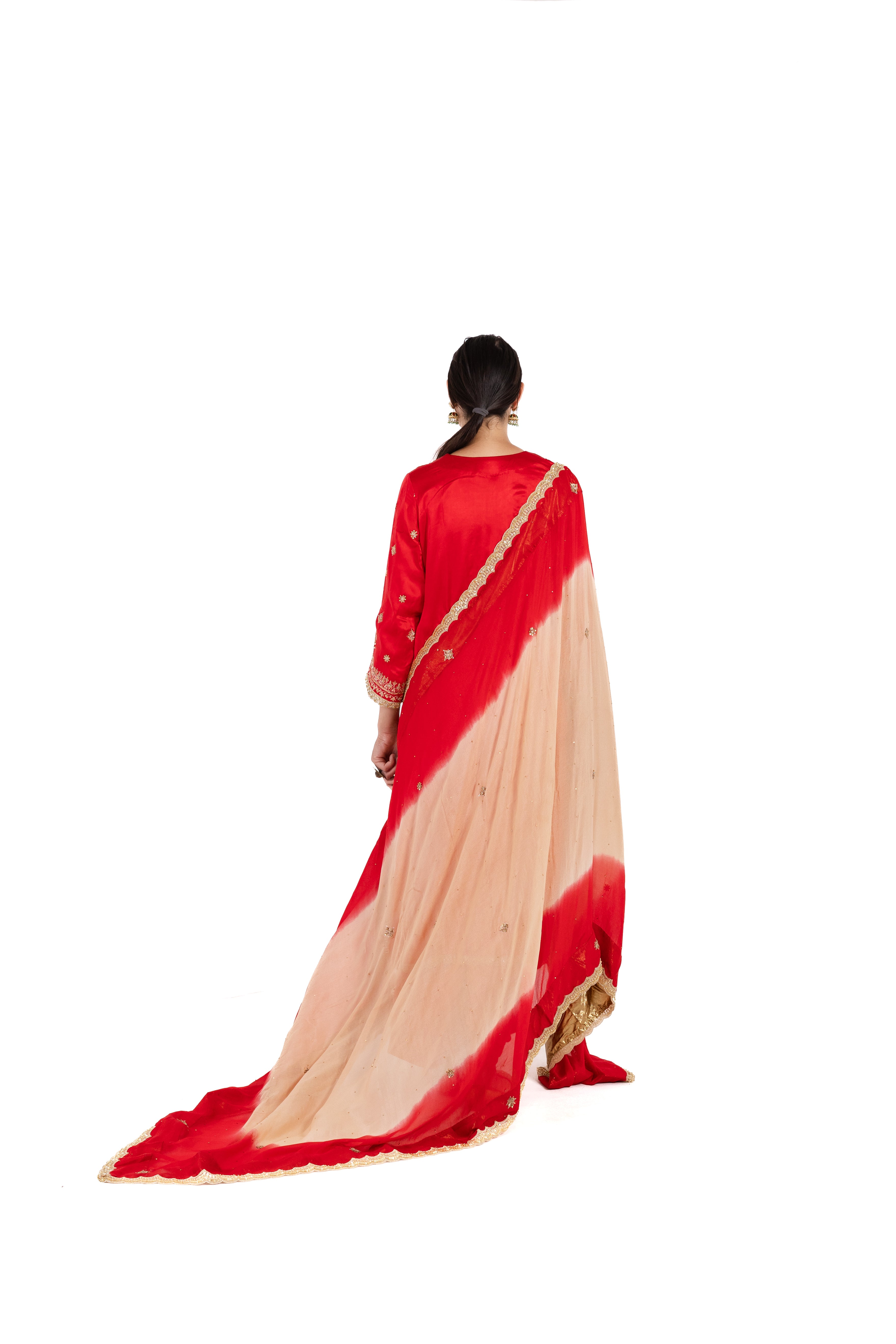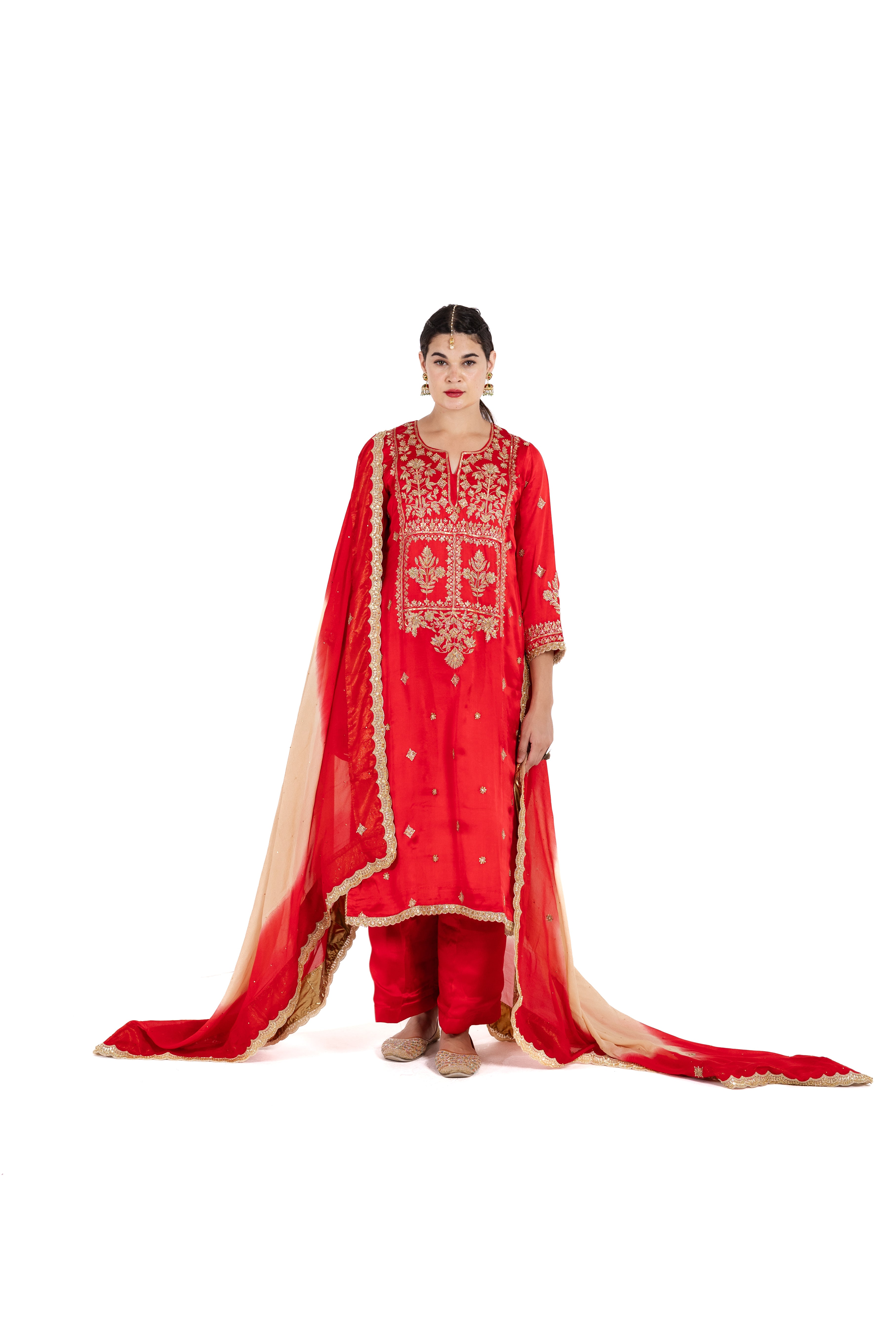 Experience the unparalleled luxury of The Areez, a pure satin silk suit meticulously handcrafted by skilled artisans. This exquisite piece features intricate zardosi work that highlights the beauty of traditional craftsmanship, adding rich detail and texture to the fabric.