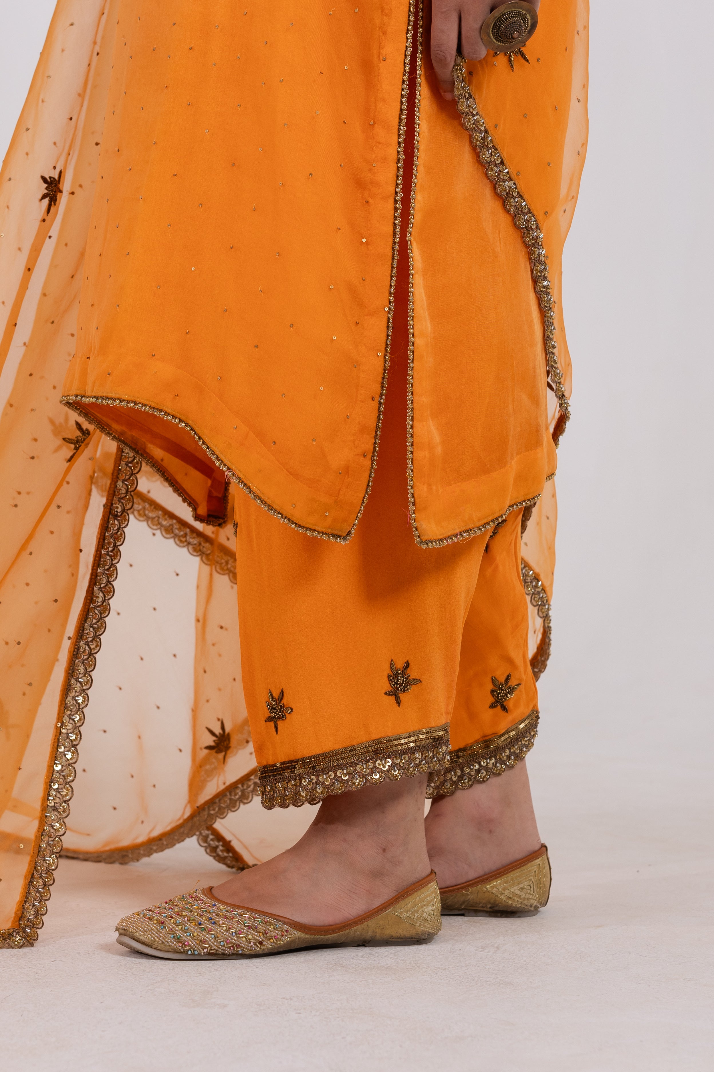 Elevate your style with The Arham, a pure organza silk suit adorned with exquisite antique work across the shirt, dupatta, and salwar. This luxurious ensemble is crafted to perfection, offering the rich, lightweight feel of high-quality organza silk.