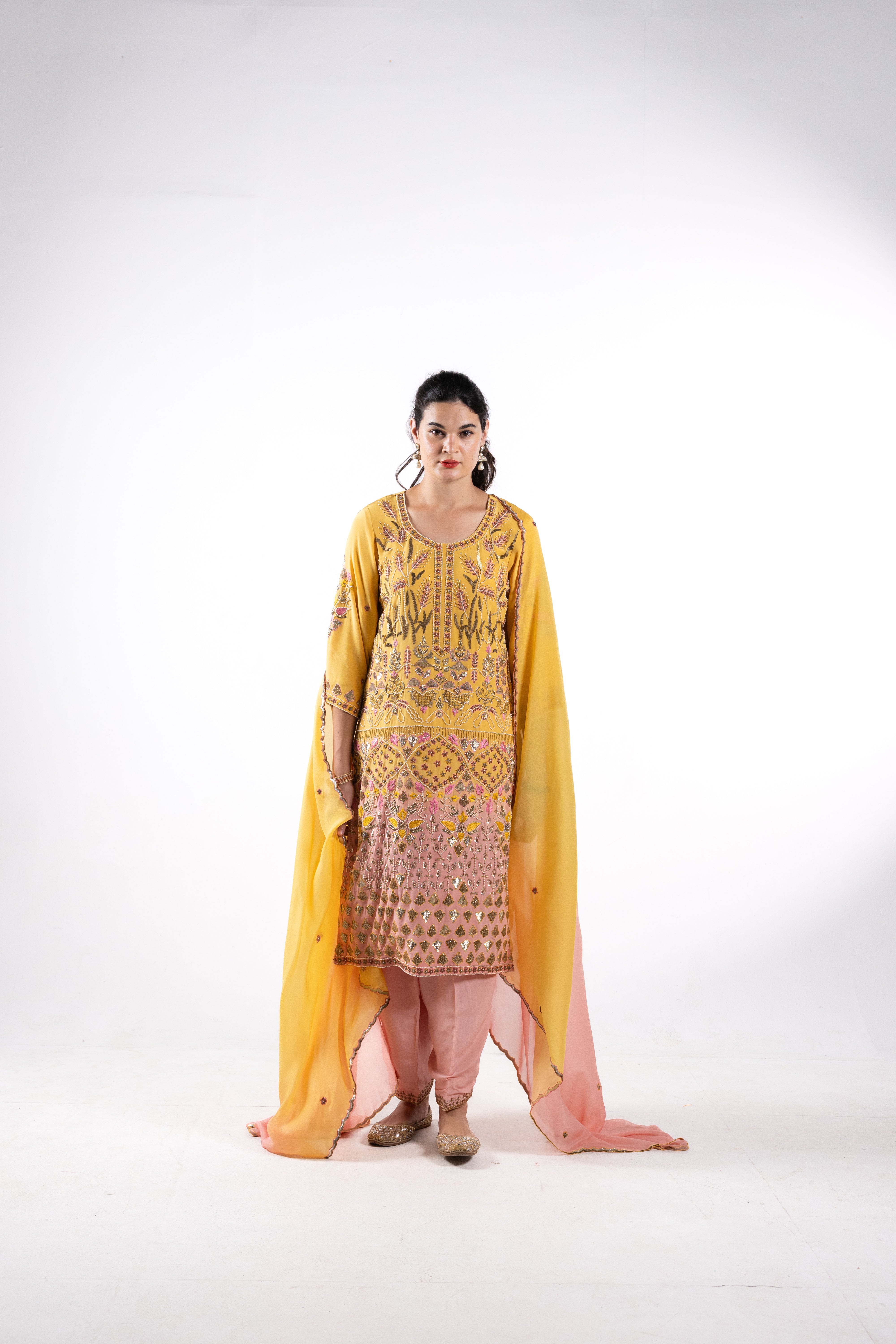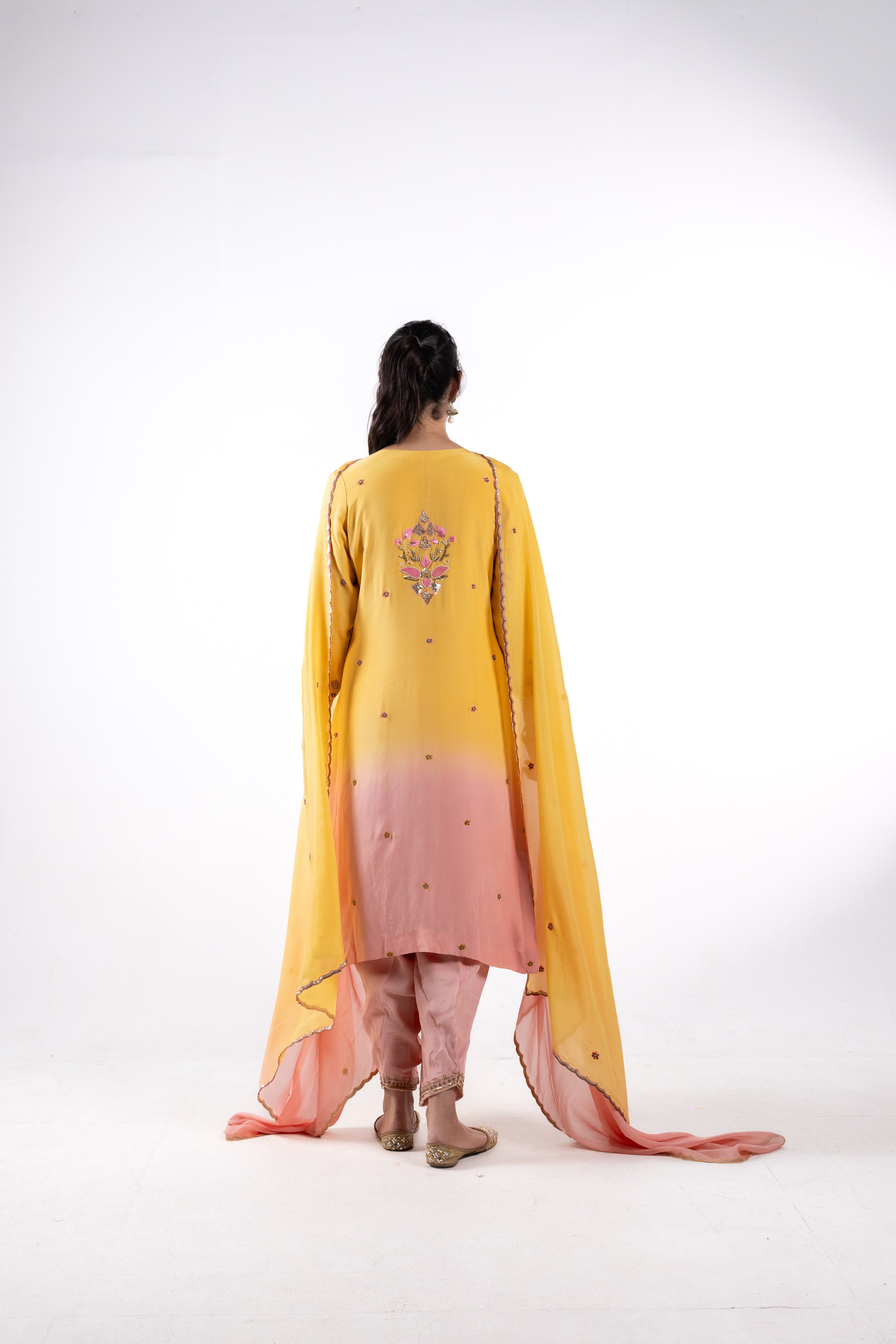 Introducing The Basma, a captivating pure crepe suit featuring a beautiful gradient of yellow and pink shades. Adorned with intricate zardozi, bead, and sequin work, this outfit is a true masterpiece that radiates elegance.