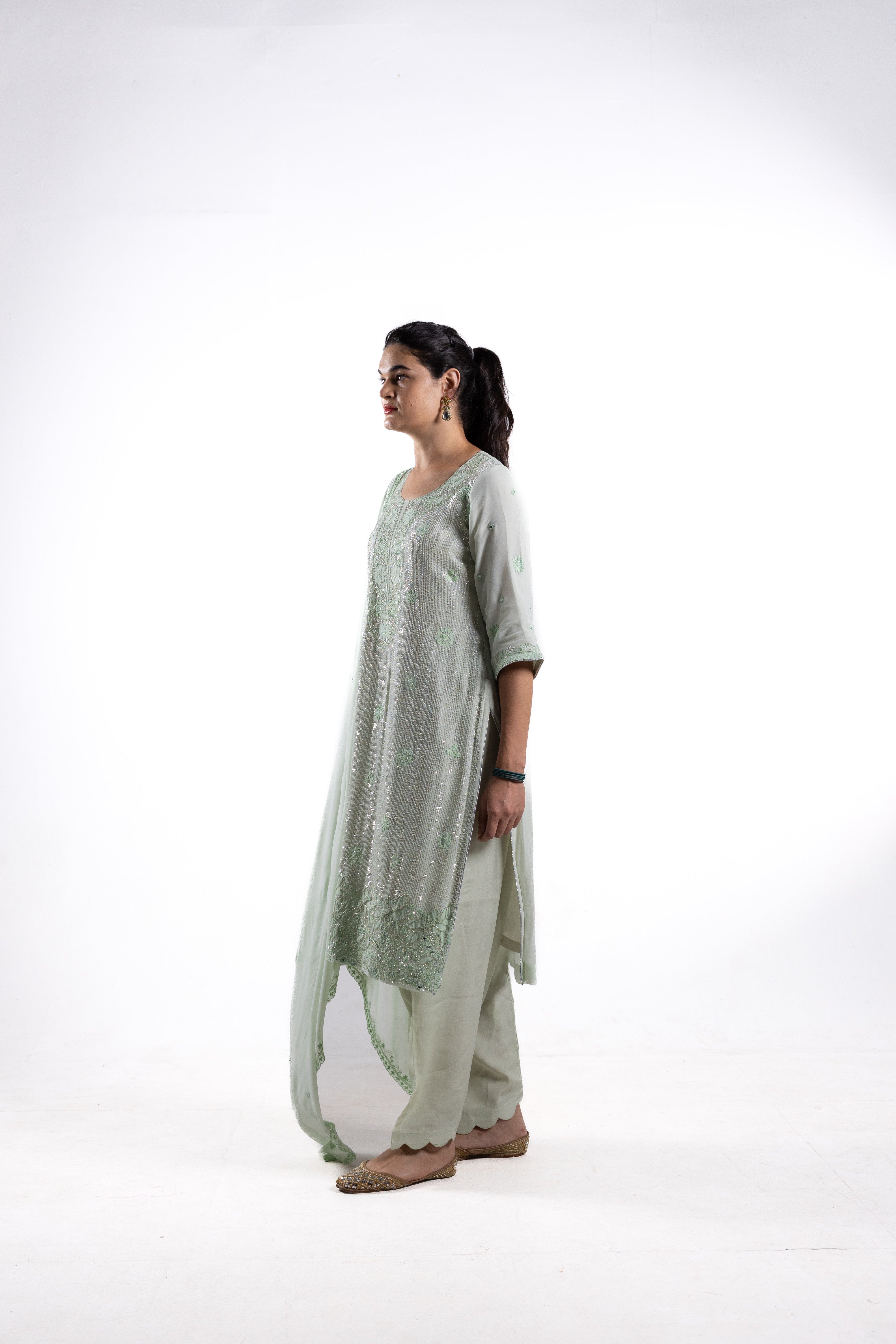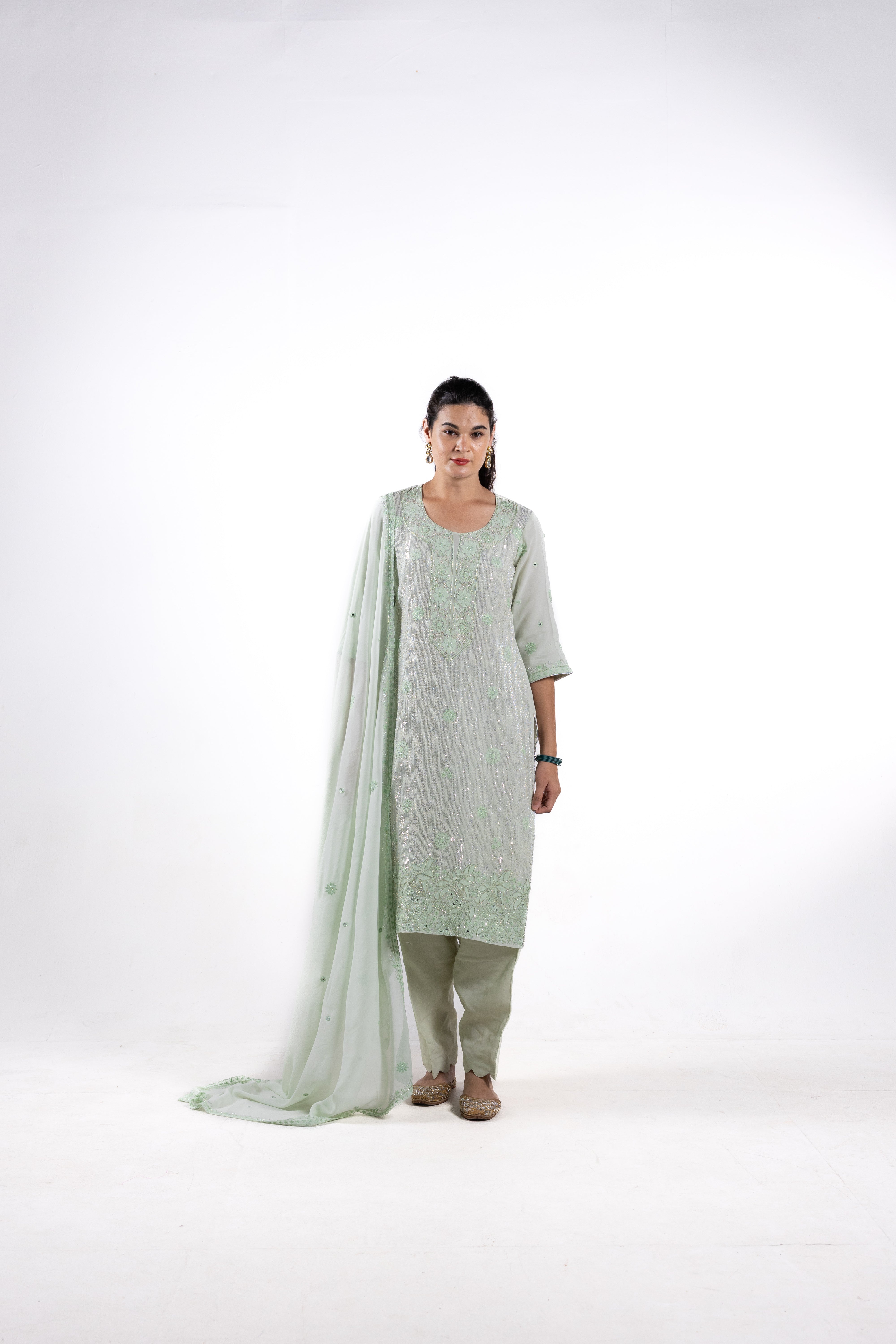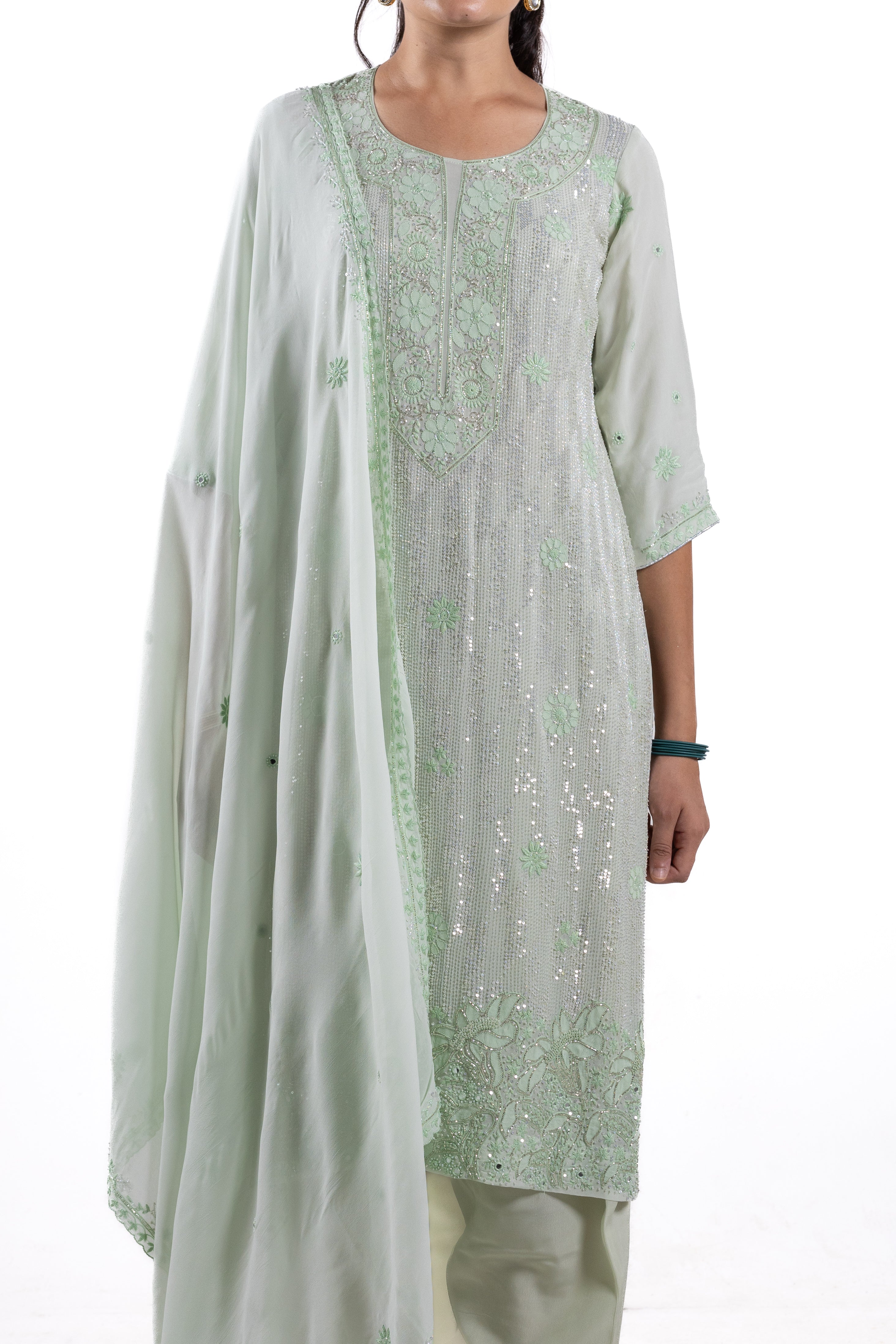 Expertly crafted and beautifully designed, The Bhuvi suit in a delicate pastel green exudes grace and sophistication. Featuring intricate all-over sequin embroidery, this ensemble brings a subtle shimmer that enhances its elegance.