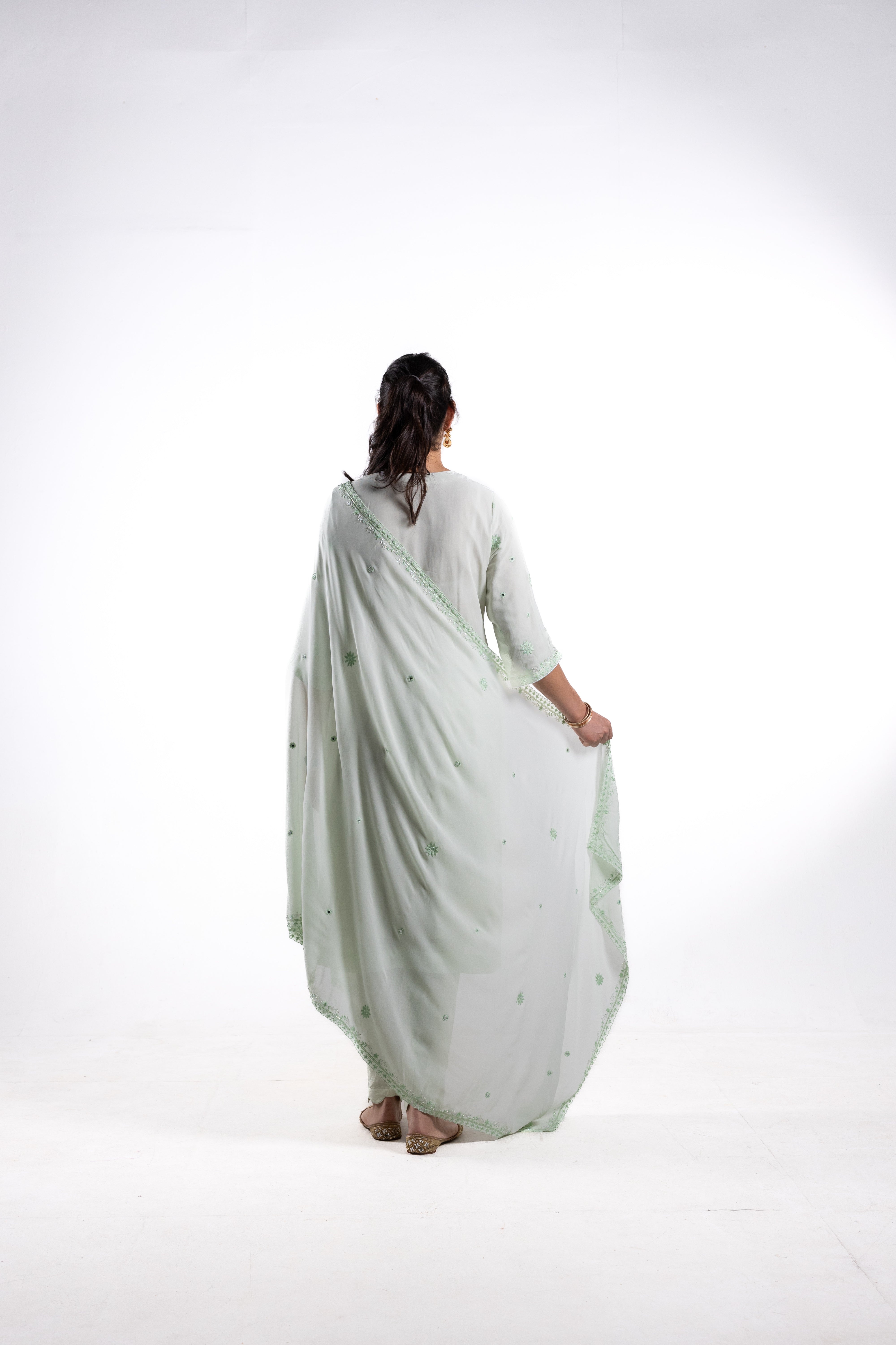 The set includes a matching pastel green salwar and a flowing dupatta, completing the refined look. Perfect for a variety of occasions, The Bhuvi is a versatile addition to any wardrobe, offering a timeless style that radiates understated luxury.