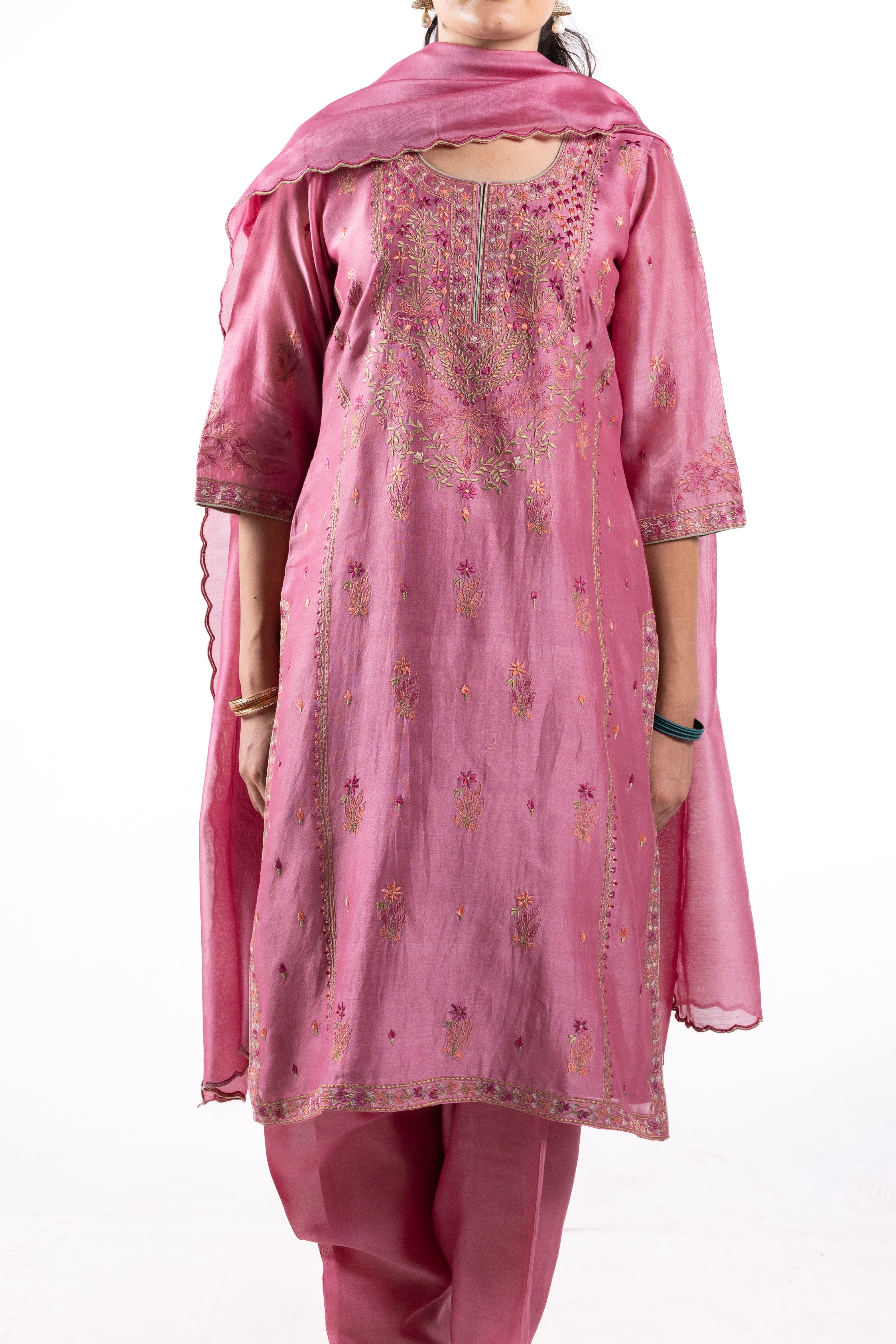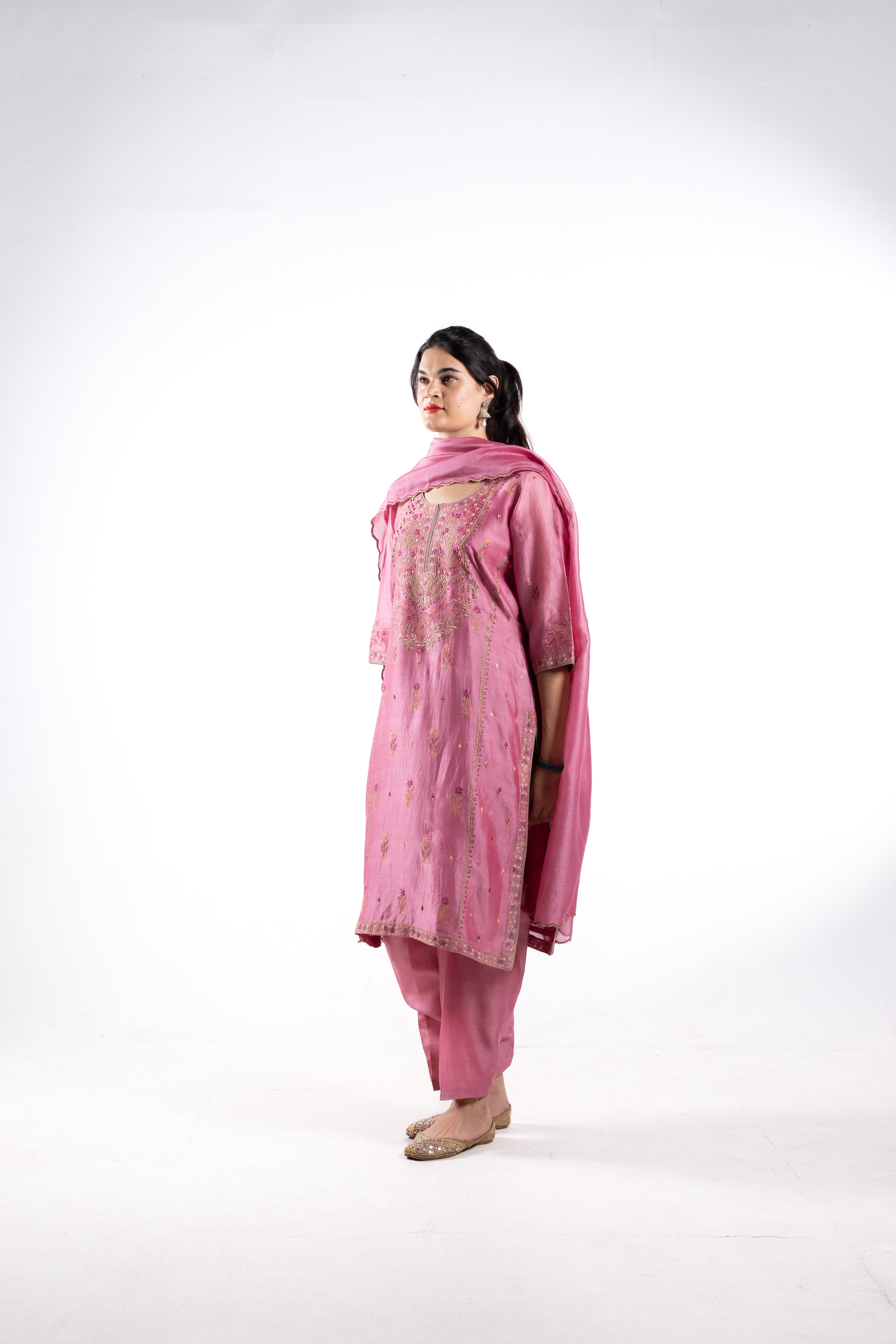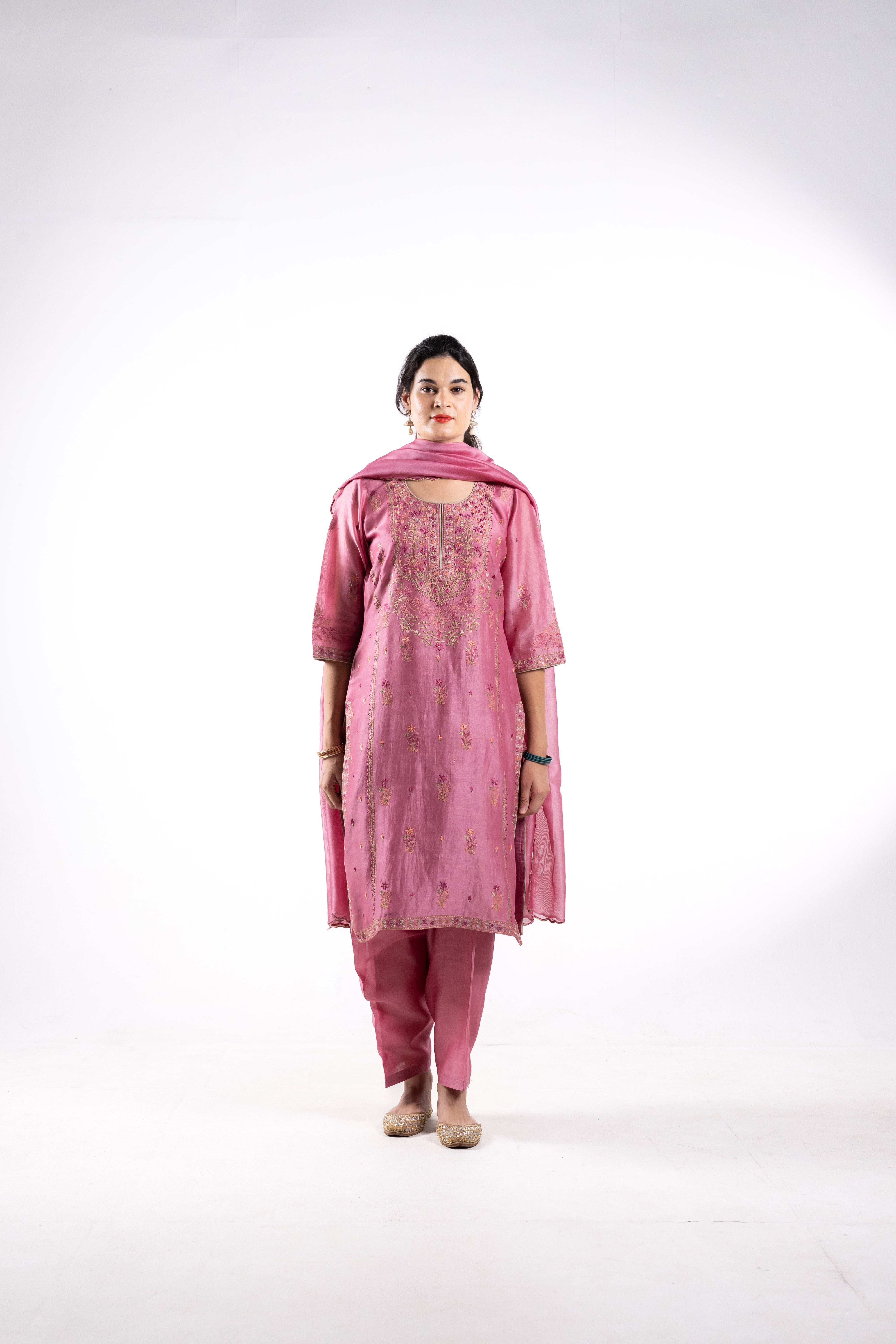 Expertly crafted from luxurious Chanderi silk, The Ekta suit in a soft pink hue brings timeless elegance and grace to any occasion. This exquisite ensemble features intricate embroidery on the front and back neckline, adding a refined touch of sophistication.