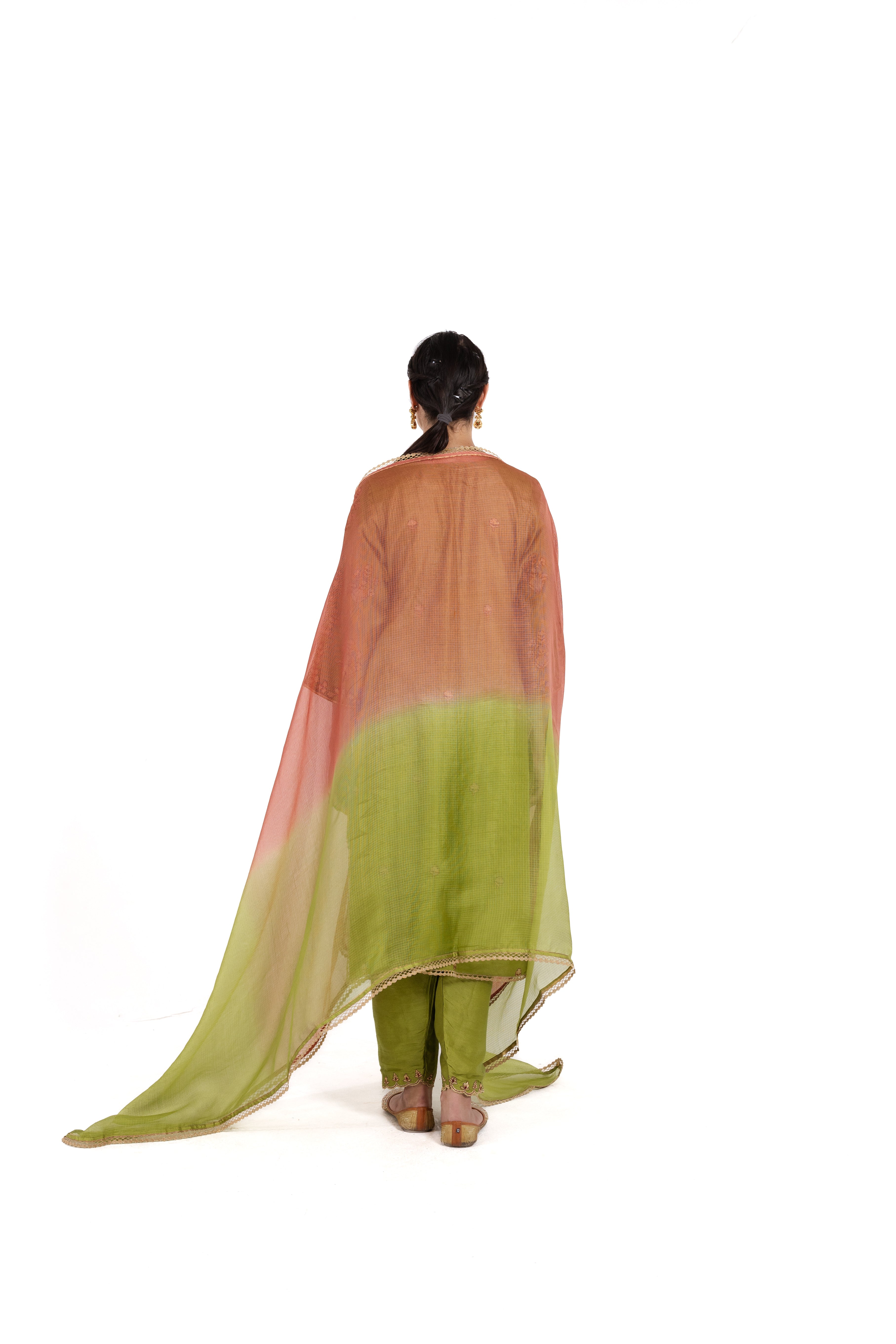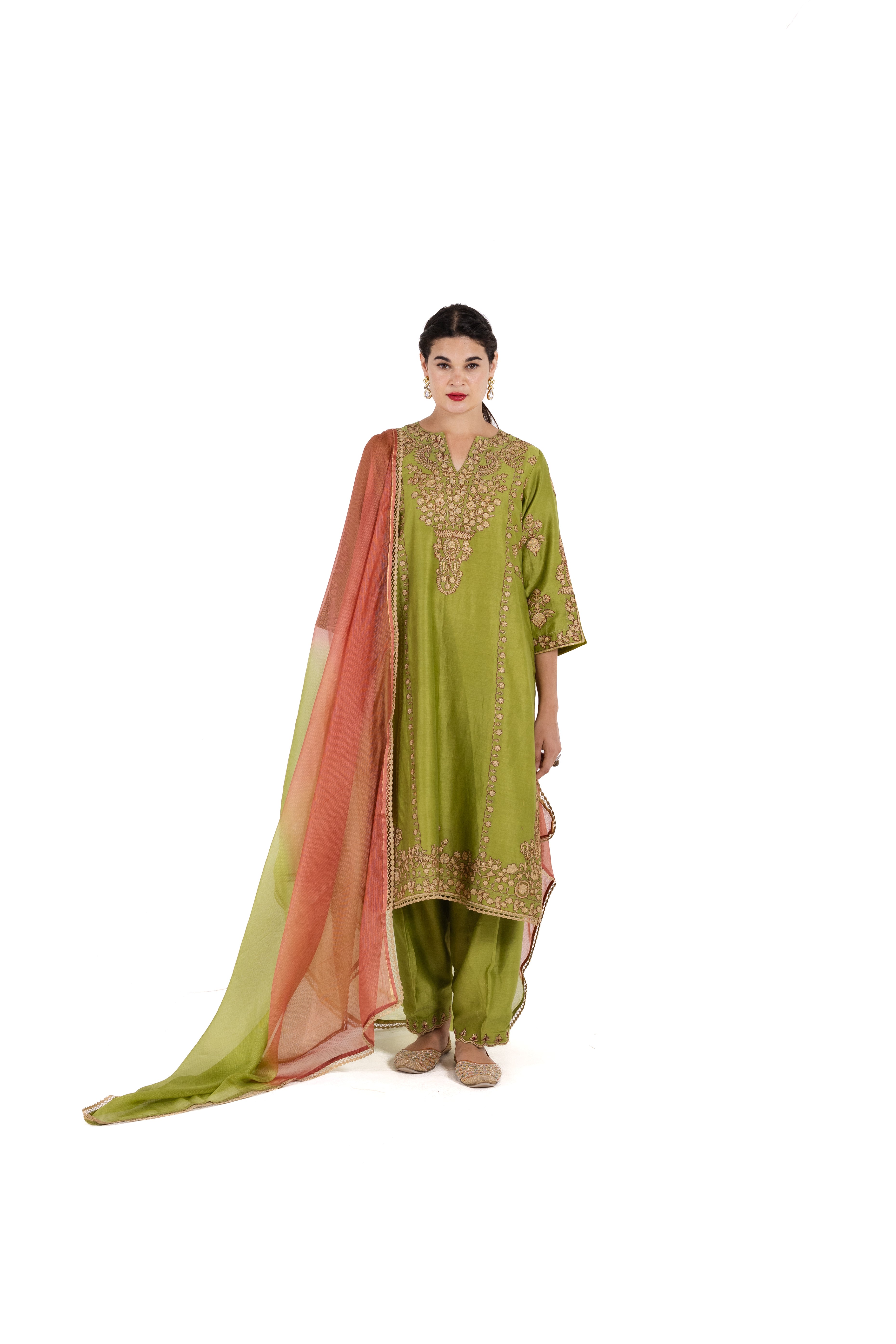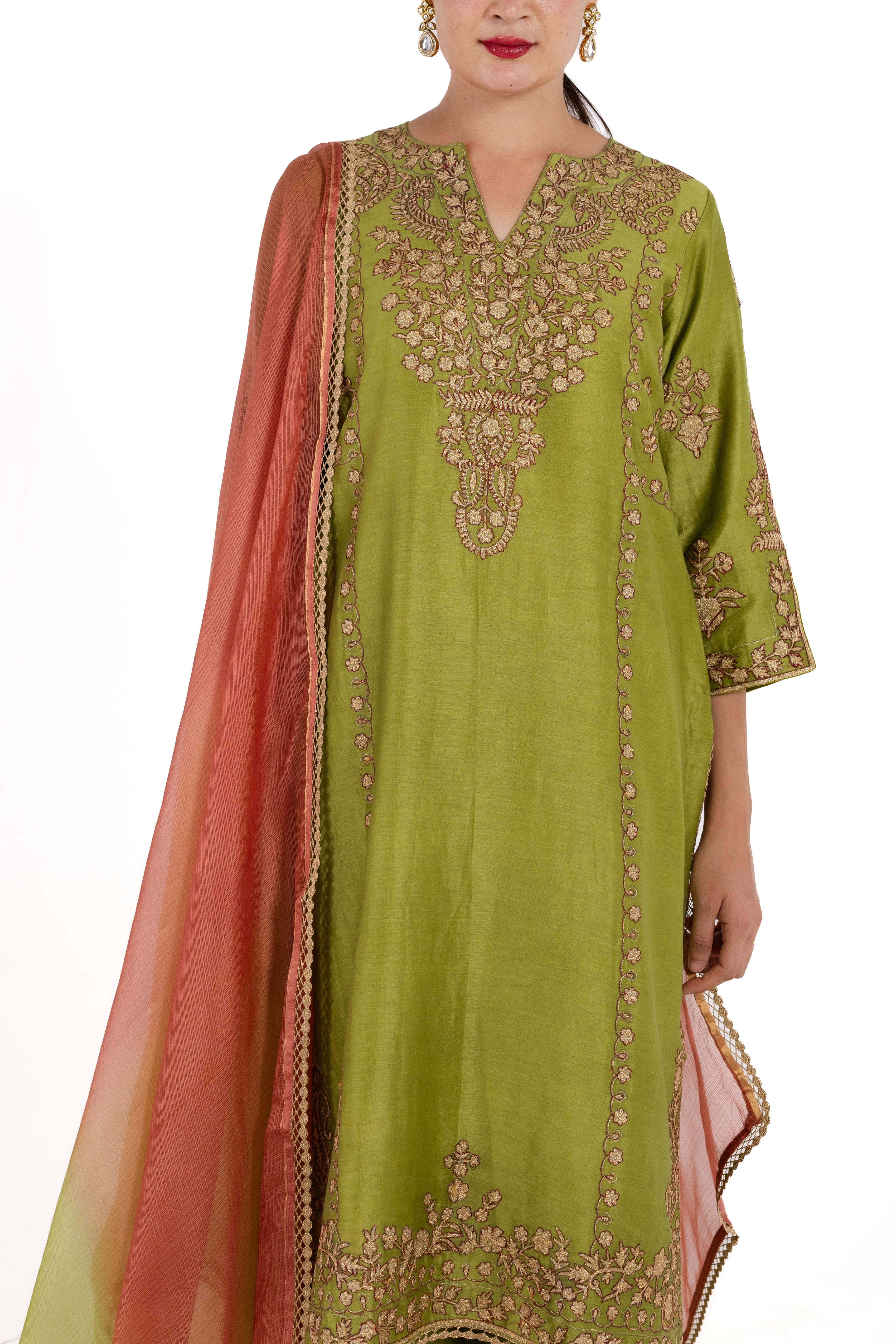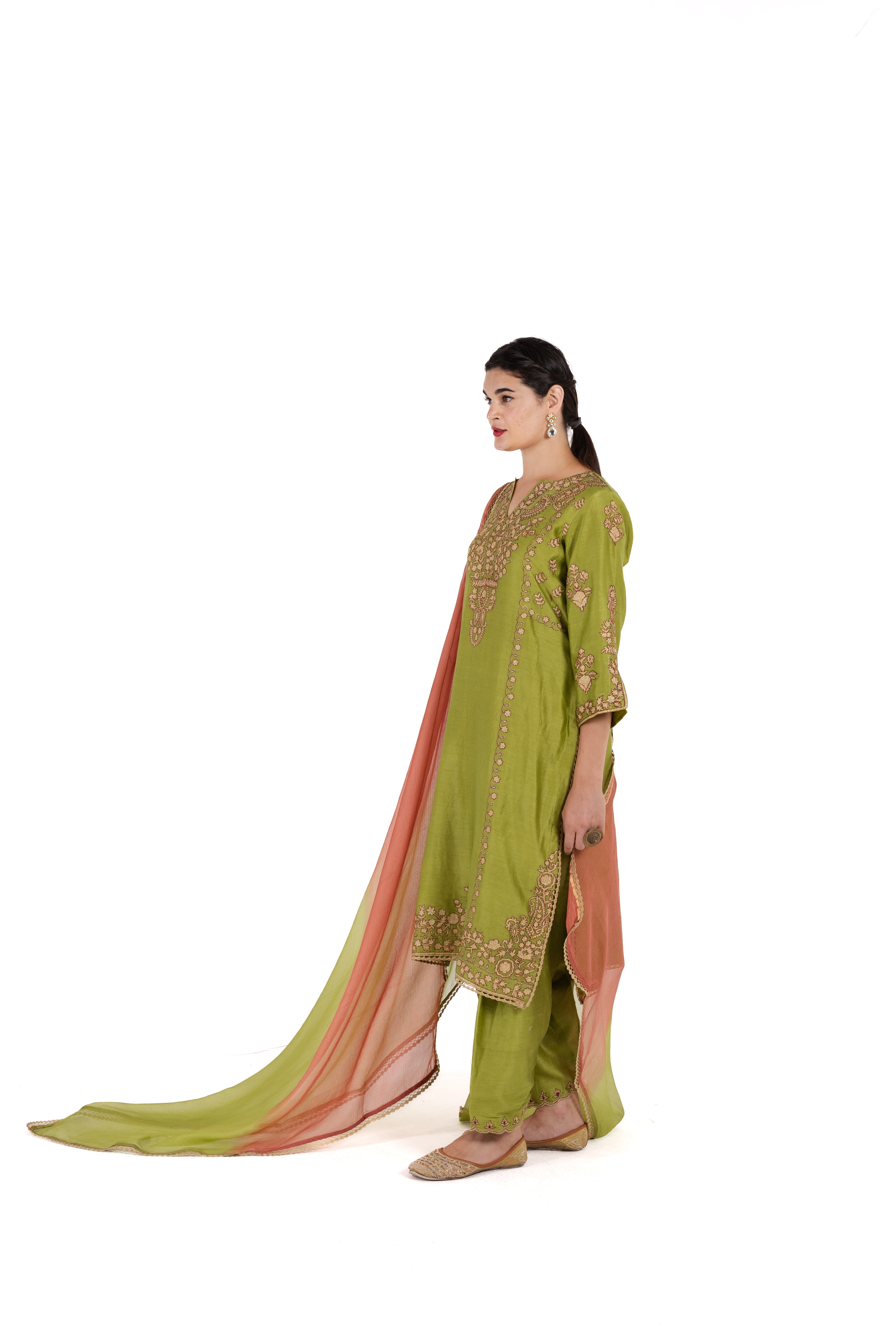 Crafted from luxurious pure Chanderi silk, The Zara suit in a graceful olive green shade features intricate embroidery on the shirt and salwar, adding elegance to its traditional charm.