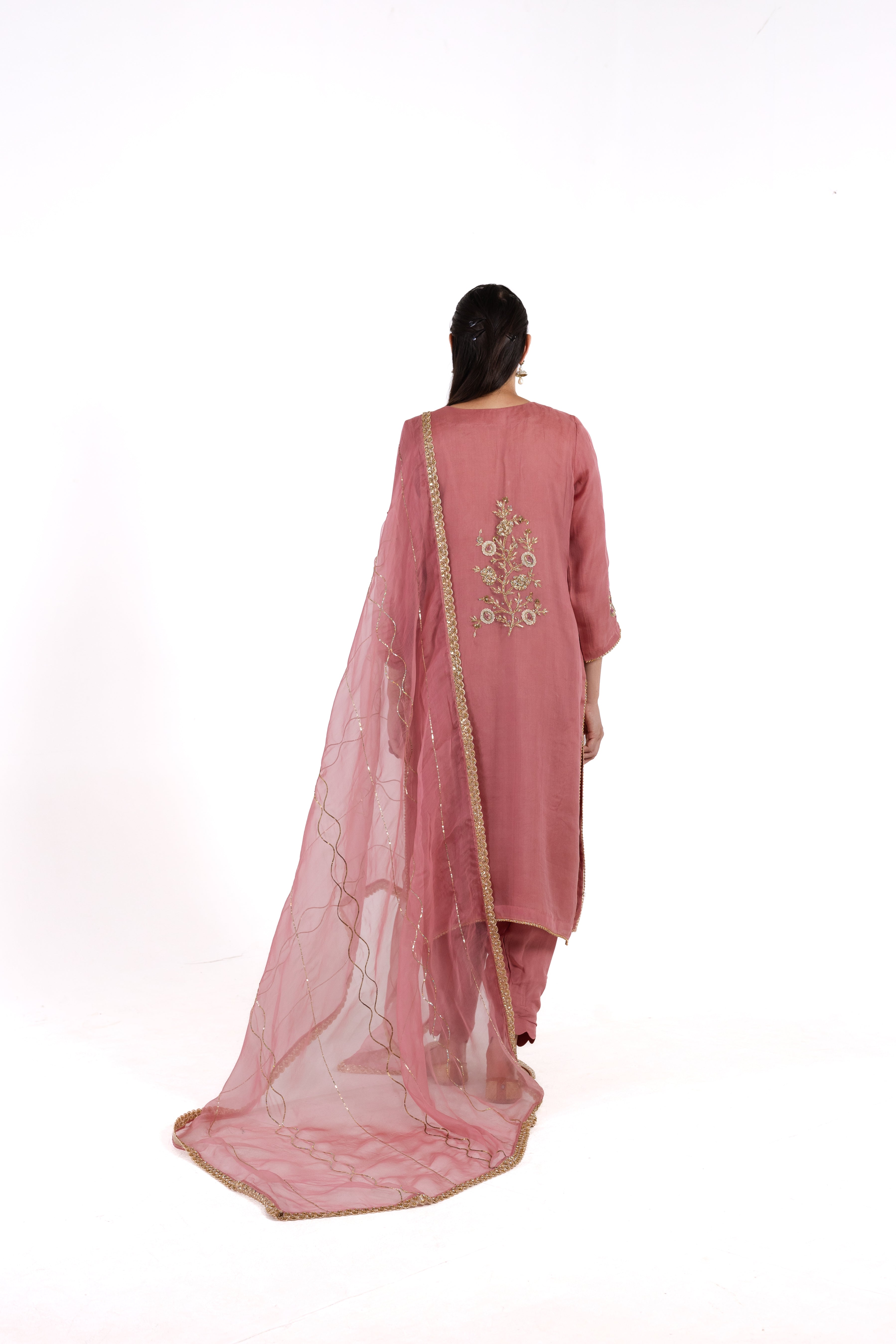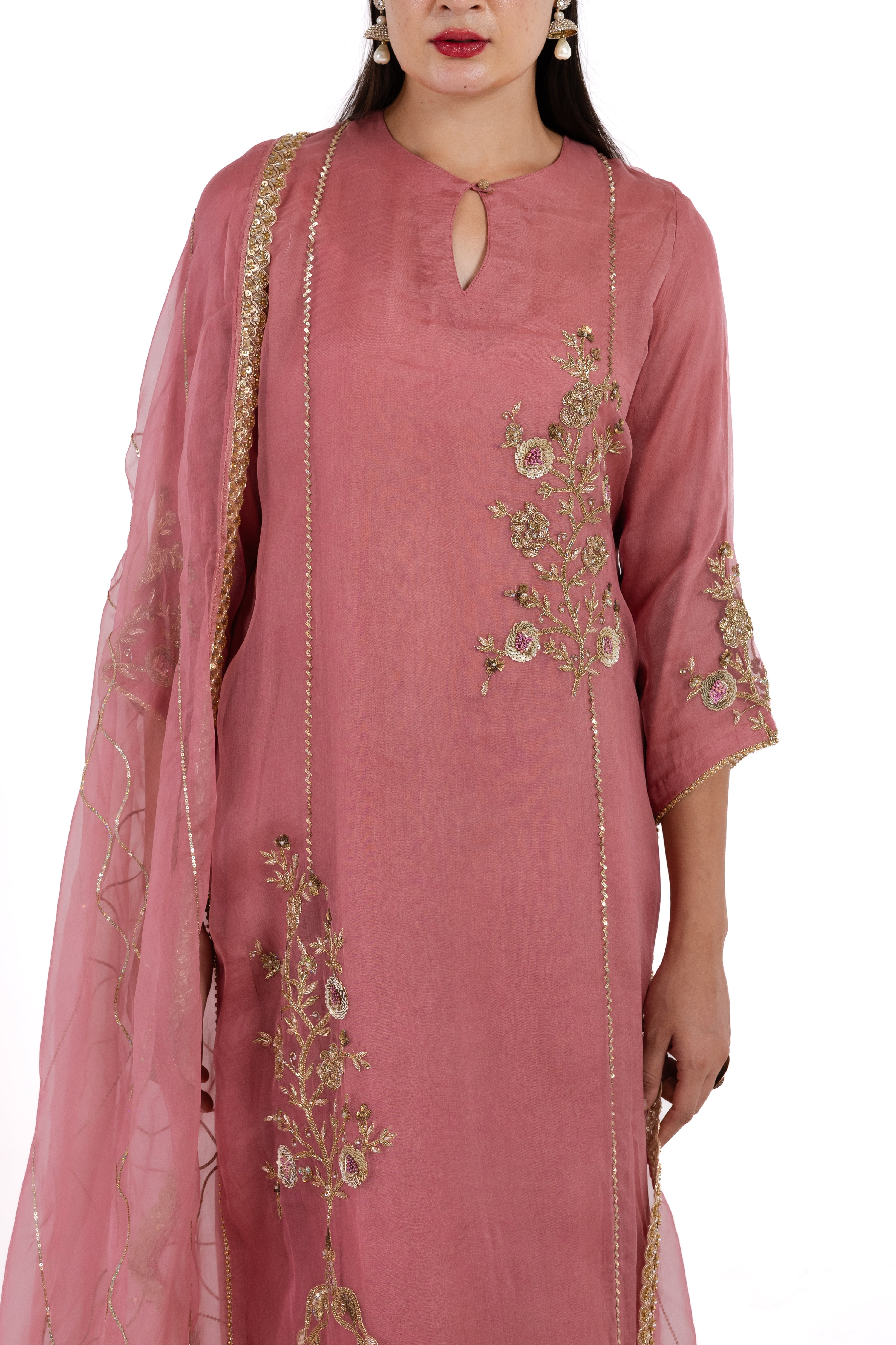 The Fiza is a captivating organza suit in a sophisticated dusty rose shade, adorned with exquisite antique hand embroidery that adds a touch of timeless elegance. Made with high-quality materials, this luxurious piece offers a refined look that is perfect for special occasions.