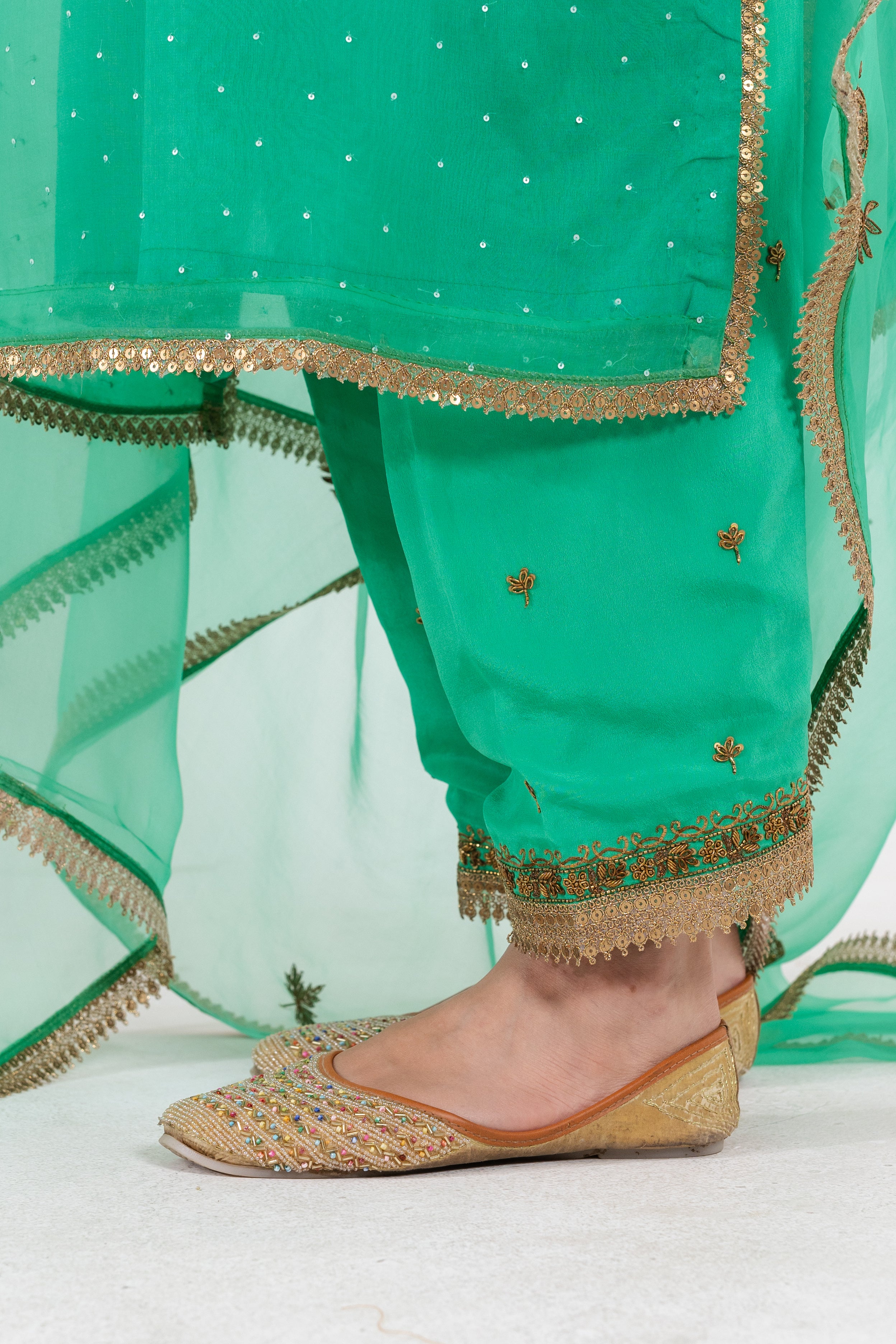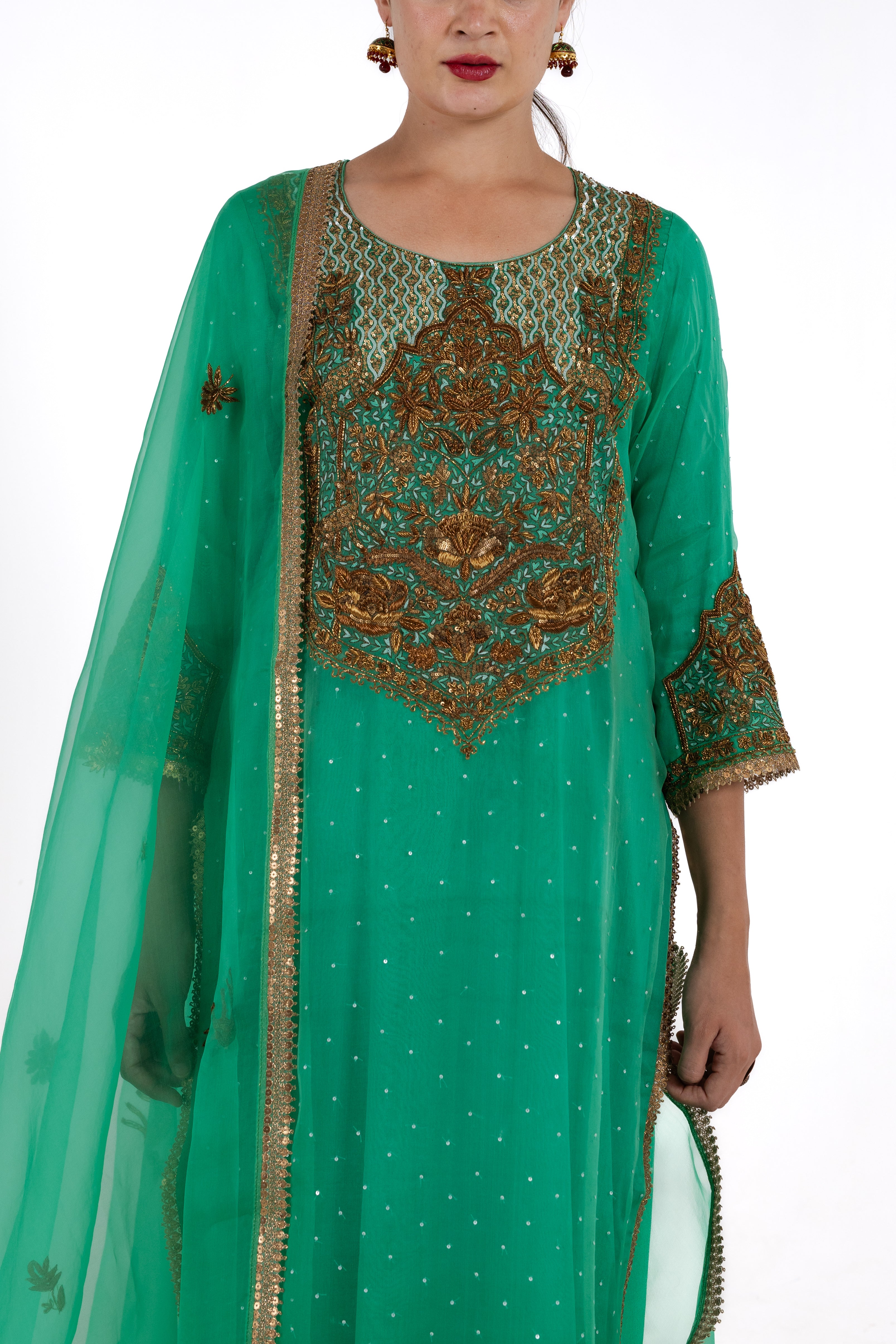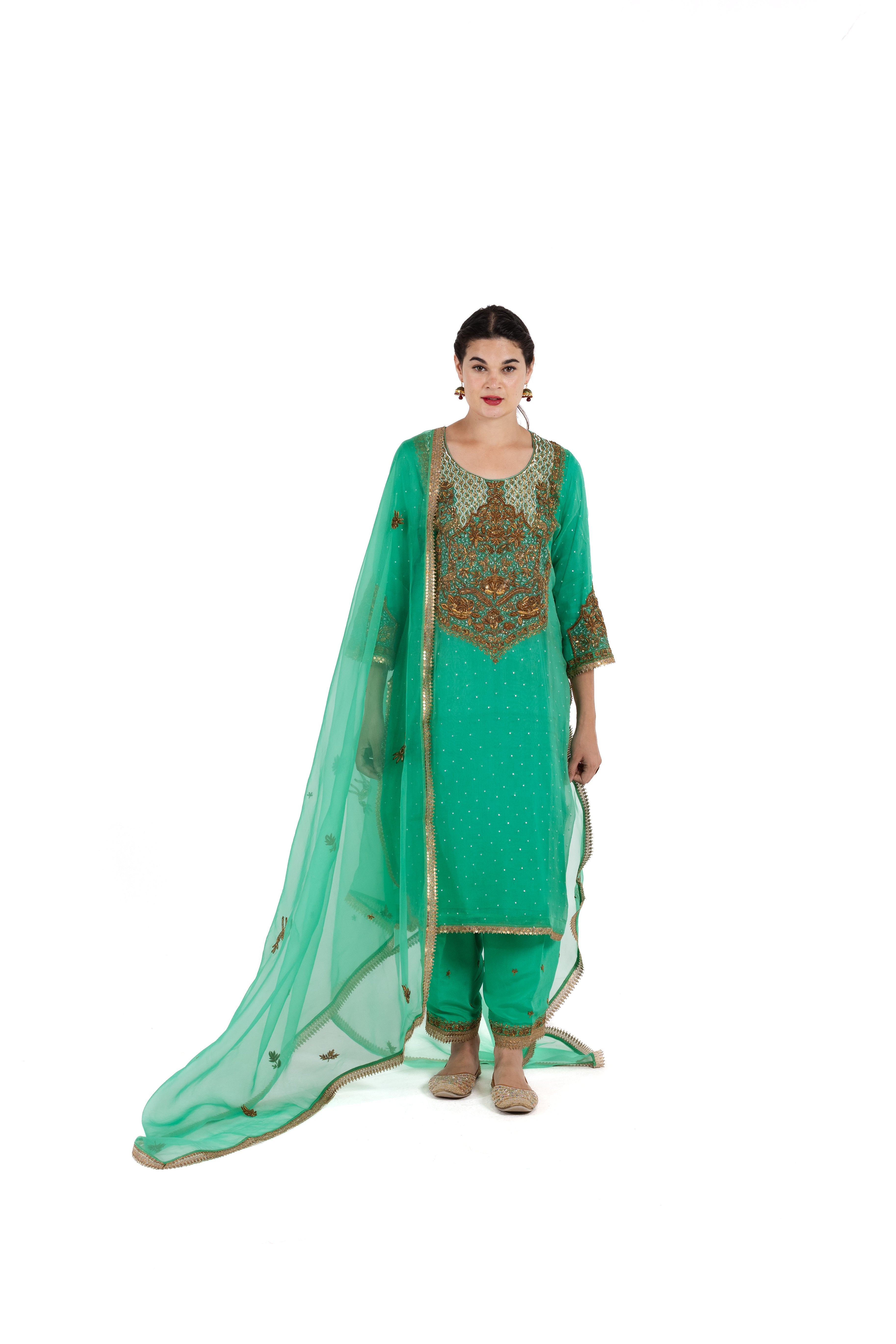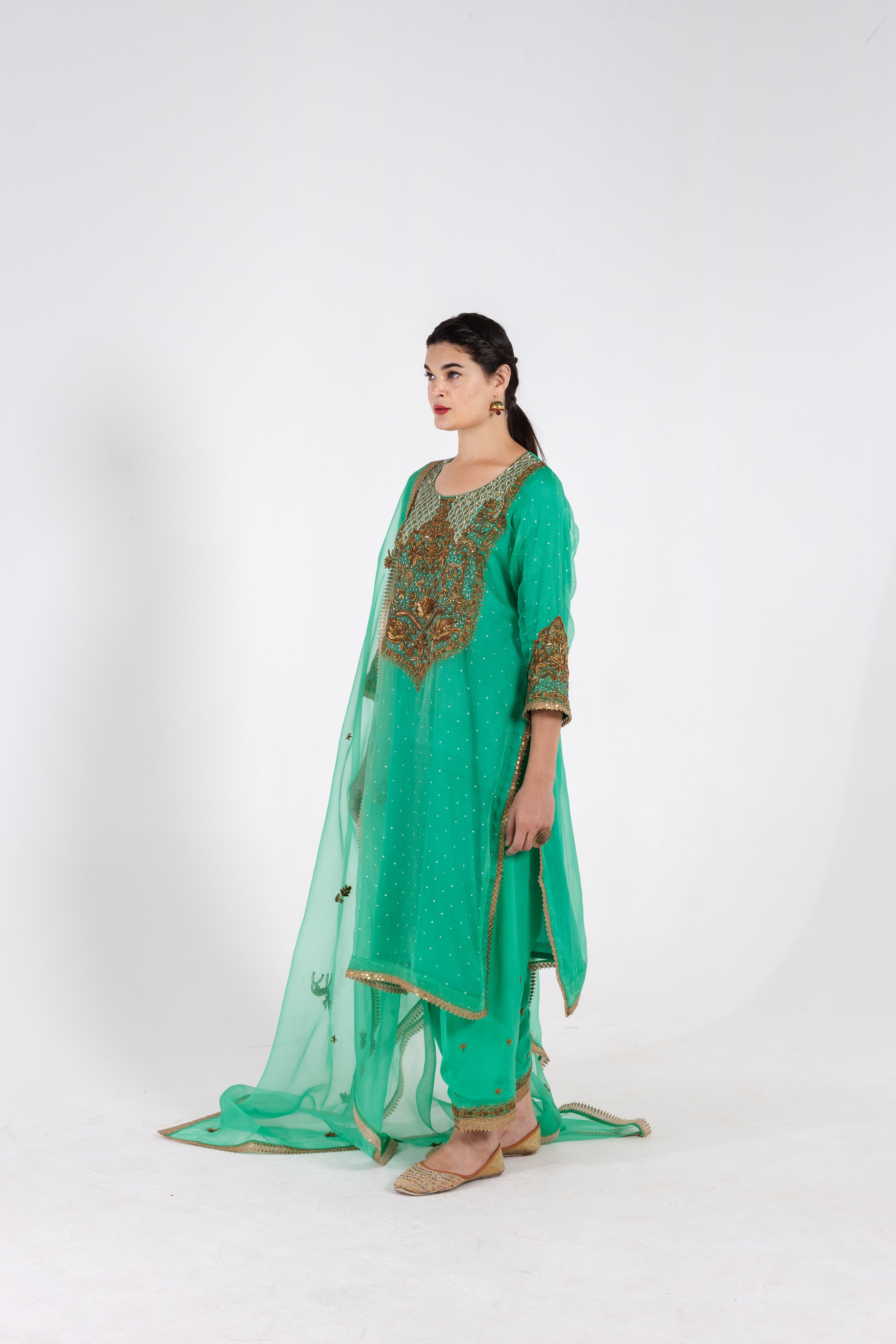 Crafted from pure organza silk, The Aisha in a refreshing aqua shade is adorned with intricate antique embroidery that graces the shirt, salwar, and dupatta. This luxurious ensemble radiates elegance, combining traditional charm with a vibrant green color that is perfect for special occasions.