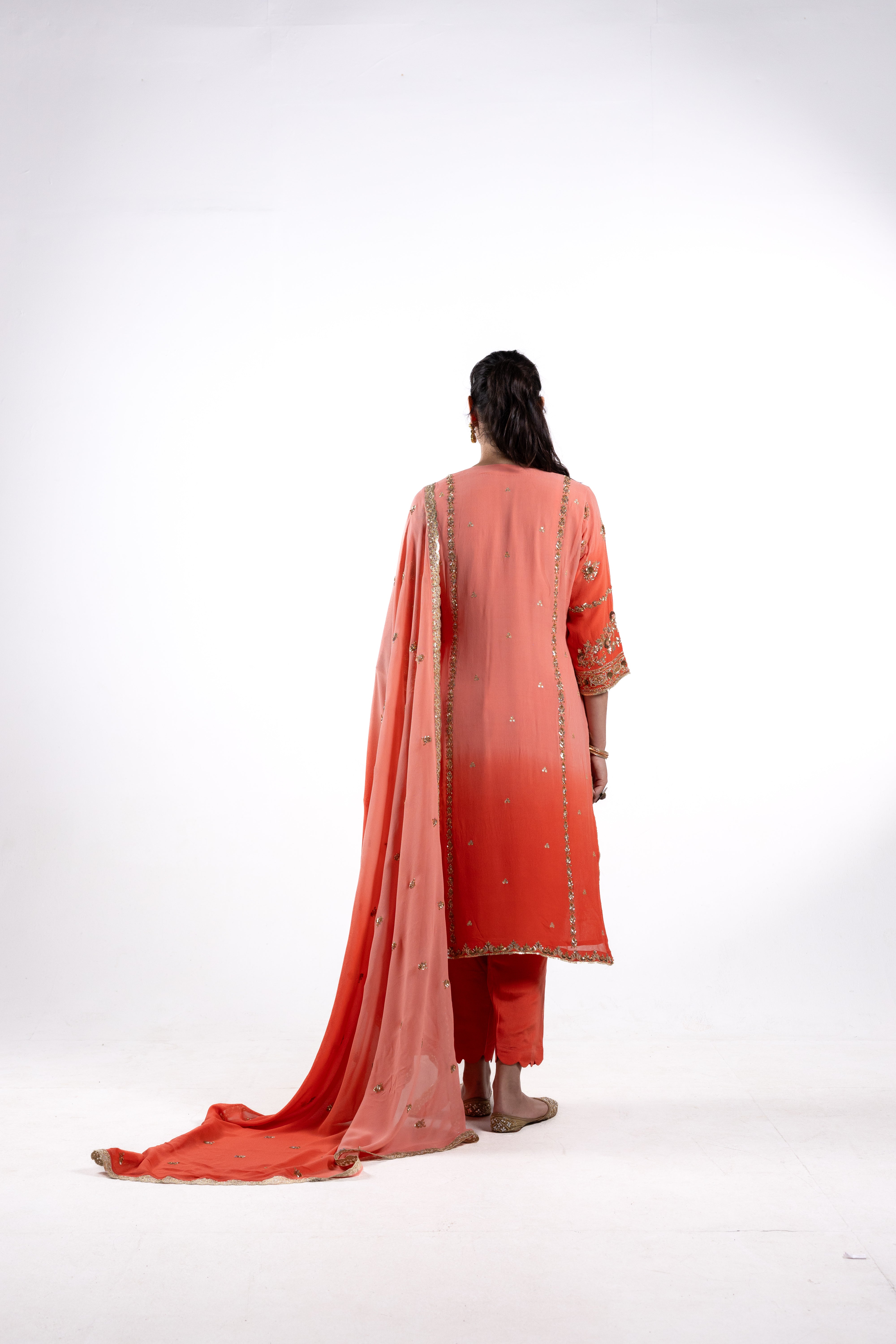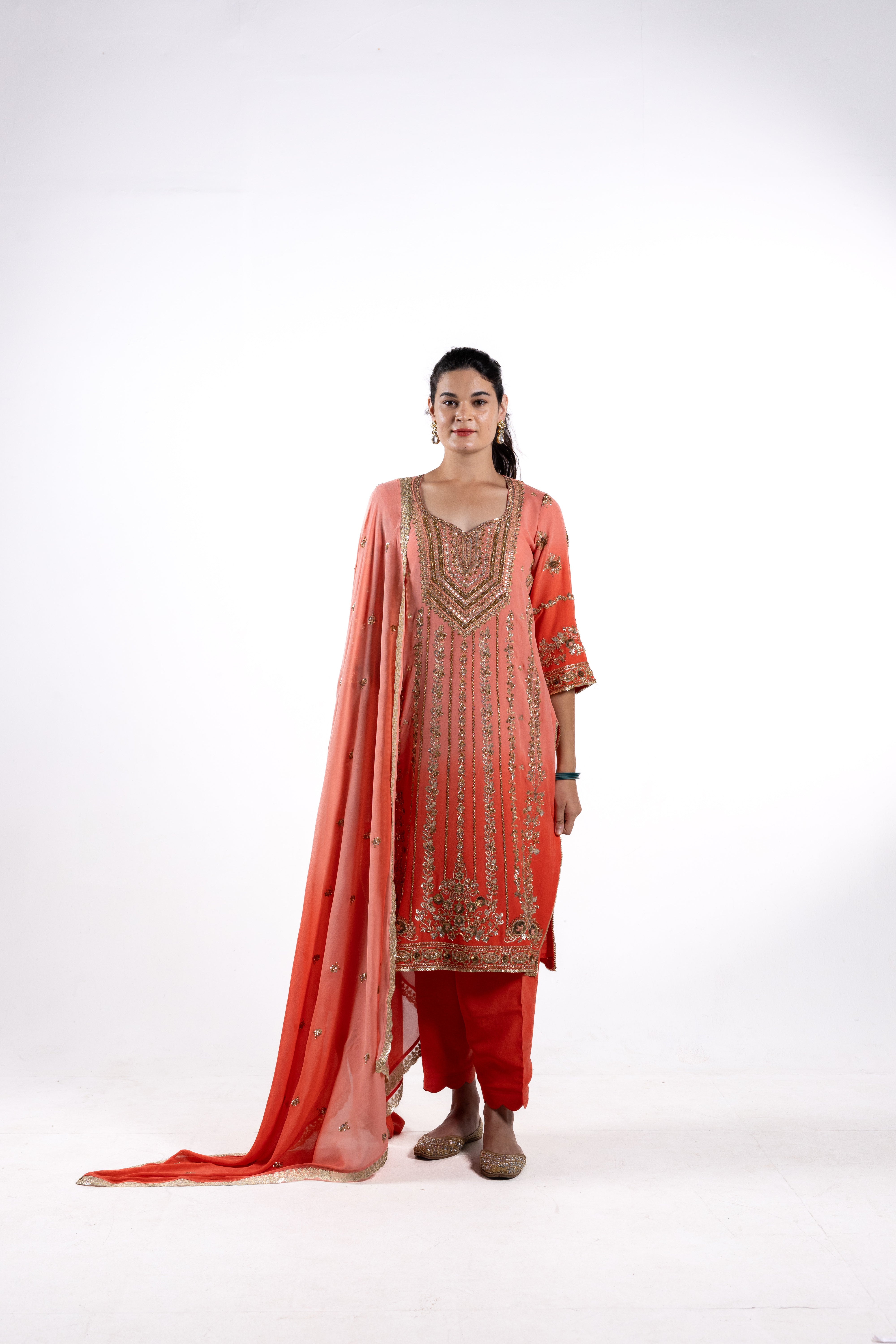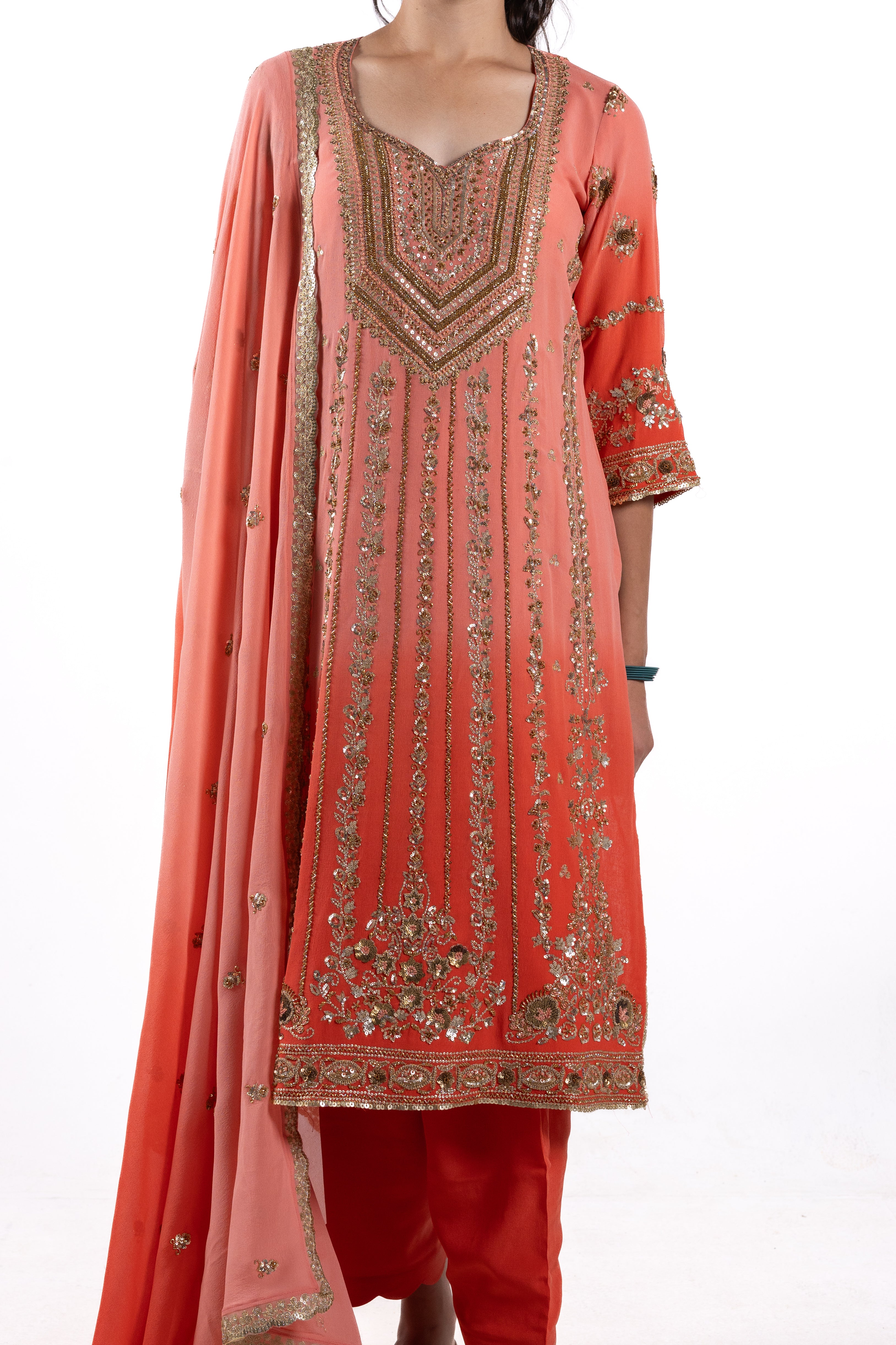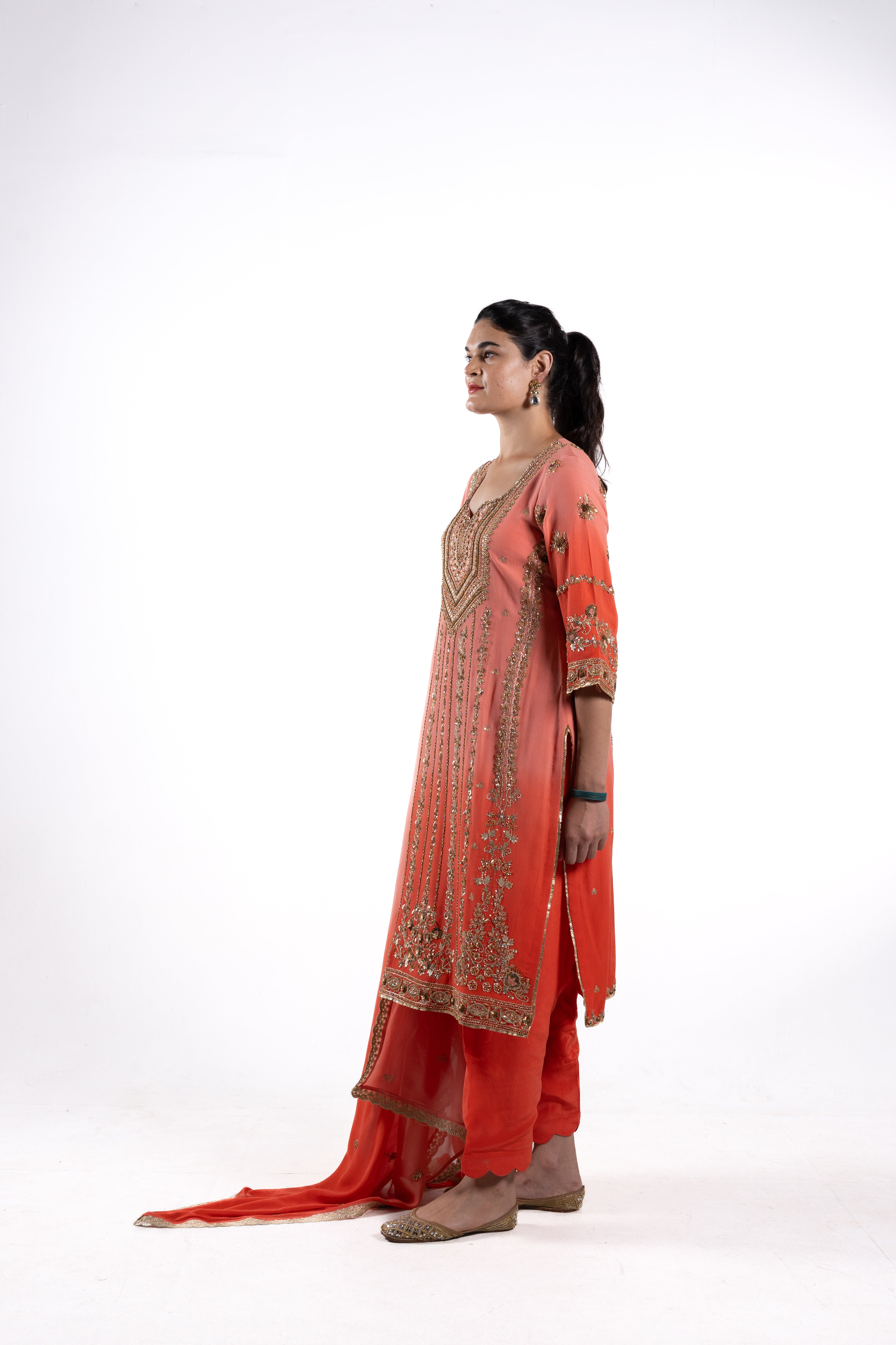 Discover the unparalleled elegance of The Mahi suit, crafted from shaded orange georgette fabric that radiates sophistication. Adorned with intricate handcrafted zardosi and sequins work, this suit captures the essence of refined beauty and meticulous craftsmanship.