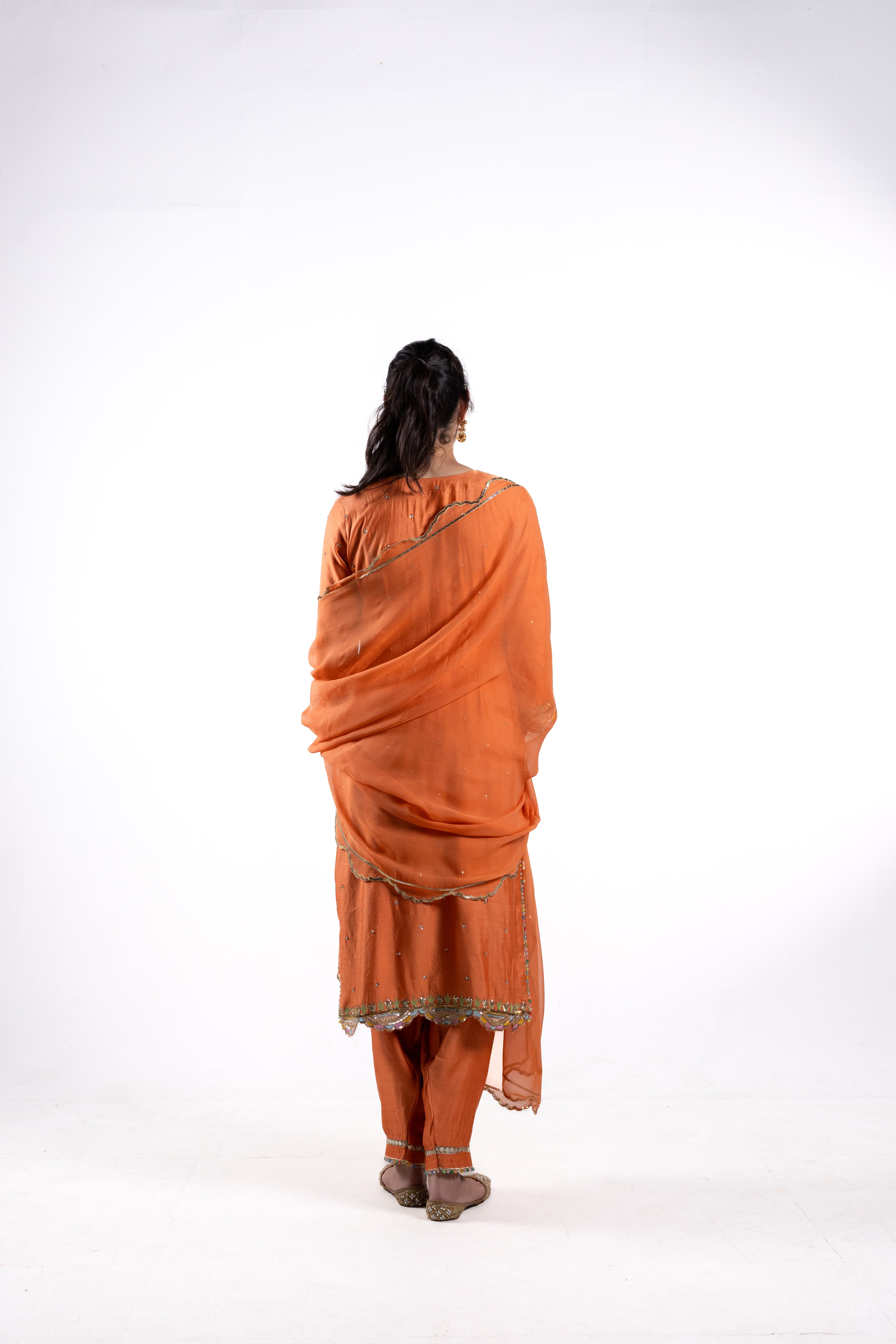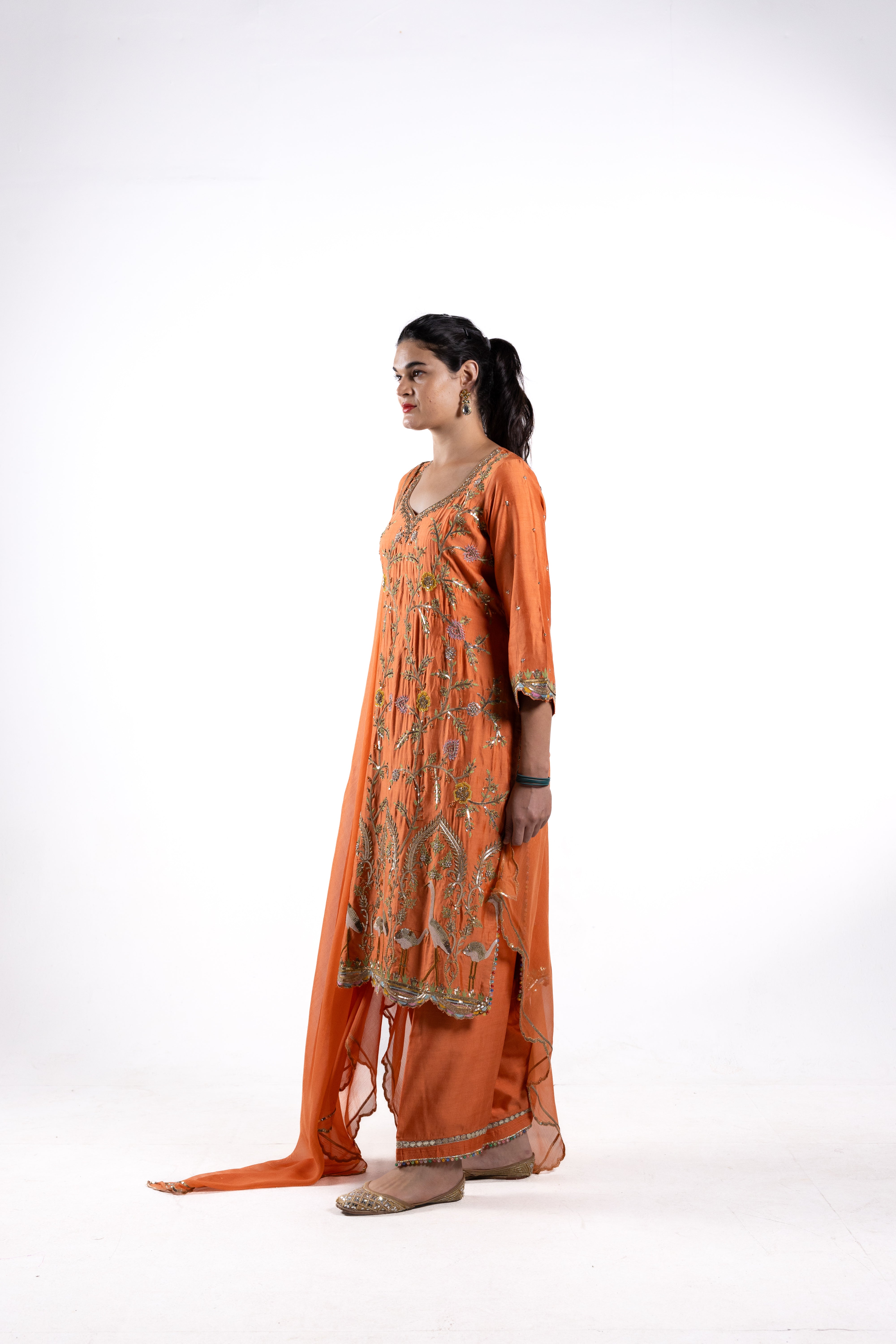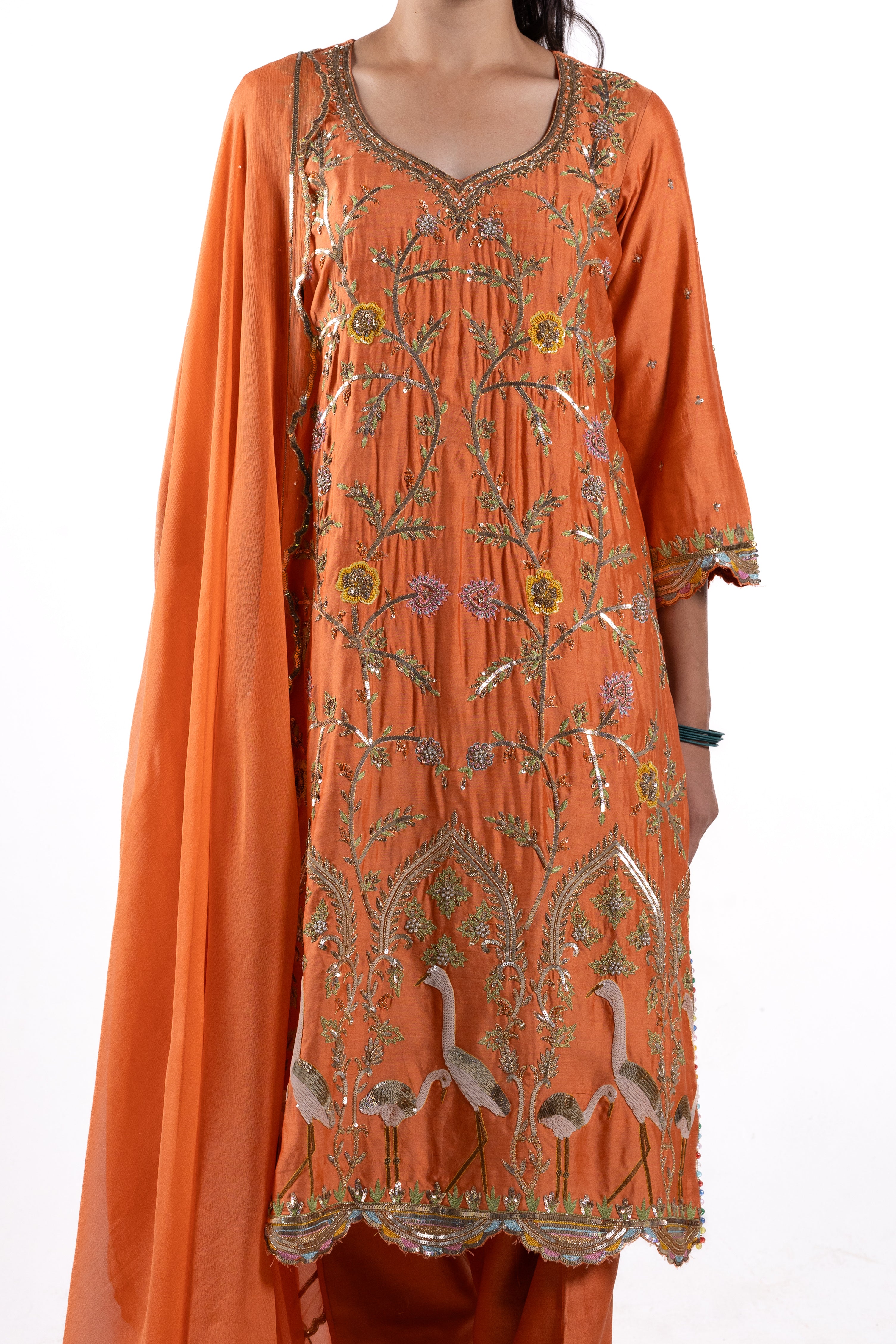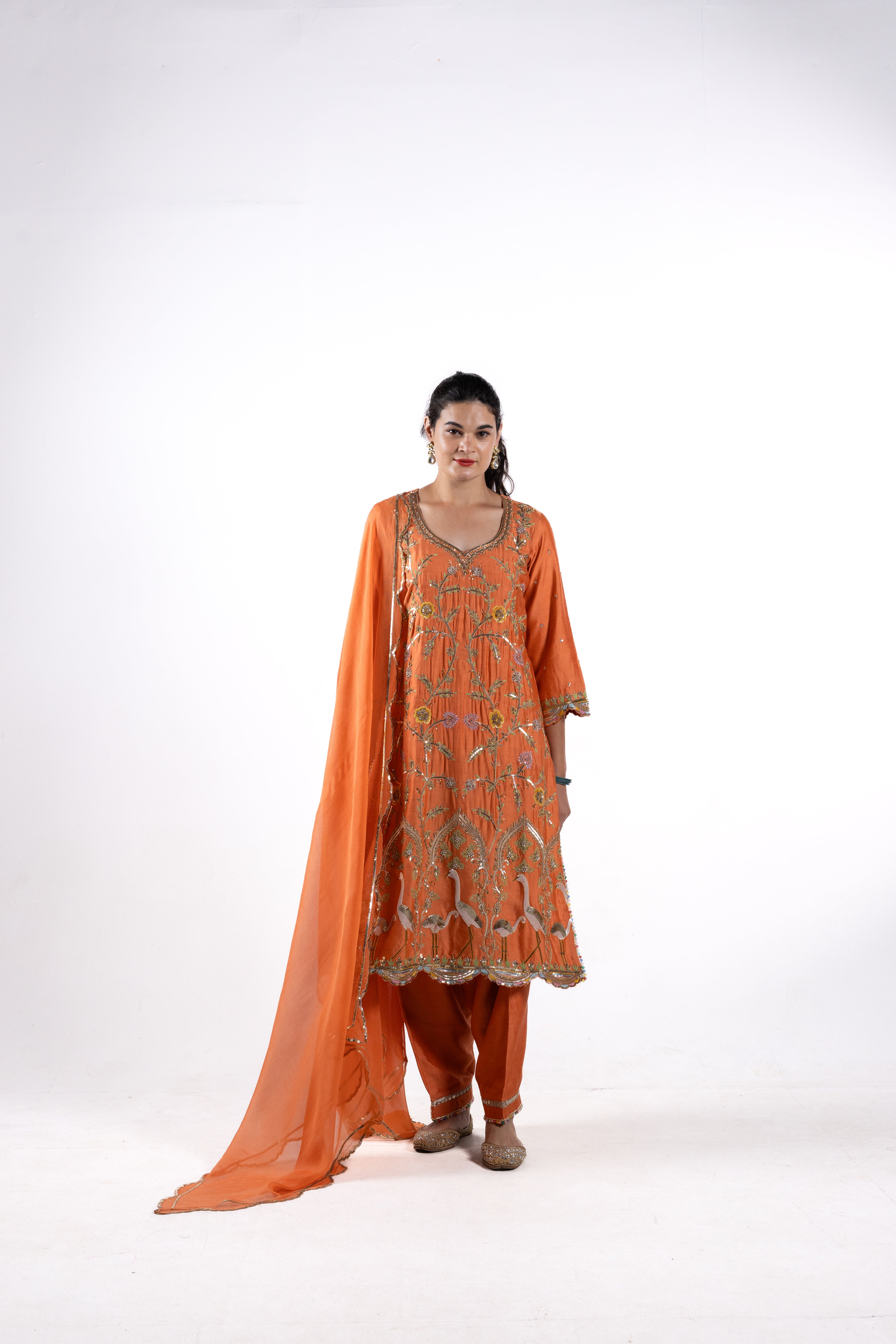 Immerse yourself in luxury with The Mitra, a pure Dupion silk suit in a rich orange hue, adorned with intricate bird motifs and jaal designs. The luxurious texture of the Dupion silk combined with the antique gold-toned embroidery exemplifies the attention to detail.
