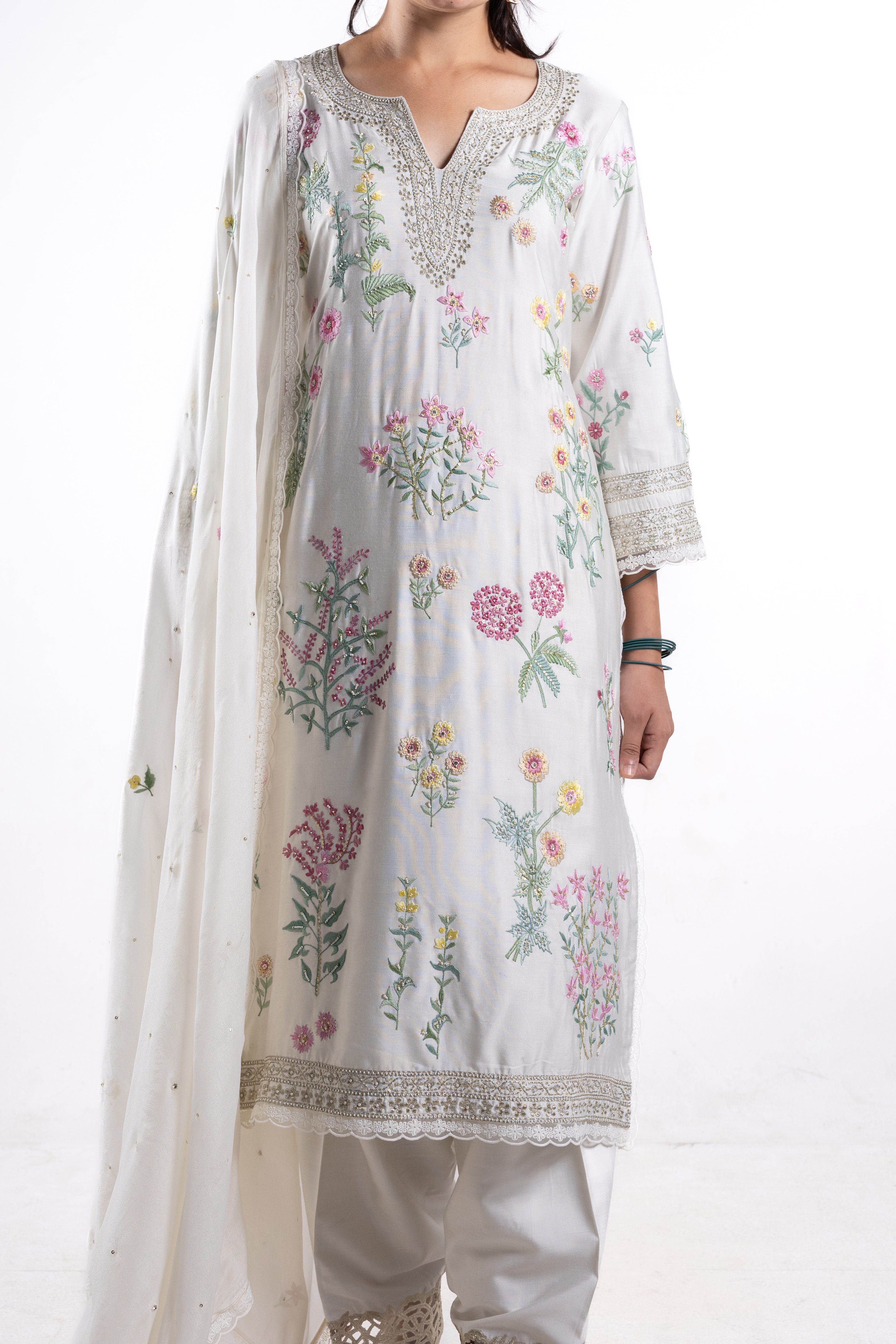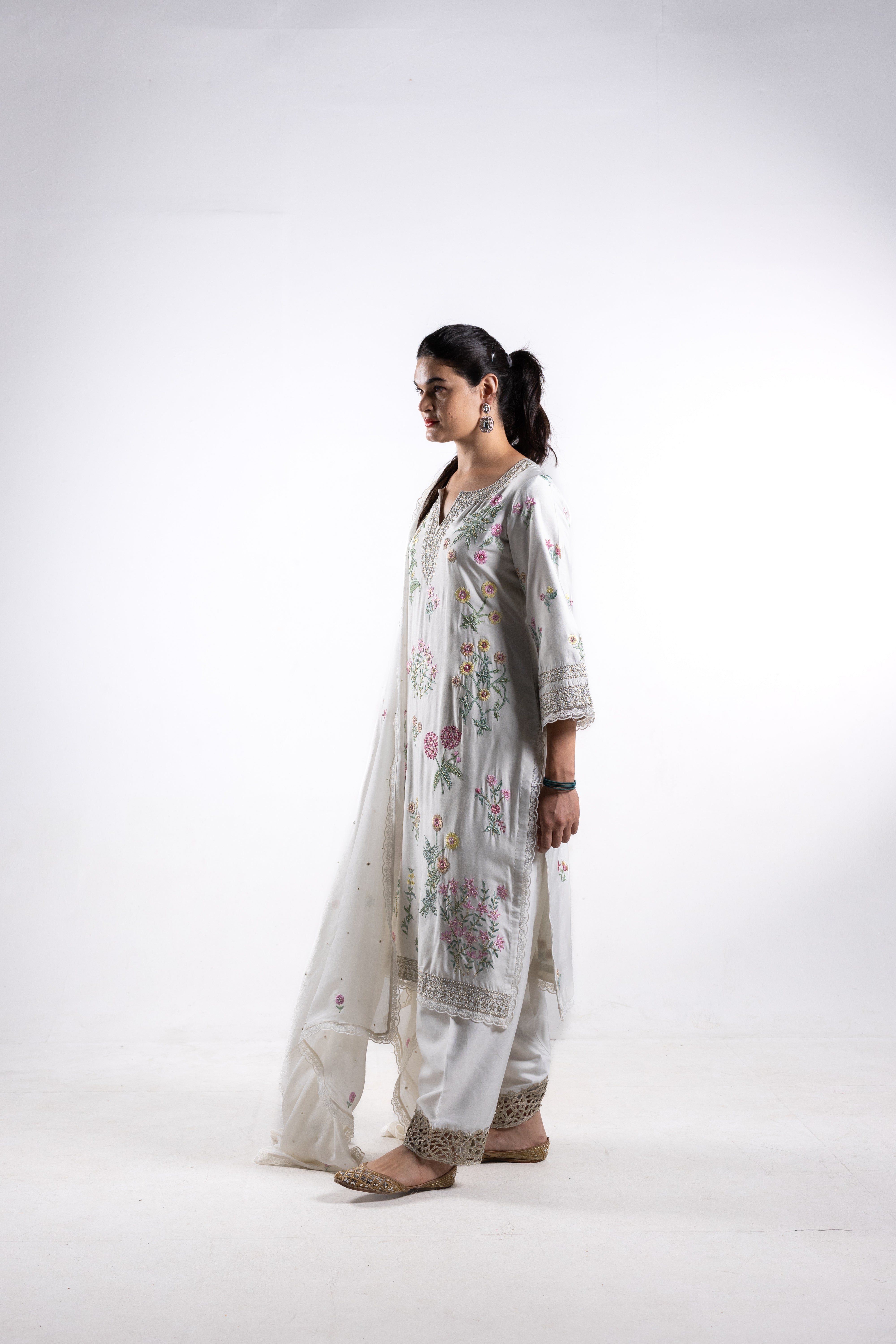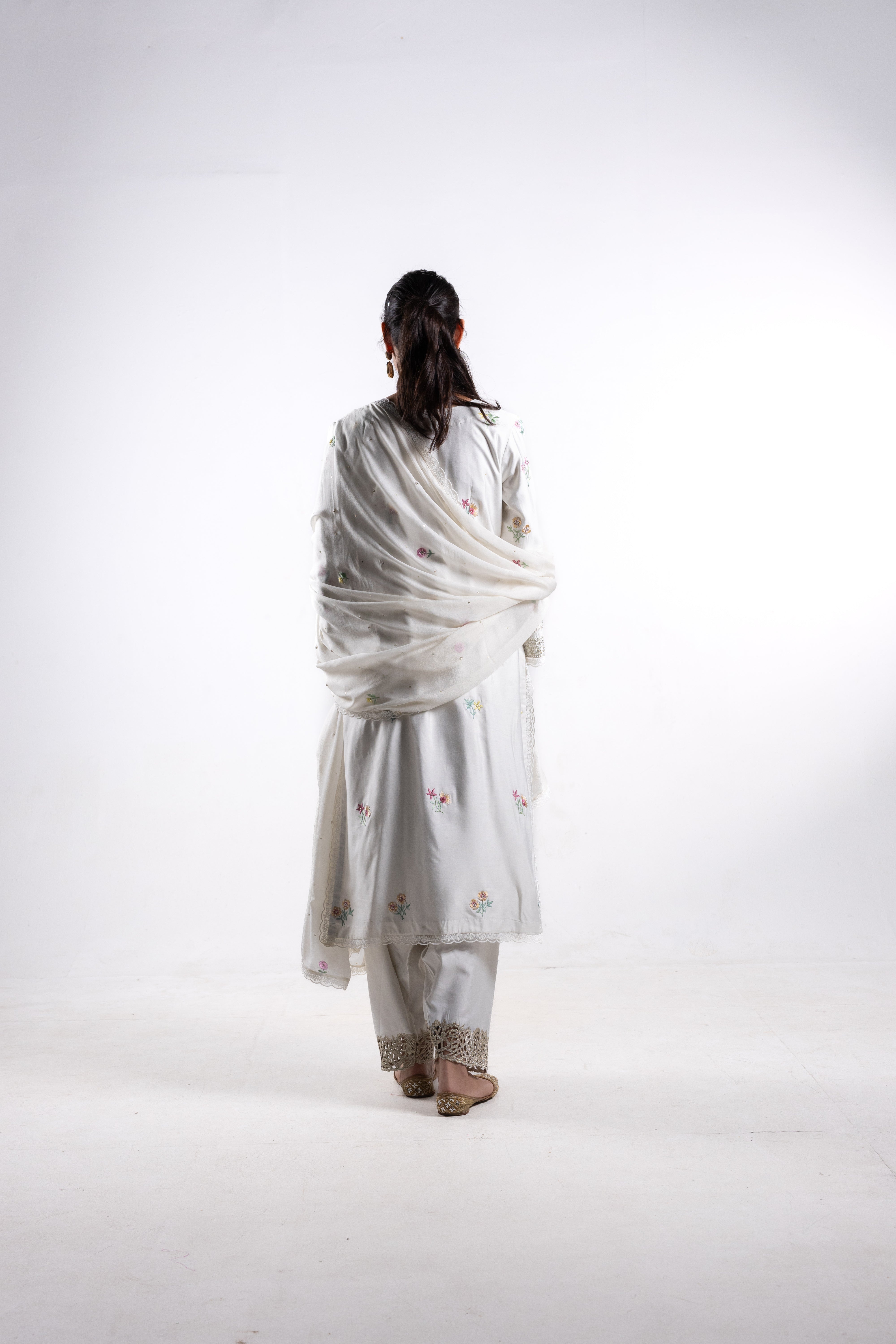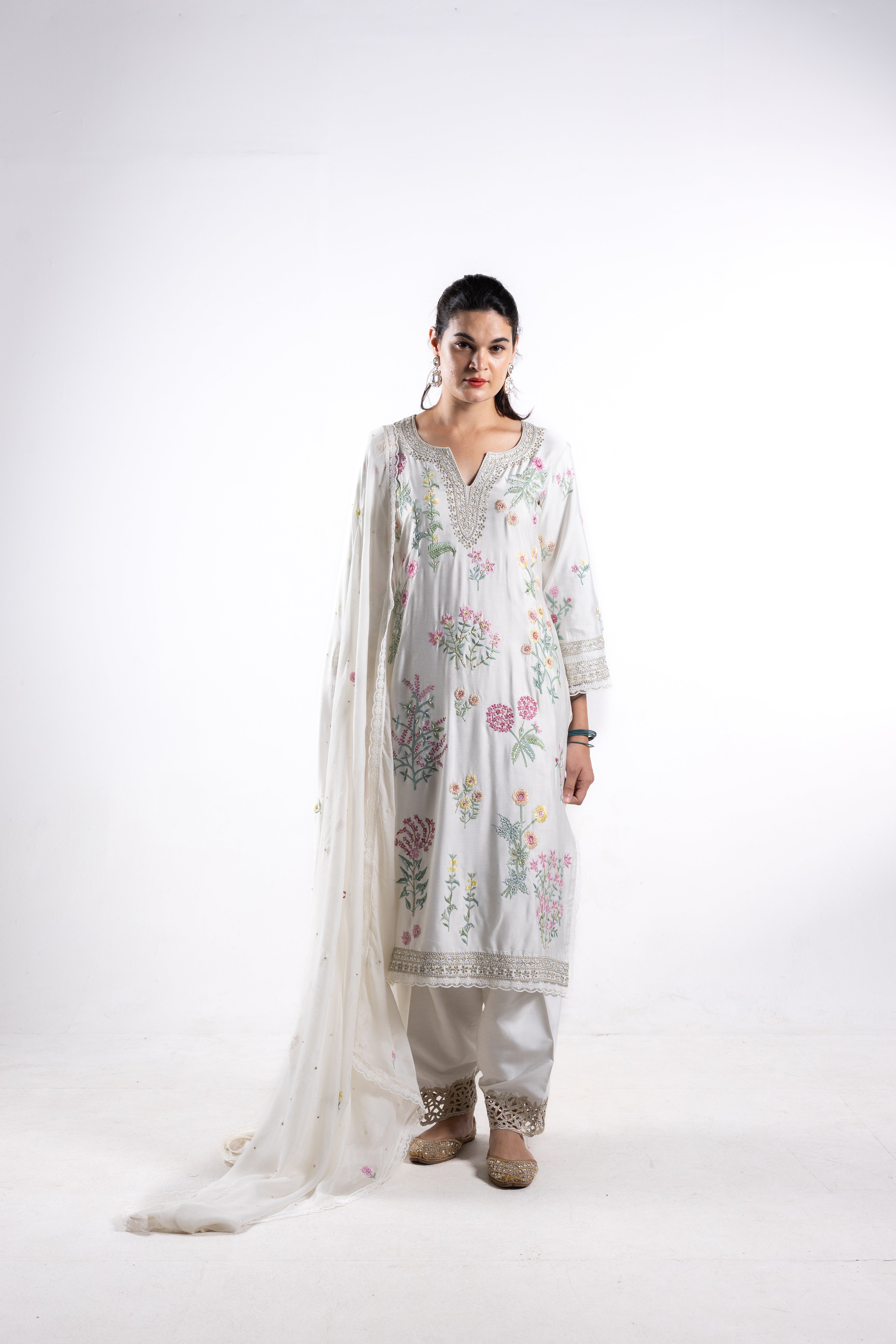 The delicate craftsmanship exudes sophistication, making Paakhi a timeless addition to your wardrobe. Elevate your ensemble and exude sophistication with the Paakhi suit, capturing both grace and style in every stitch.