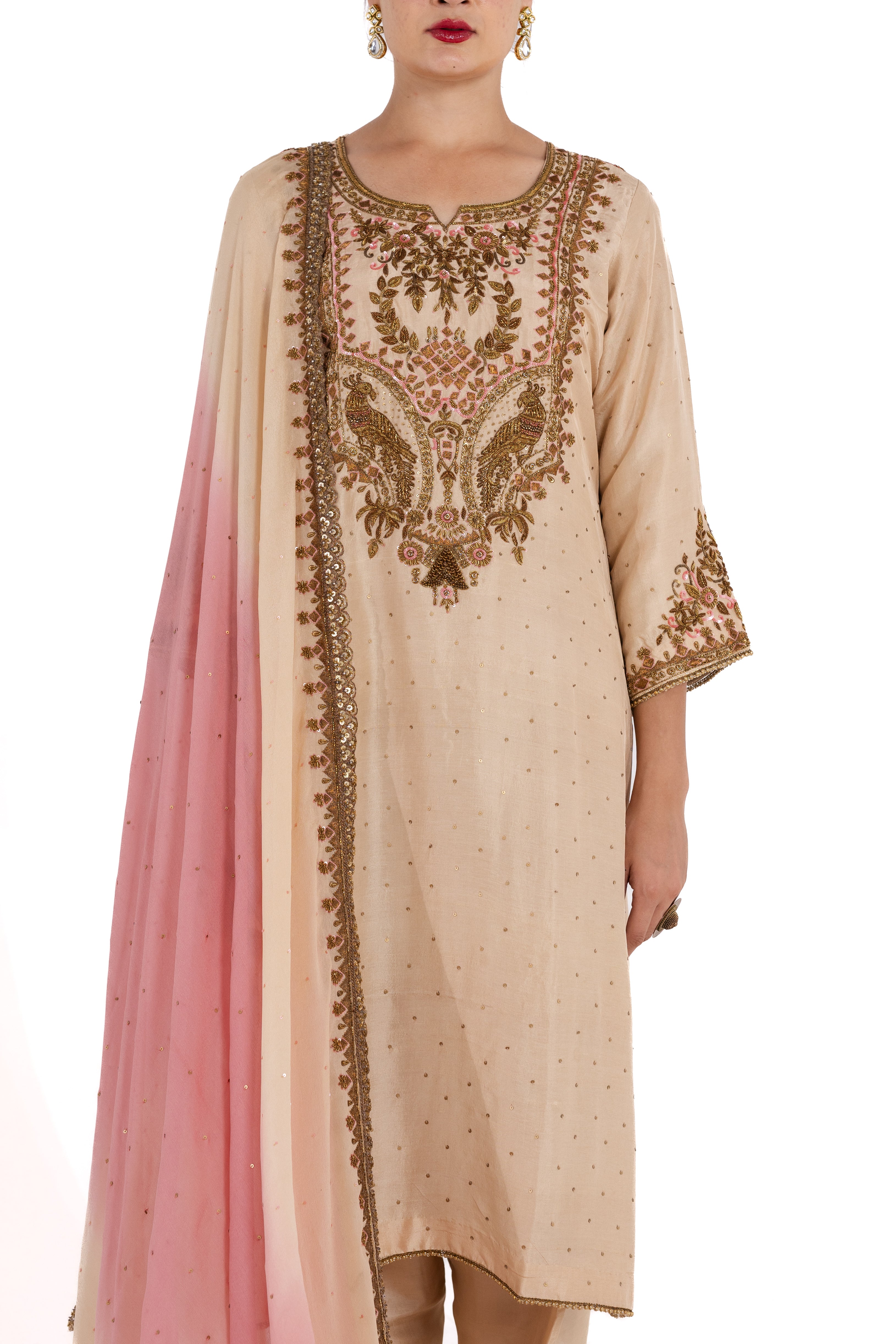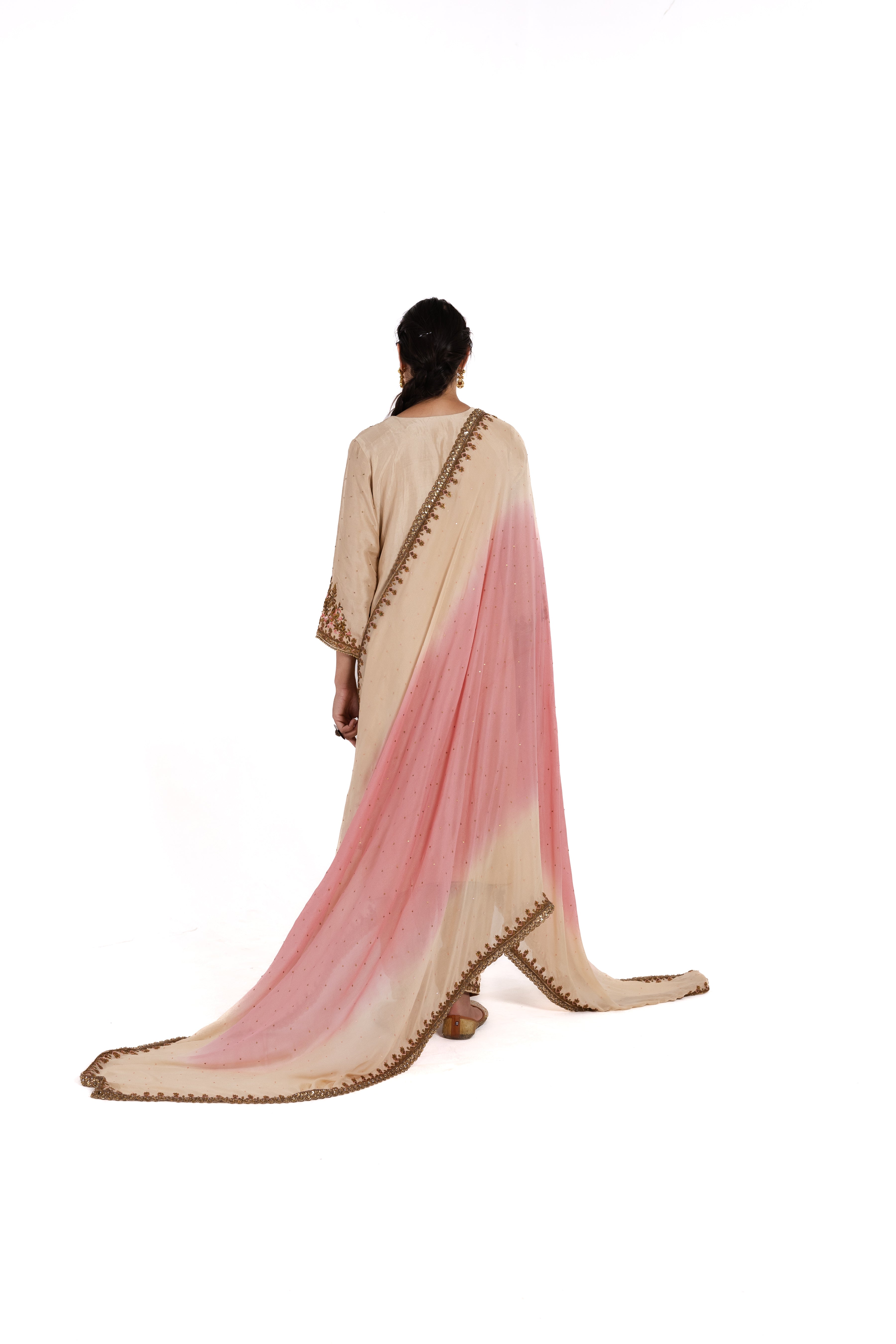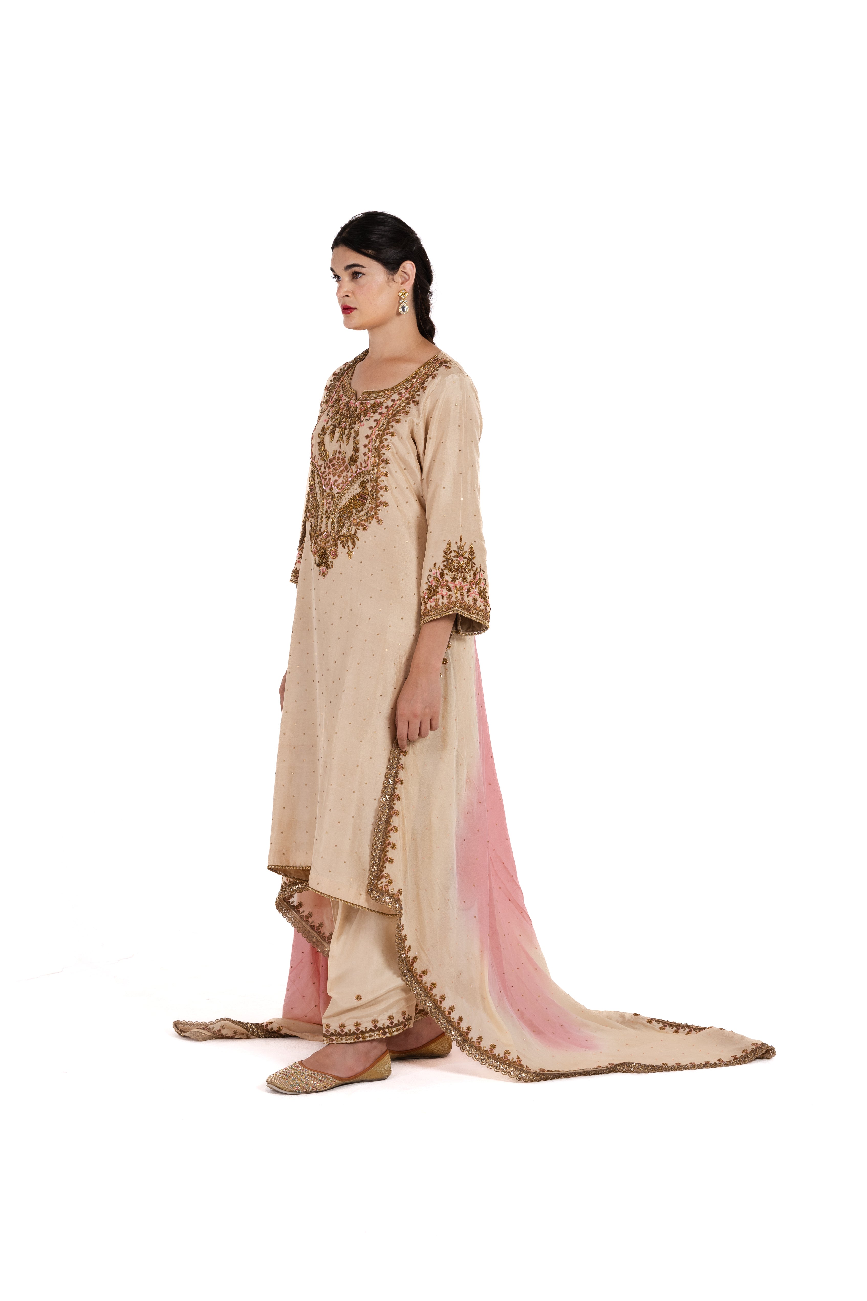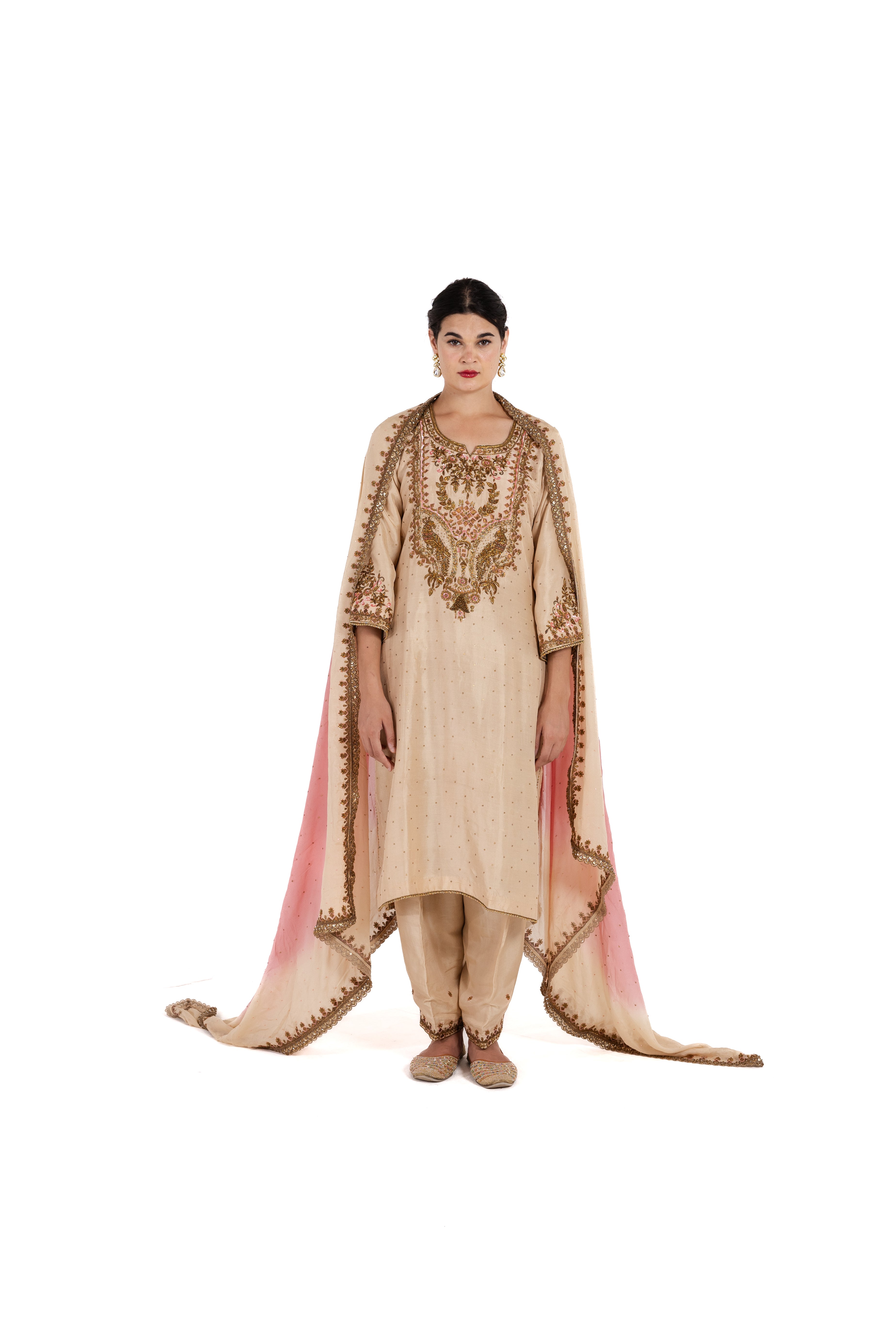Crafted from luxurious dupion silk, this suit exudes timeless beauty with its antique gold zardosi handwork that adds an opulent touch to the design. The striking pink contrast dupatta, adorned with intricate four-side embroidery, perfectly complements the subtle tones of the suit, enhancing its sophistication.