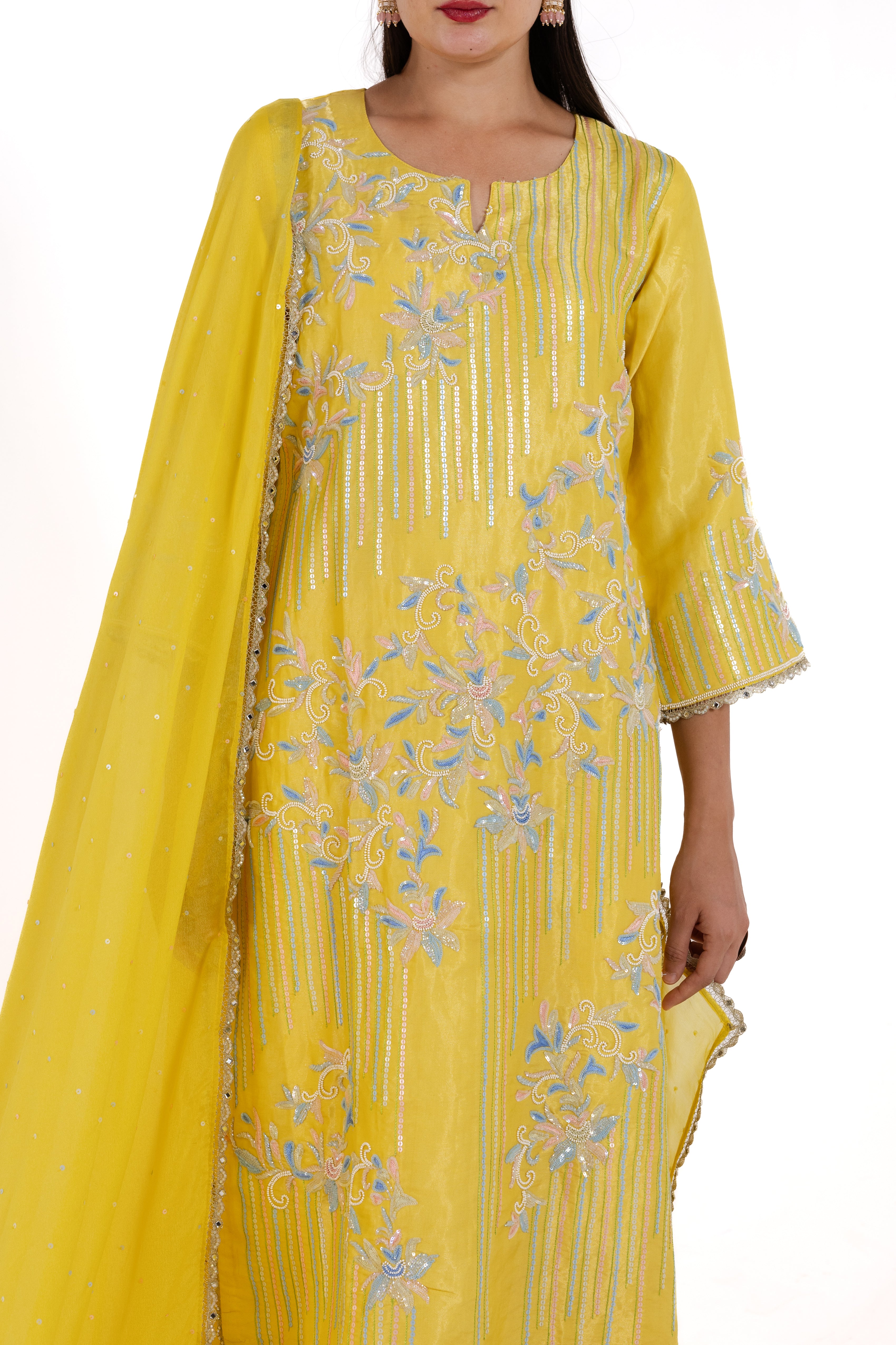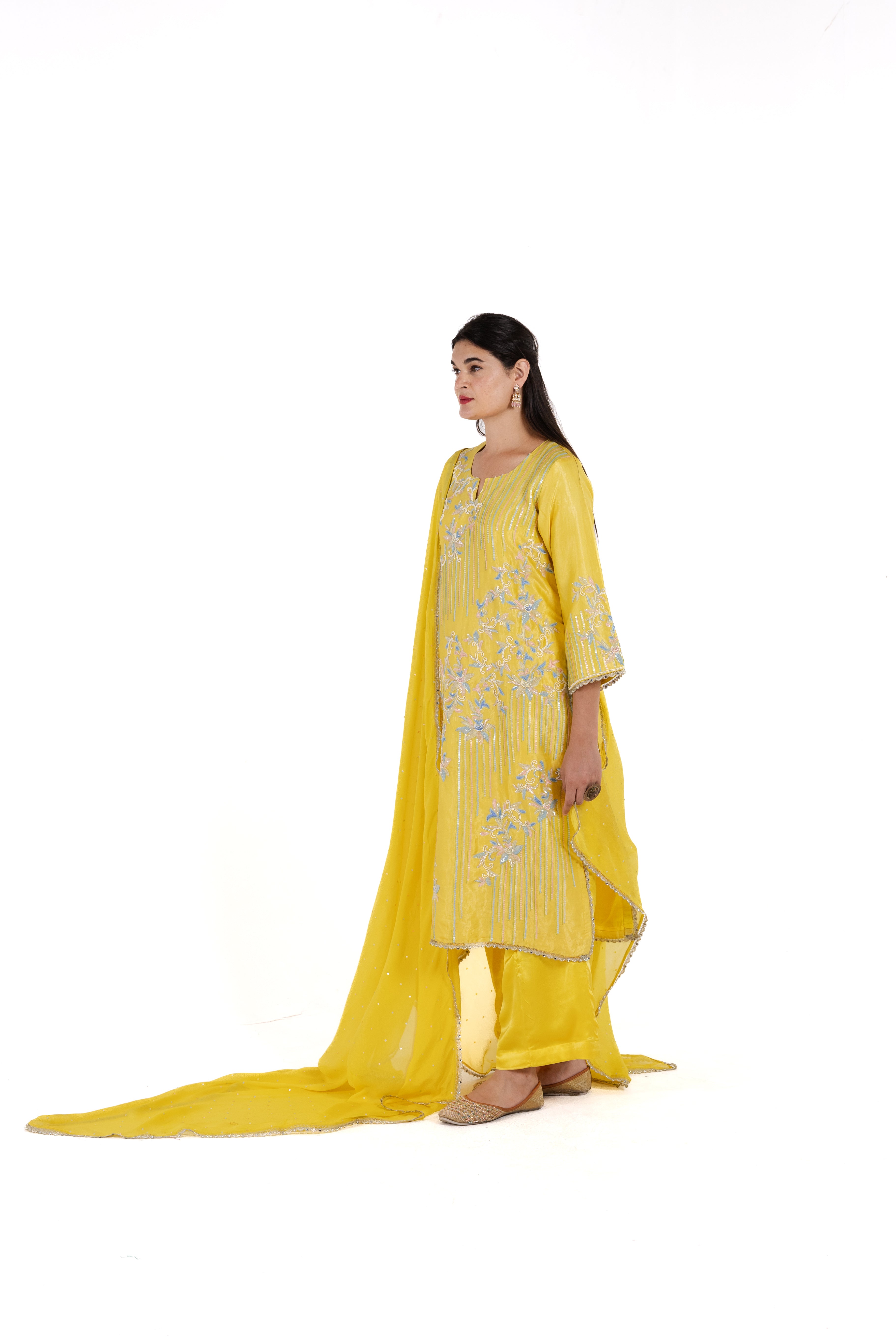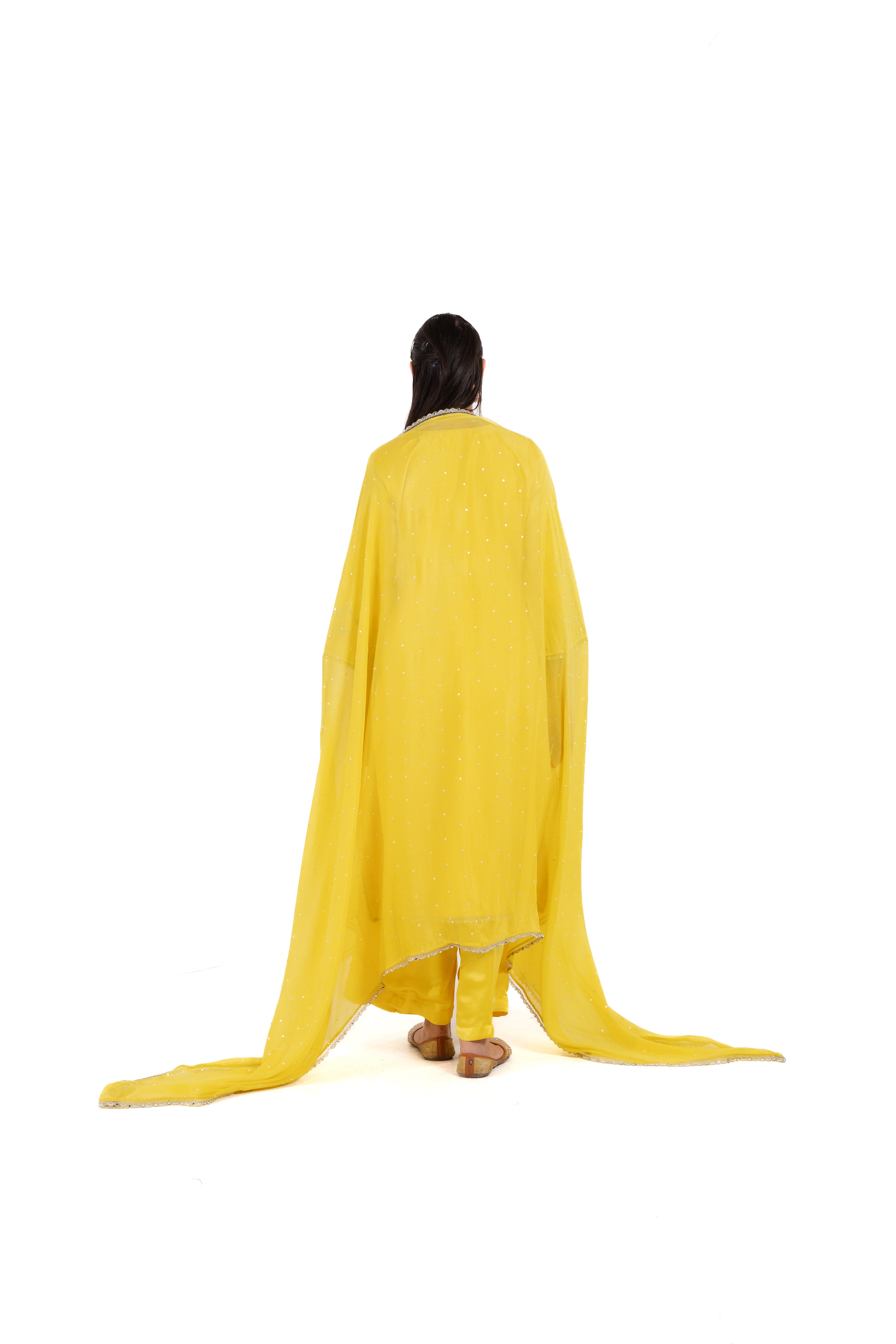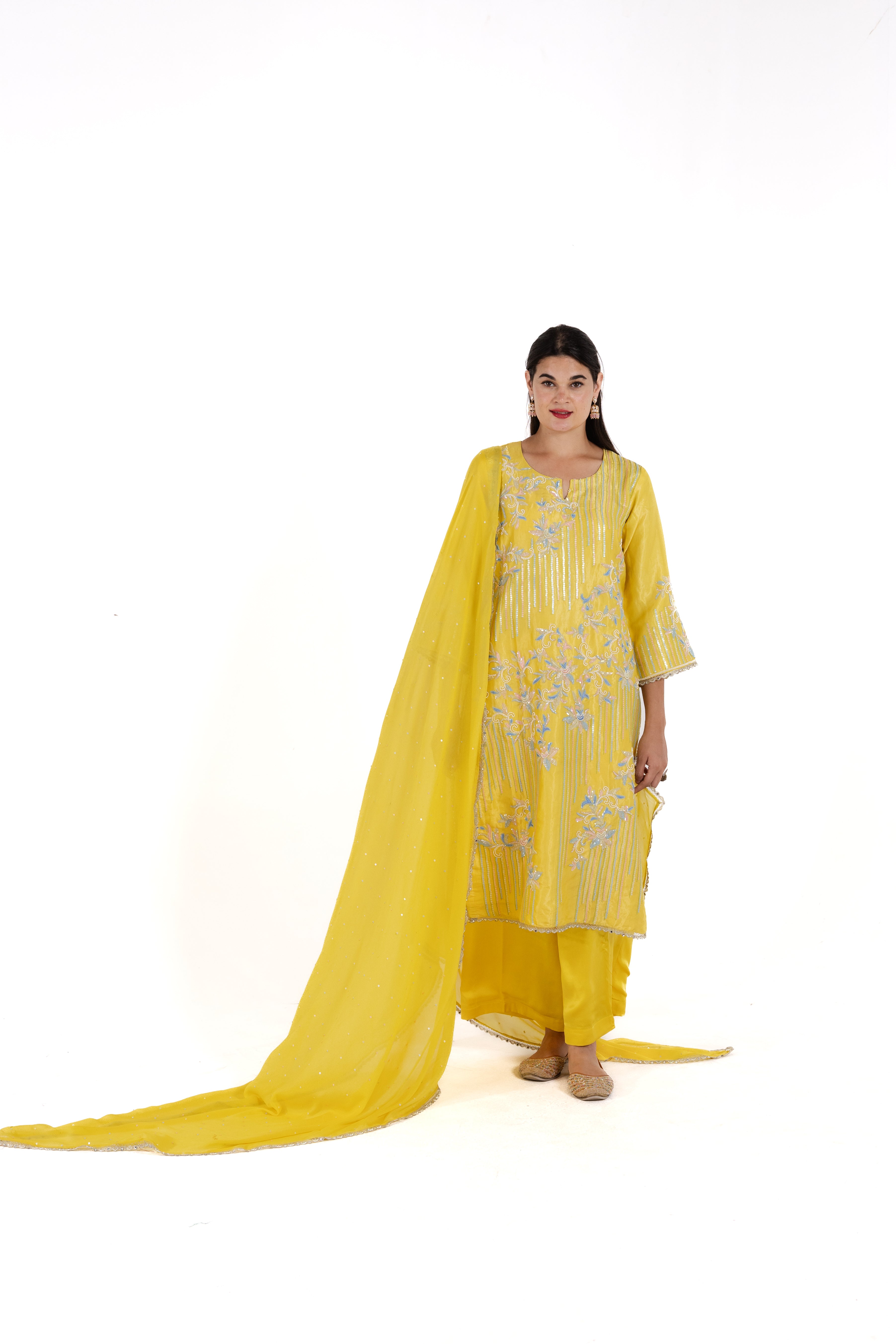 Introducing Sofia, a striking suit in vibrant golden-yellow pure tissue satin silk, adorned with exquisite handwork that draws inspiration from traditional artistry. The warm yellow hue, reminiscent of radiant sunsets, brings a touch of sunshine to your ensemble, making it perfect for festive gatherings and special occasions.