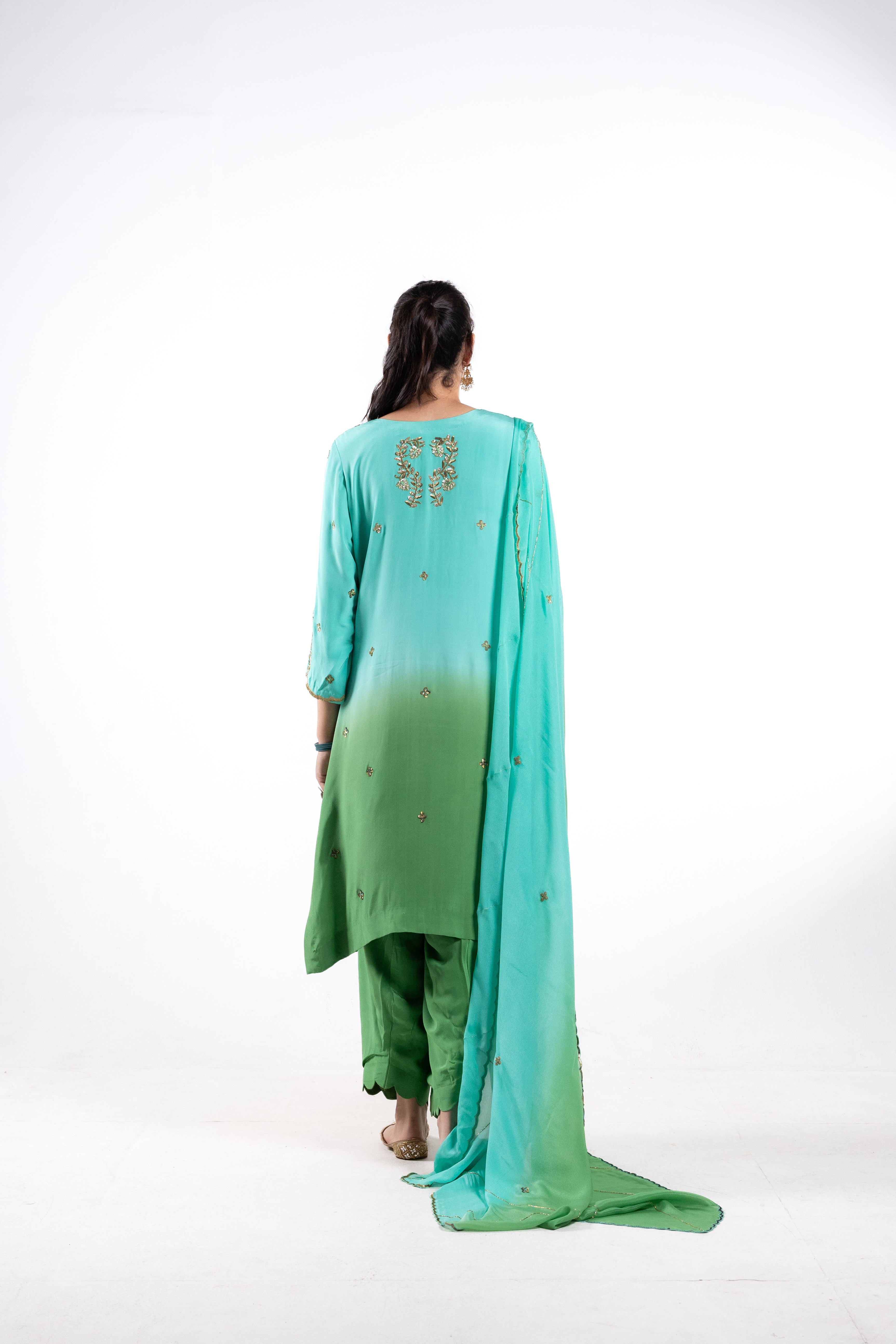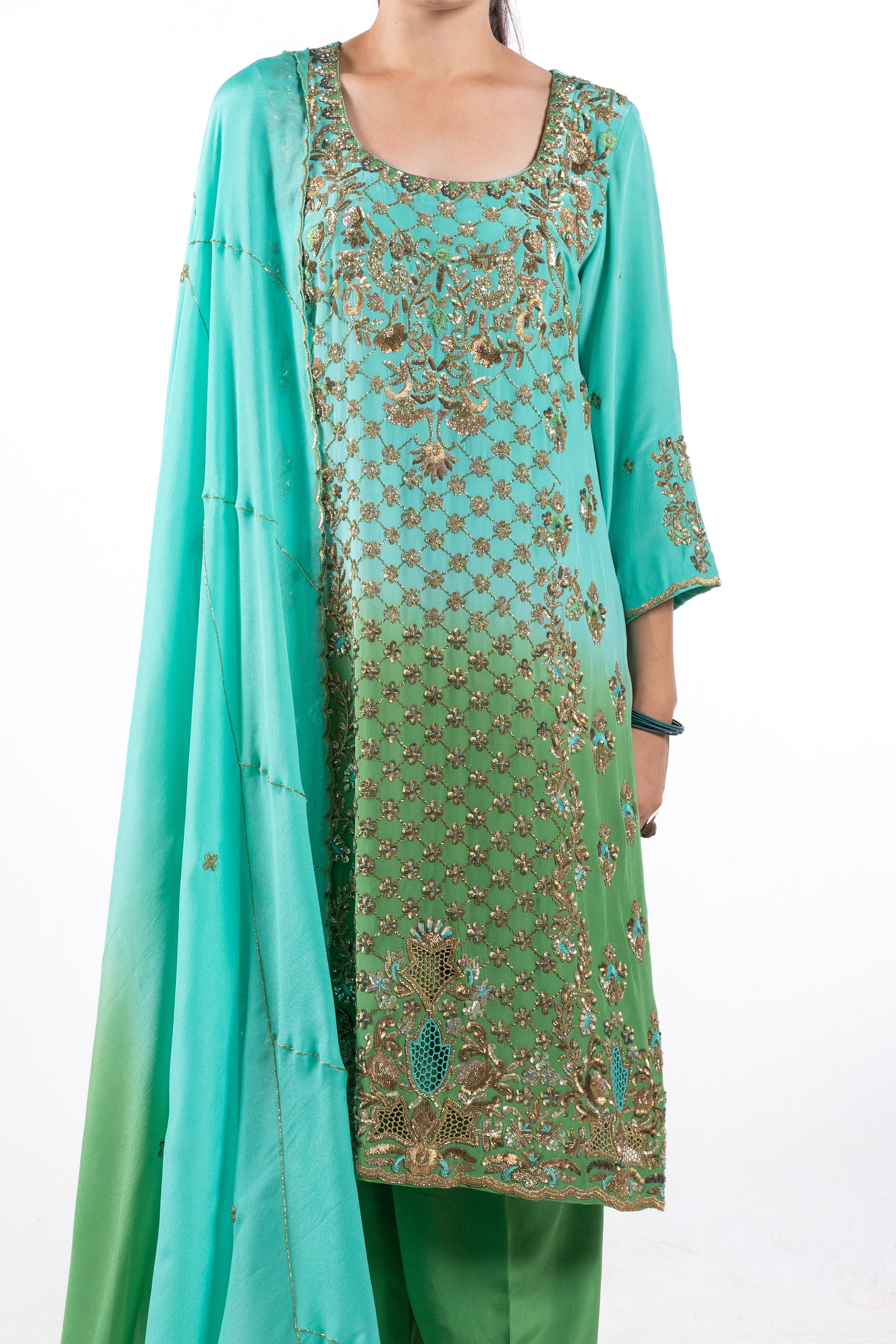 The vibrant double-shade dupatta perfectly complements the suit, enhancing its sophisticated appeal. Make a statement of style and grace with Urmila, a versatile ensemble that combines tradition with modern allure.
